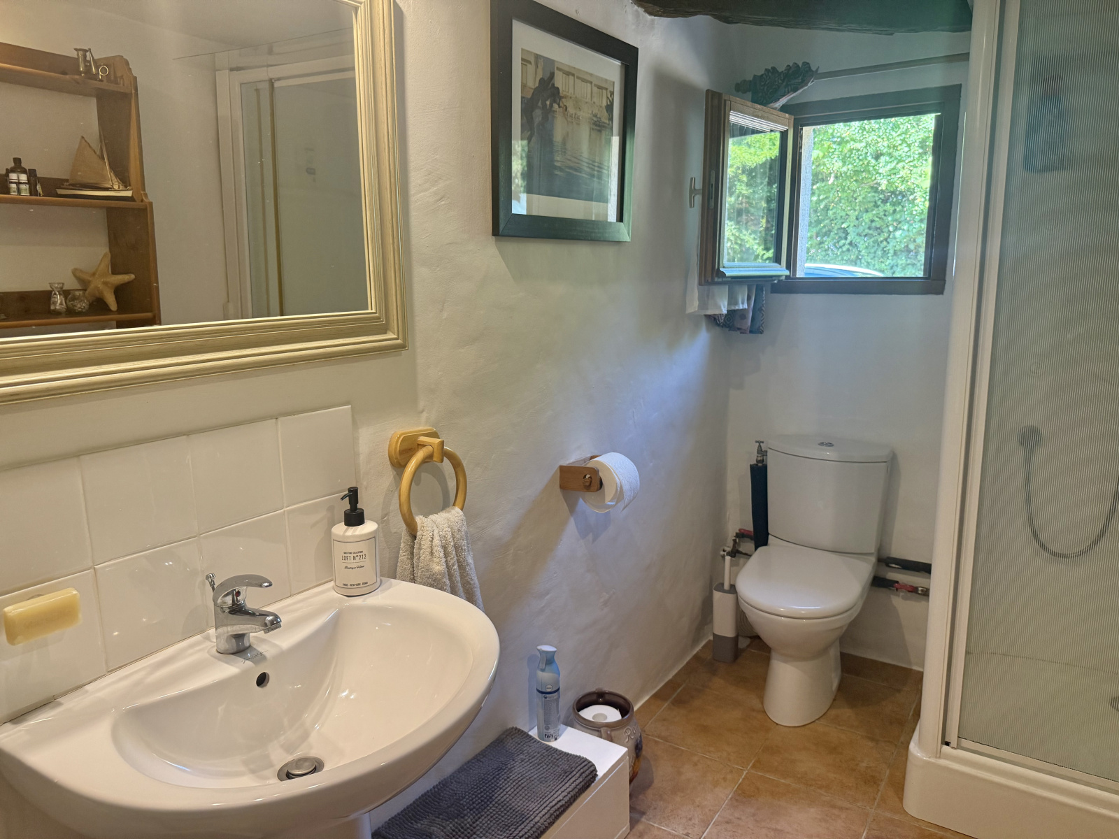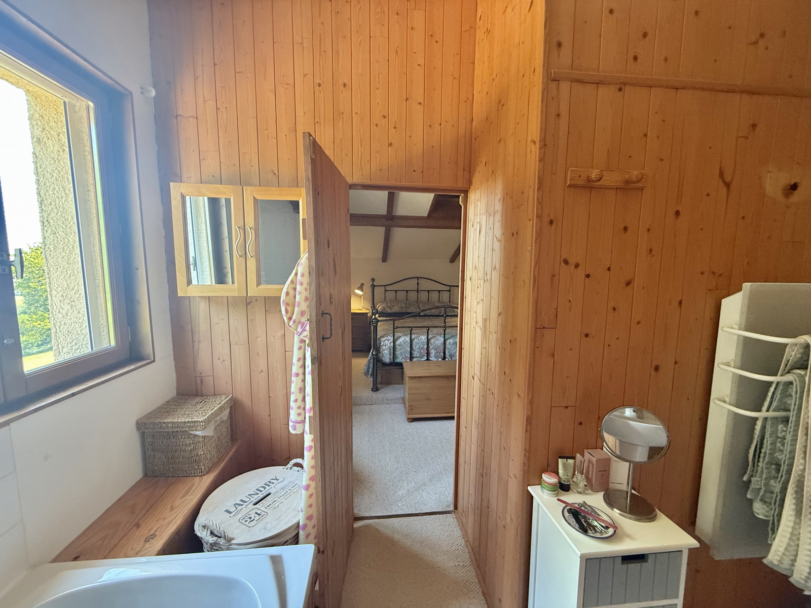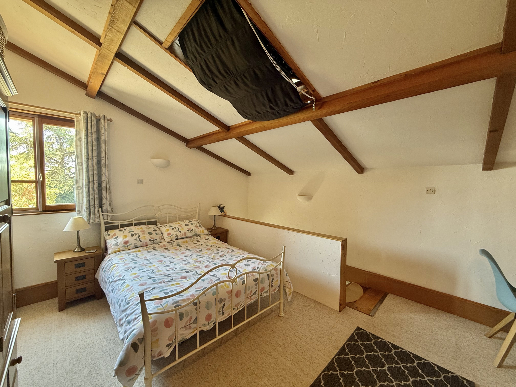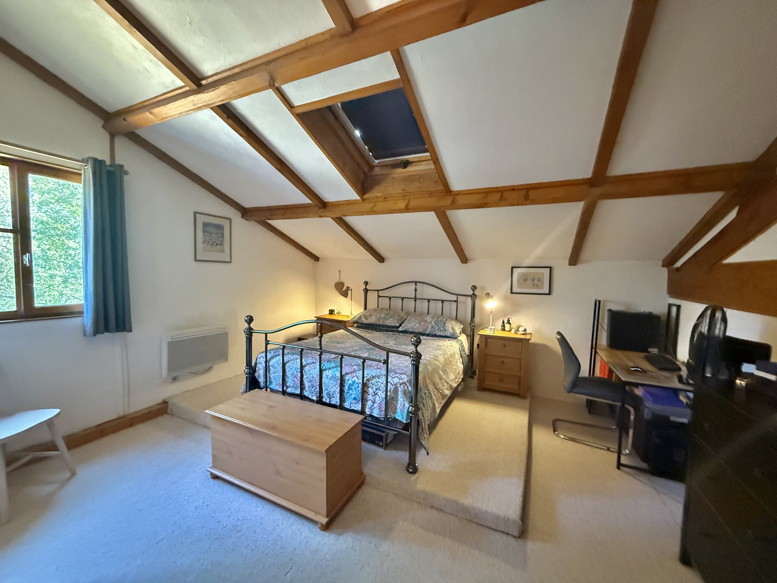 Le rez-de-chaussée s’ouvre sur un hall d’entrée accueillant avec porte écurie et escalier, menant à une salle d’eau avec WC ainsi qu’à une cuisine entièrement équipée, baignée de lumière grâce à ses fenêtres à double exposition. Le salon spacieux dispose de portes-fenêtres donnant sur la terrasse et bénéficie de la chaleur de l’insert. À l’étage, la chambre principale, avec ses poutres apparentes et ses grandes fenêtres offrant une vue dégagée, dispose d’une salle de bain attenante avec baignoire, lavabo, bidet et WC. Un palier sert actuellement de deuxième chambre, tandis que la troisième chambre profite également de belles dimensions et d’une luminosité généreuse.