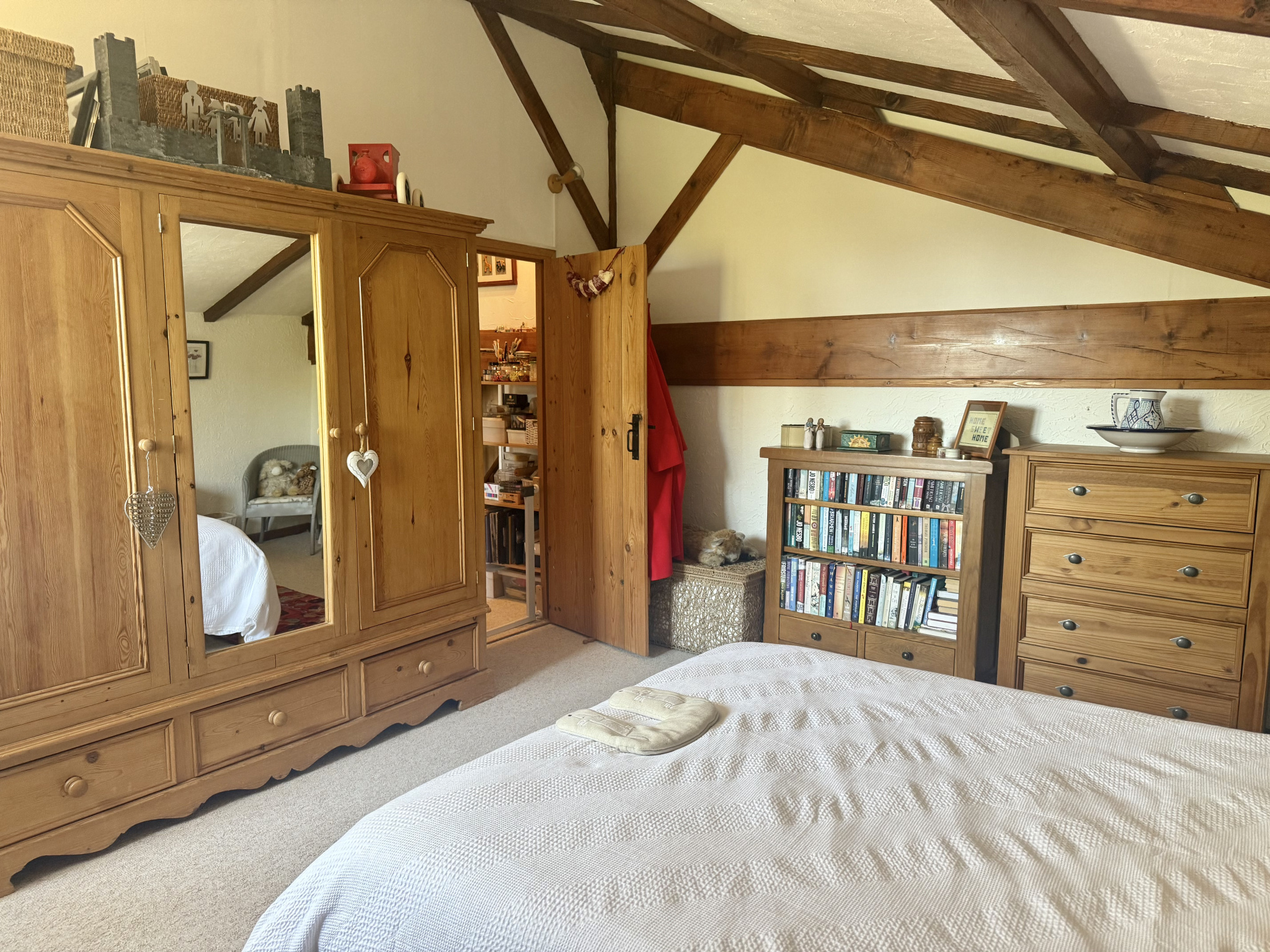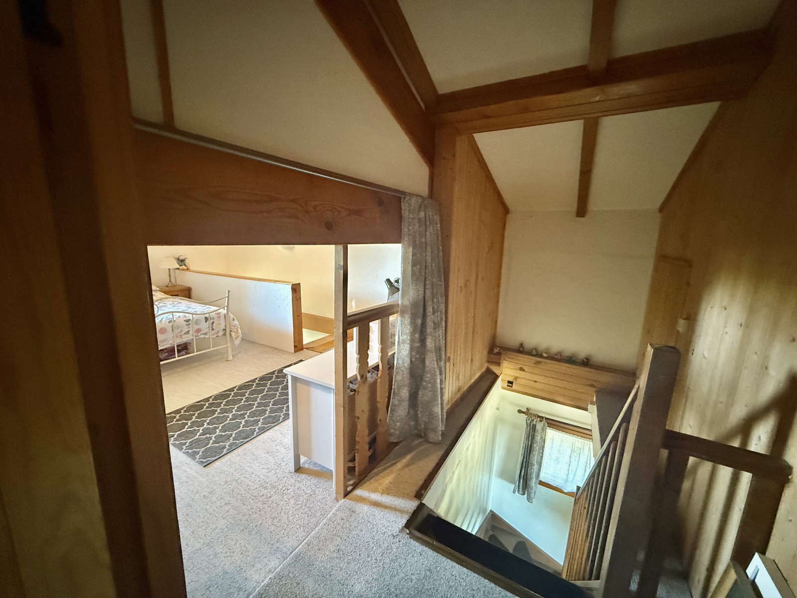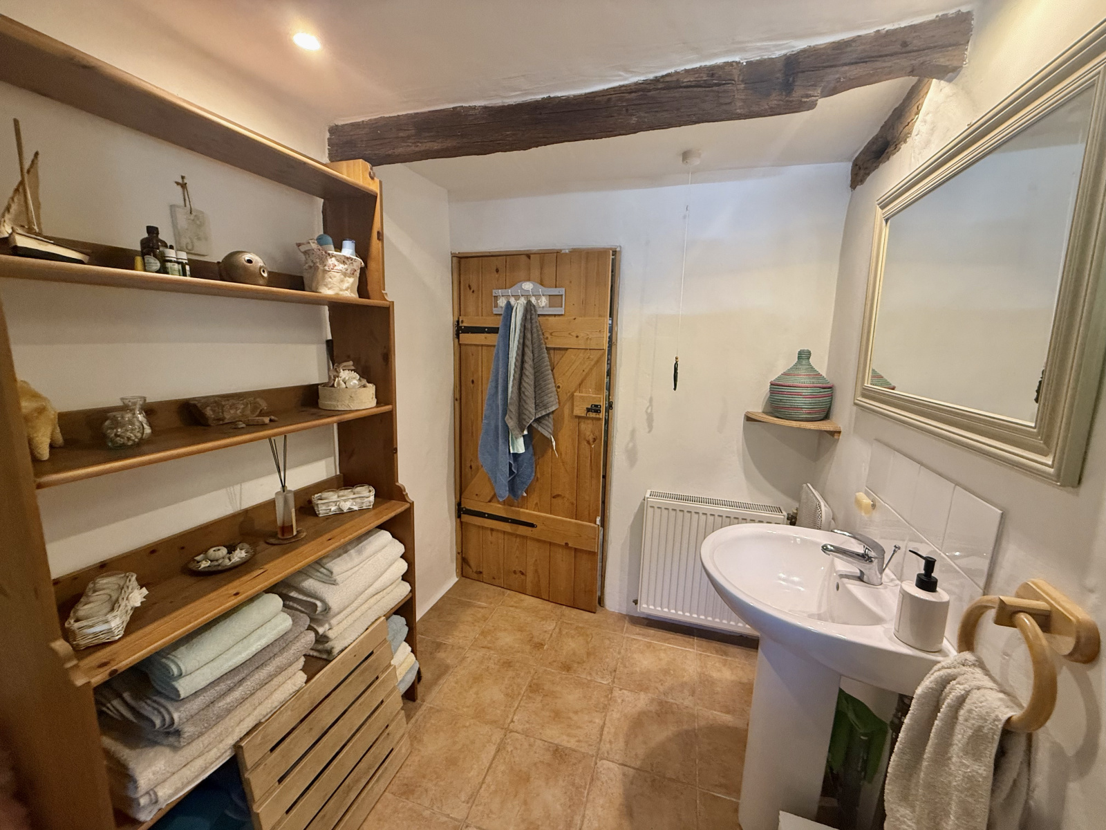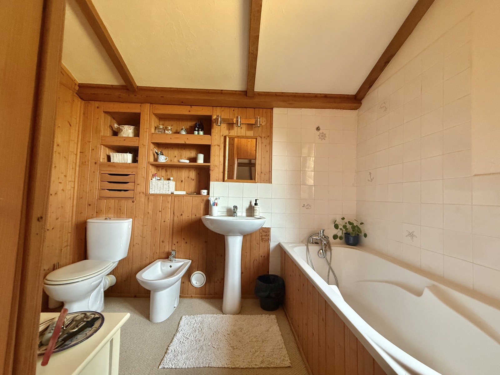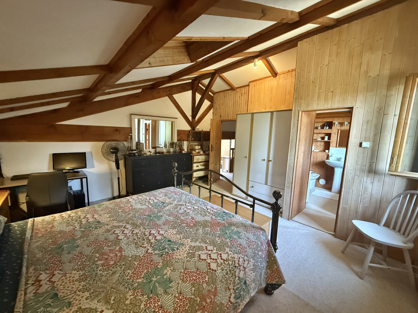 Le rez-de-chaussée s’ouvre sur un hall d’entrée accueillant avec porte écurie et escalier, menant à une salle d’eau avec WC ainsi qu’à une cuisine entièrement équipée, baignée de lumière grâce à ses fenêtres à double exposition. Le salon spacieux dispose de portes-fenêtres donnant sur la terrasse et bénéficie de la chaleur de l’insert. À l’étage, la chambre principale, avec ses poutres apparentes et ses grandes fenêtres offrant une vue dégagée, dispose d’une salle de bain attenante avec baignoire, lavabo, bidet et WC. Un palier sert actuellement de deuxième chambre, tandis que la troisième chambre profite également de belles dimensions et d’une luminosité généreuse.