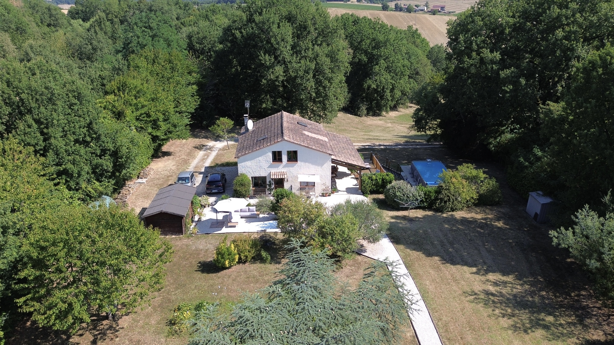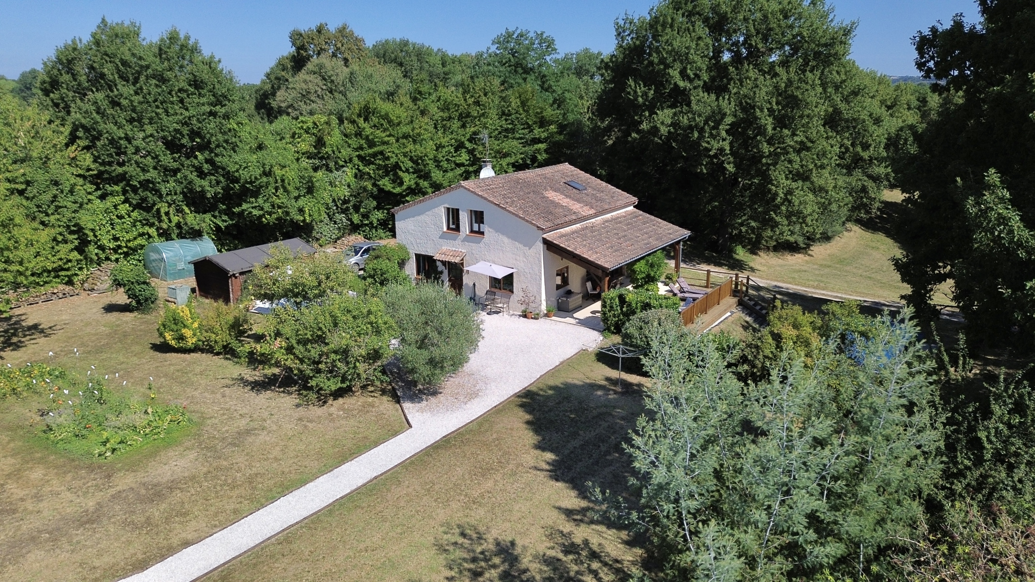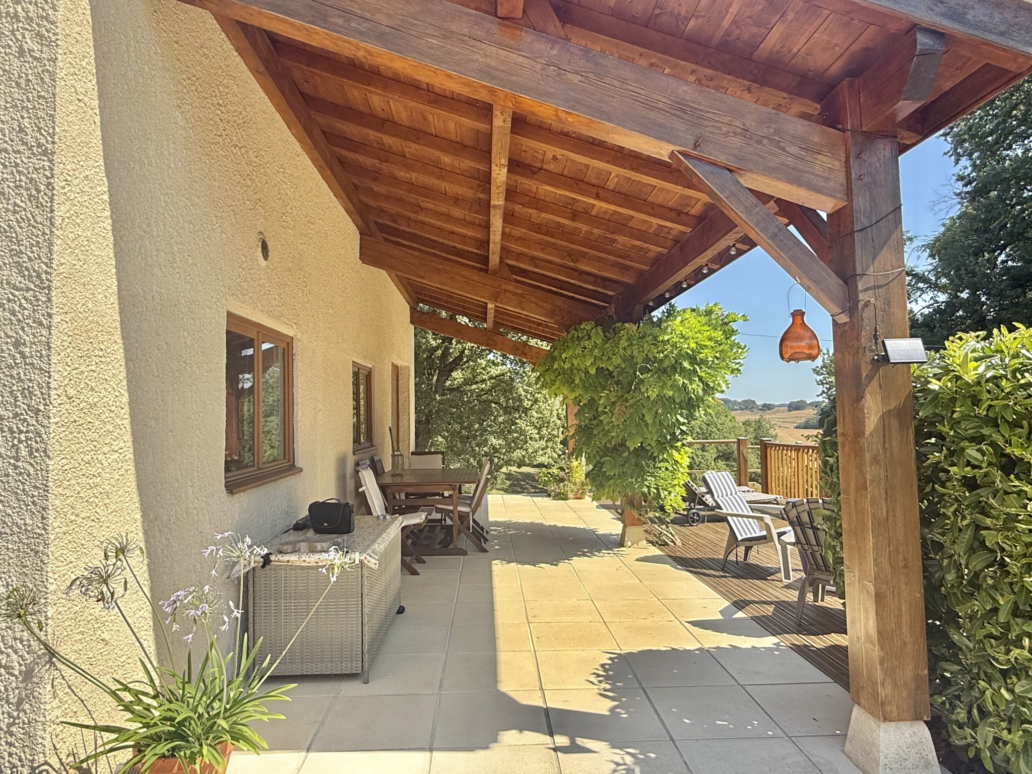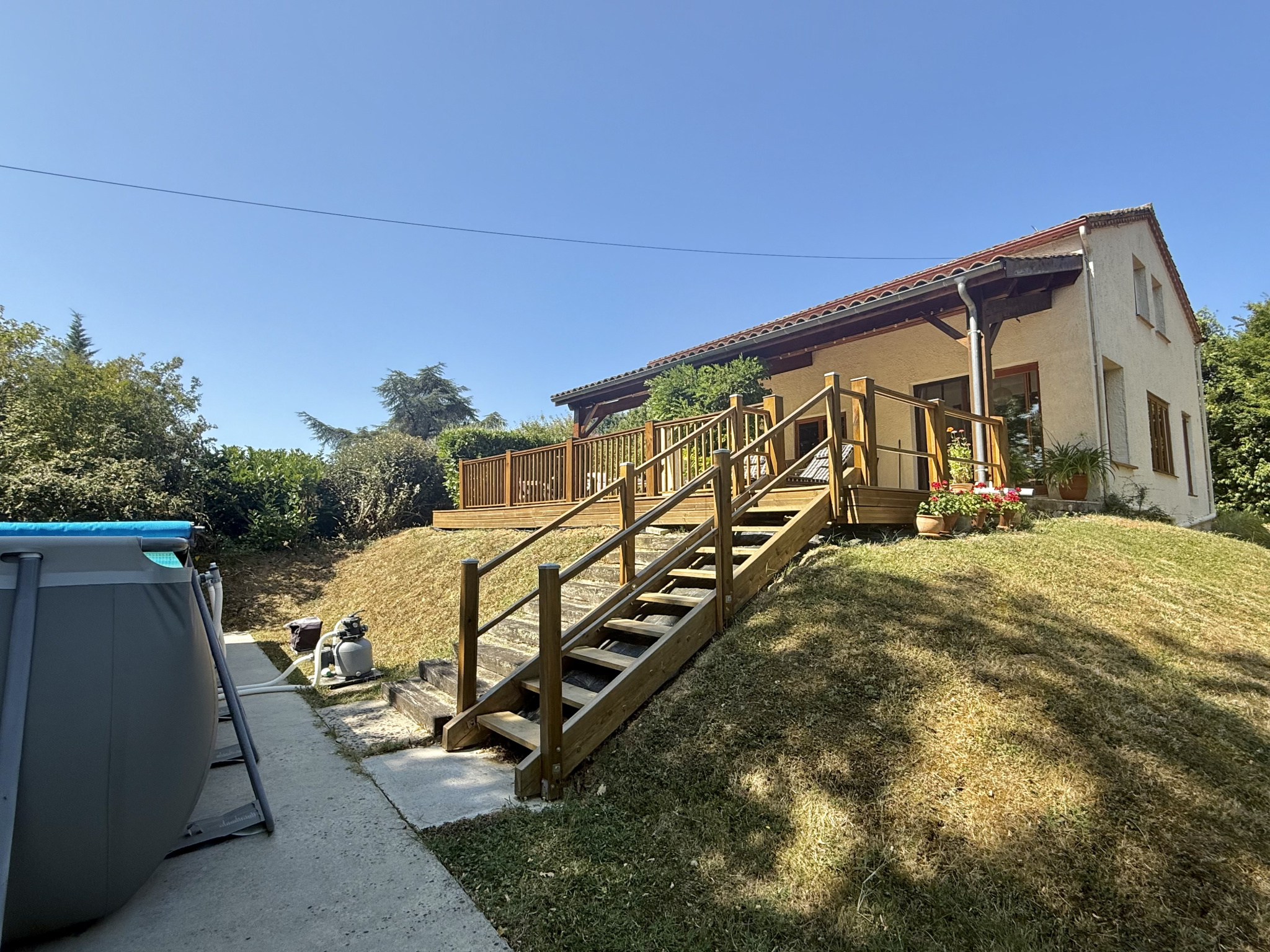 Nichée en hauteur et offrant une vue imprenable sur le jardin et la vallée, cette charmante maison de trois chambres allie tranquillité et commodité, à seulement quelques pas du village recherché de Castelsagrat, avec son café-restaurant, sa boulangerie, ses commerces et son école primaire. La propriété s’étend sur 1,9 hectare, bordée d’un côté par un bois et ombragée par un chêne majestueux, et a été soigneusement entretenue au fil des ans. À l’intérieur, de beaux volumes de vie et une terrasse couverte permettent de profiter d’une vue pittoresque sur le jardin et la piscine. En hiver, un insert dans le salon, équipé d’un bouilleur, assure à la fois le chauffage et l’eau chaude.
