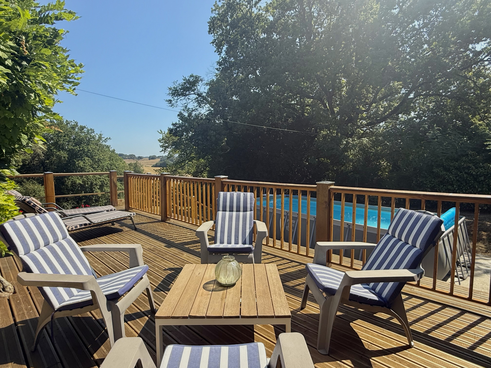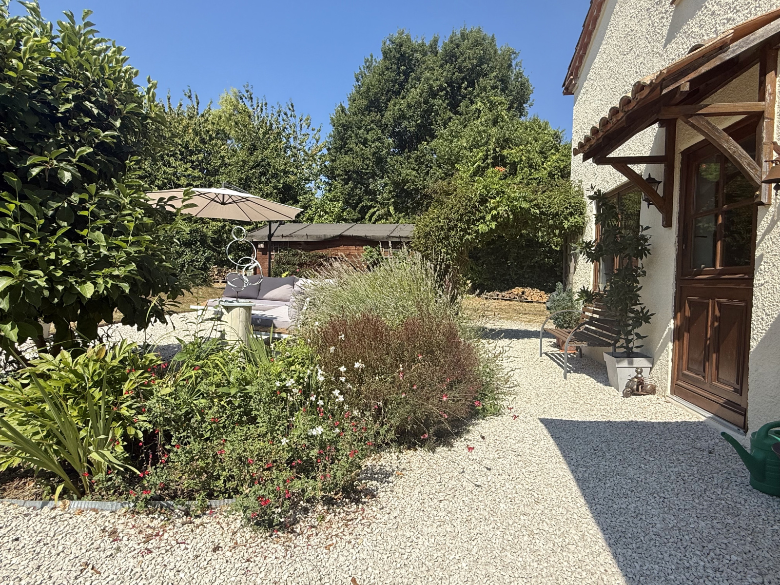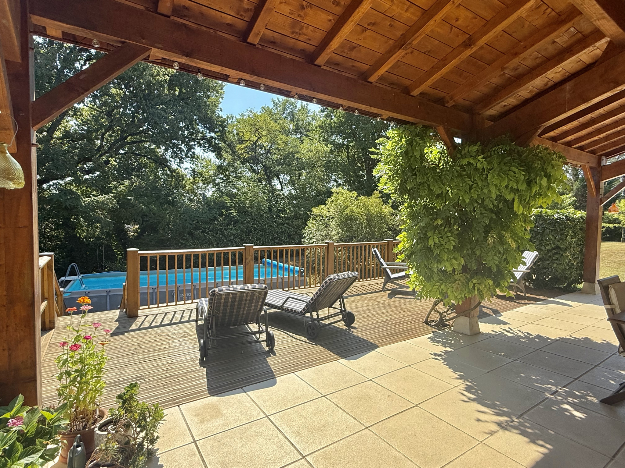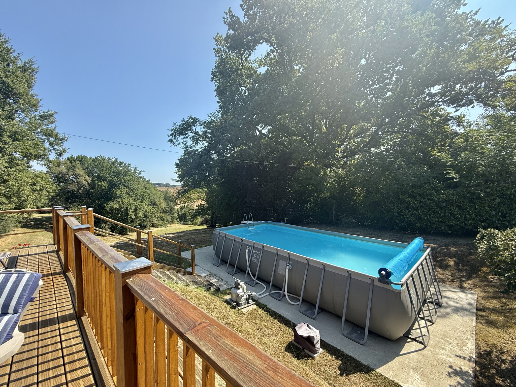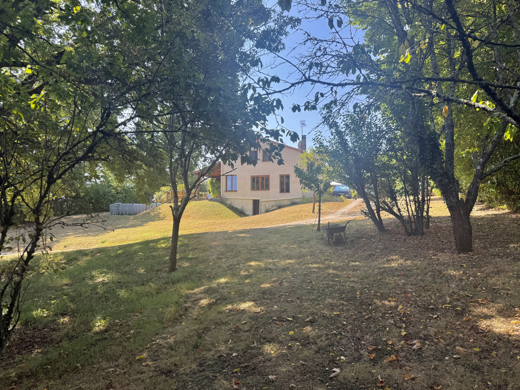 À l’extérieur, les 1,93 hectares comprennent des prairies vallonnées adaptées aux chevaux, des jardins paysagers plantés d’arbustes, de vignes et d’arbres fruitiers, un potager, une allée avec portail, ainsi que deux abris de jardin. Une piscine hors sol avec pompe, installée sur une base solide, sera démontée au début de l’hiver. Un puits et une petite cave pour le stockage du bois complètent l’ensemble.