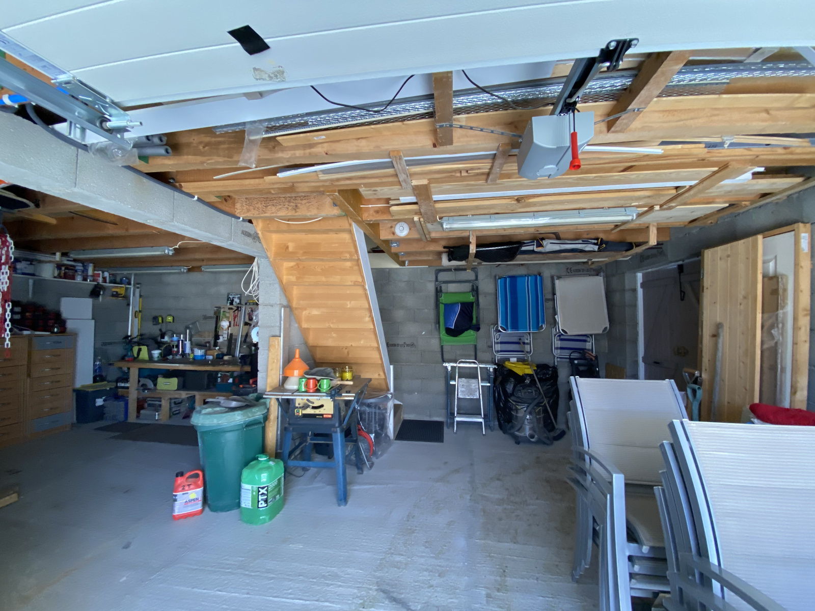 Double garage avec portes automatiques (7,5 m x 8.5m2) escalier interne menant a l'étage pour les amis invités avec 2 chambres et salle d'eau