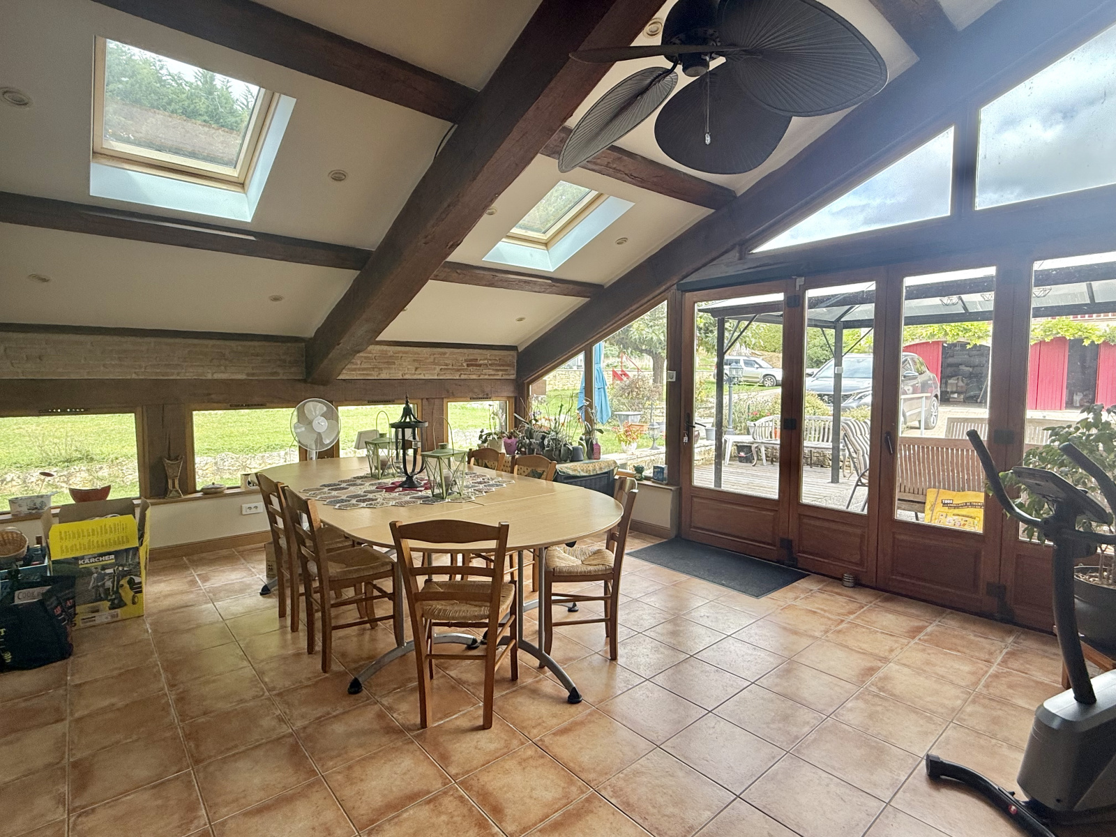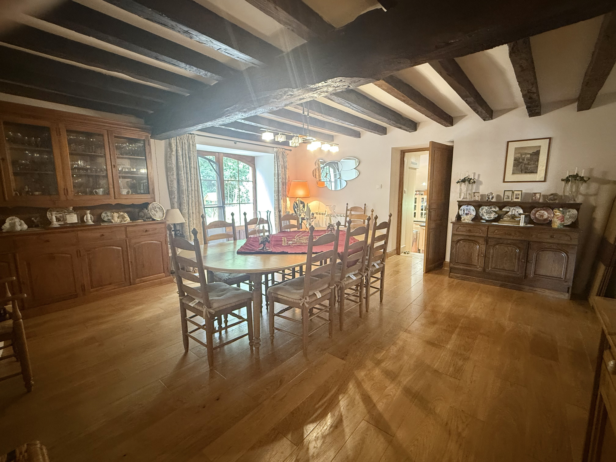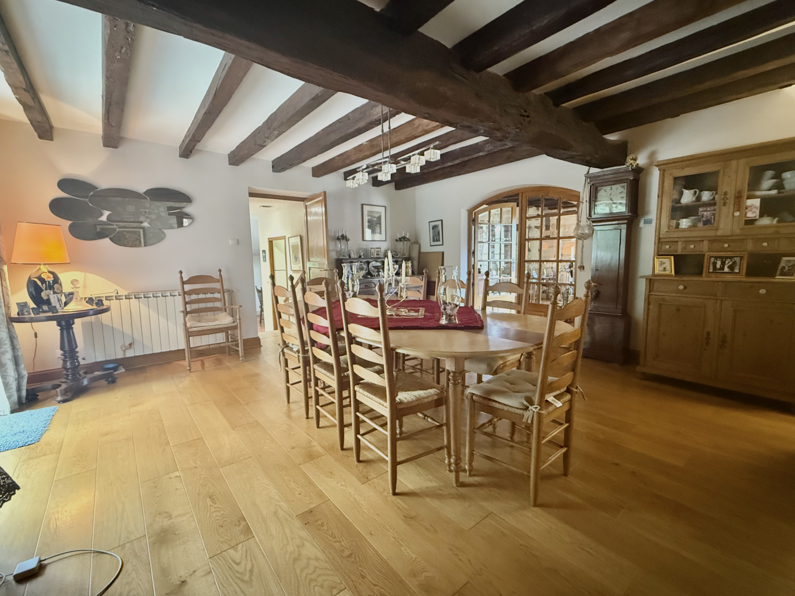 Salle à manger avec pierres et poutres apparentes (30,07 m²) ouvrant sur un salon avec poêle à bois et vue sur le jardin (40 m²).