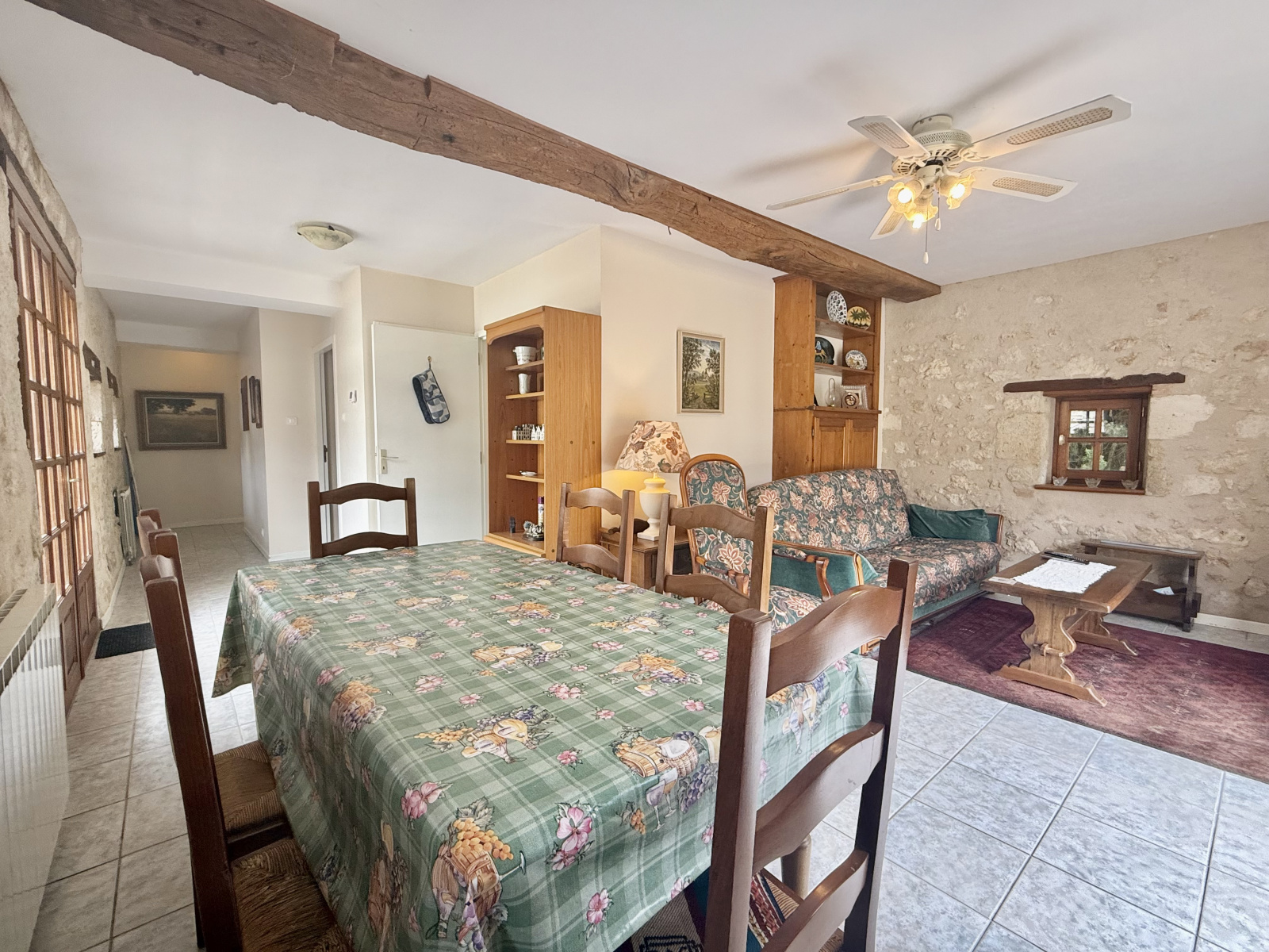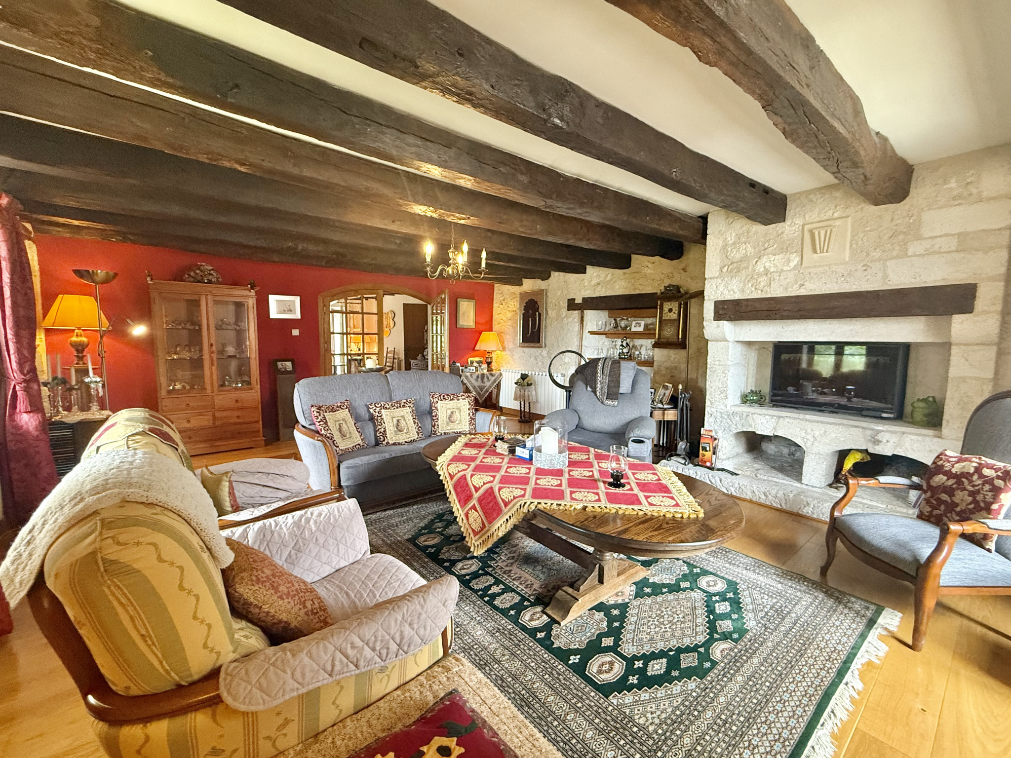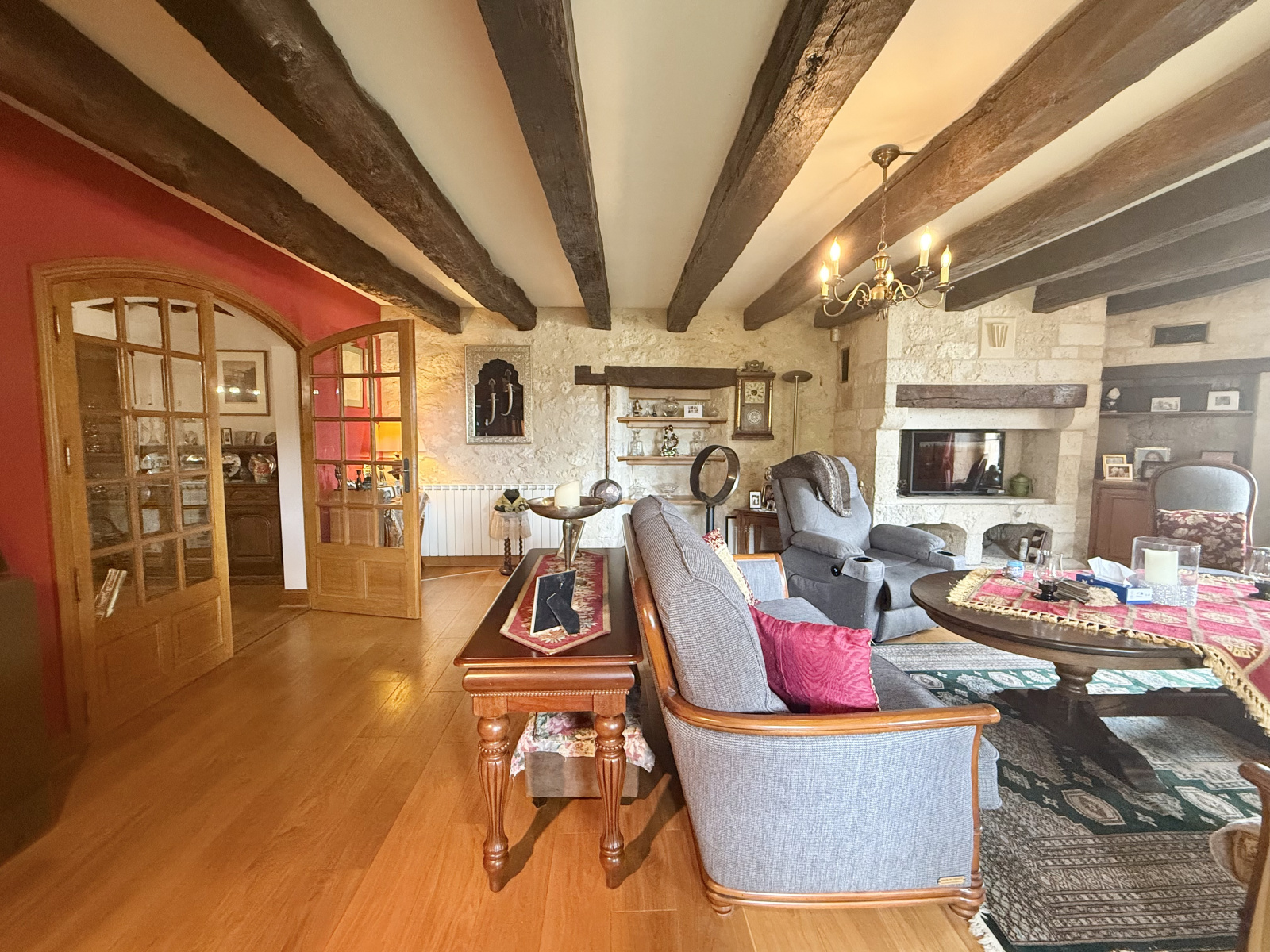 Salle à manger avec pierres et poutres apparentes (30,07 m²) ouvrant sur un salon avec poêle à bois et vue sur le jardin (40 m²).