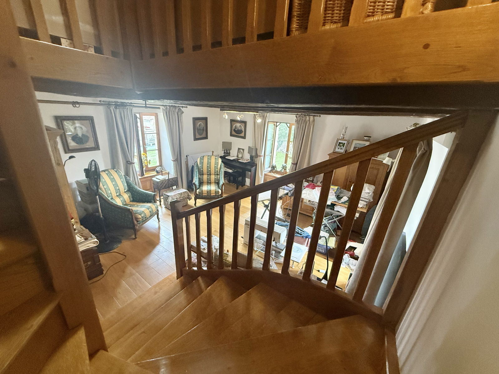 Escalier en chêne reliant l’étage et le niveau jardin.