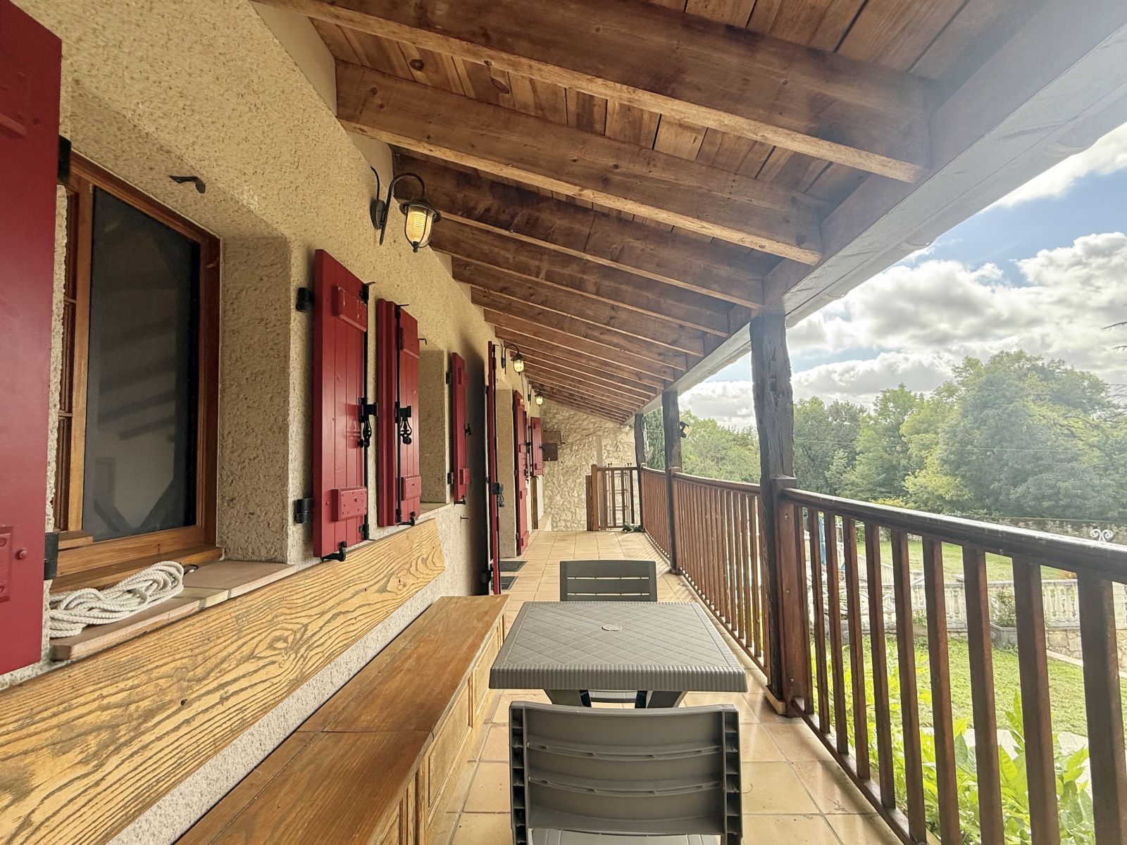 Appartement au-dessus du garage : une chambre, séjour ouvert avec cuisine en angle et salle d’eau. La terrasse d’entrée s’étend sur toute la largeur du bâtiment, offrant un point de vue exceptionnel sur l’ensemble de la propriété, de la piscine aux jardins.