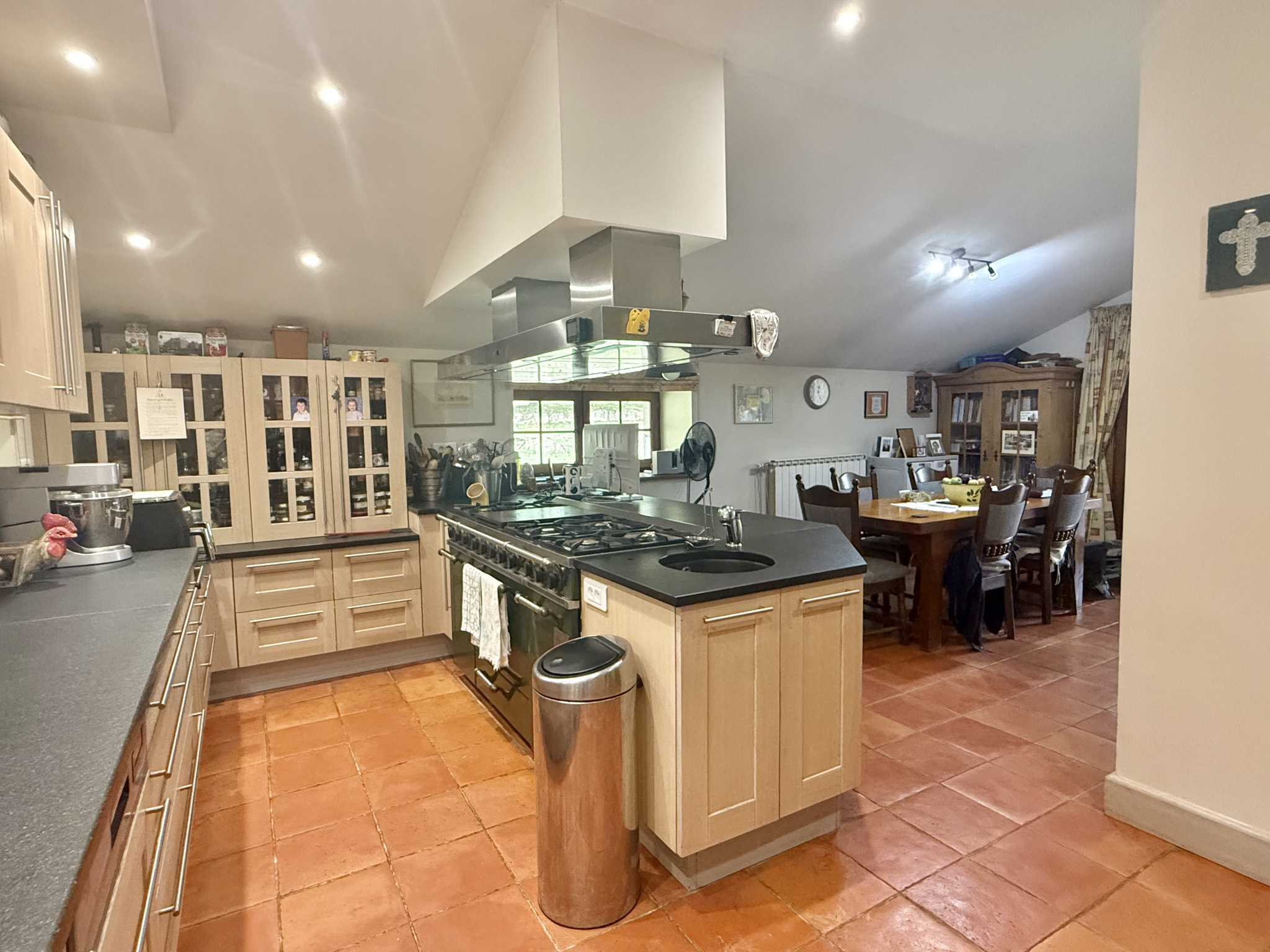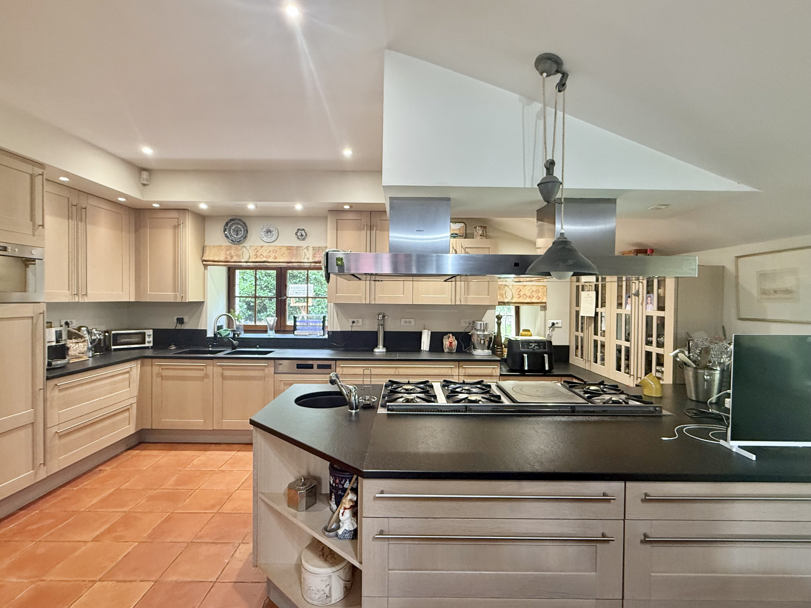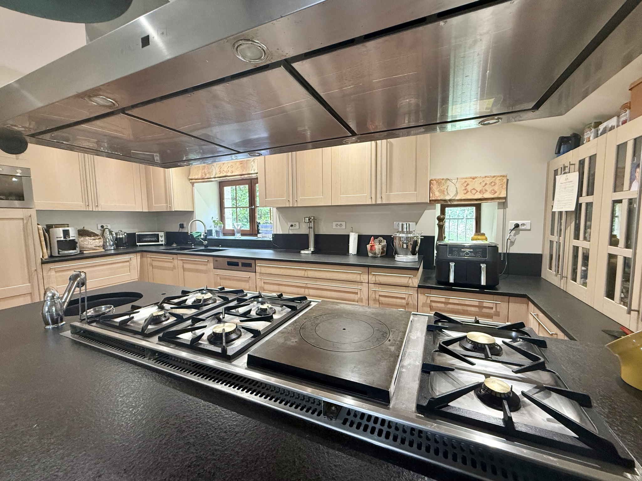 Cuisine bien équipée avec plans en granite, four de style professionnel et coin petit-déjeuner (14,45 m²).