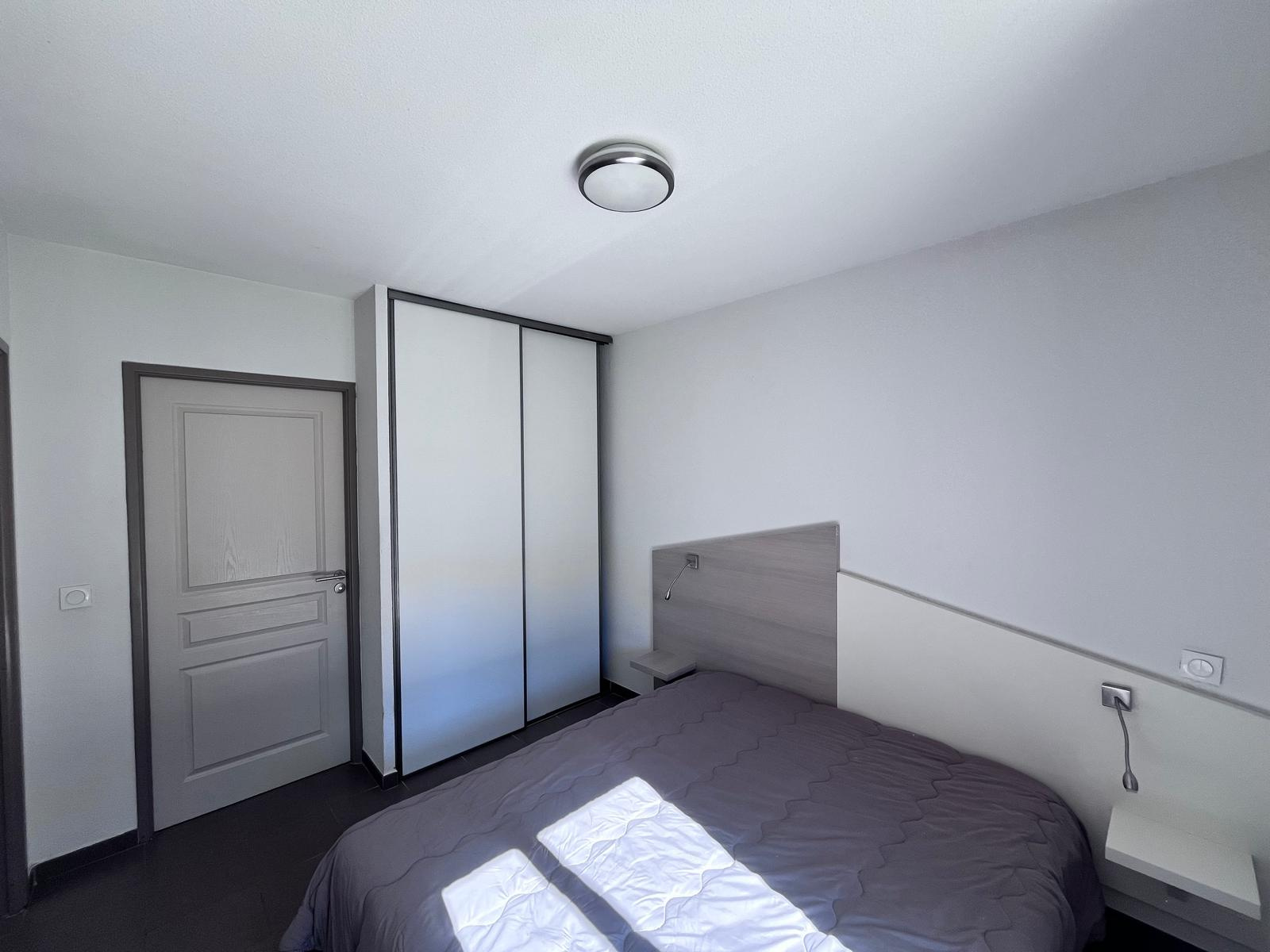 Mobilier et électroménager inclus : cuisine équipée (plaques vitrocéramique, hotte, machine à laver, frigo/congélateur, vaisselle), chambre avec dressing, salle d’eau spacieuse et WC séparés