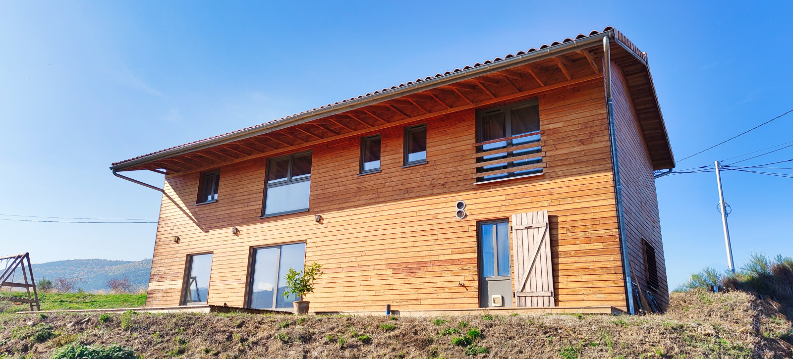 Structure et ossature bois, sur fondations béton. Bardage bois exterieur.