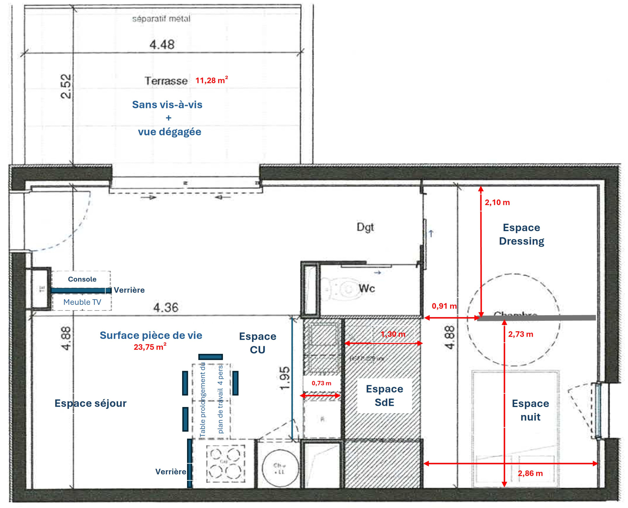 Enfin la pièce de vie s’ouvre avec ses baies vitrées coulissantes sur une terrasse à ciel ouvert offrant une profondeur de plus de 2,20 mètres pour une longueur de près de 4,50 mètres. Ce qui permet un réel espace extérieur à vivre.