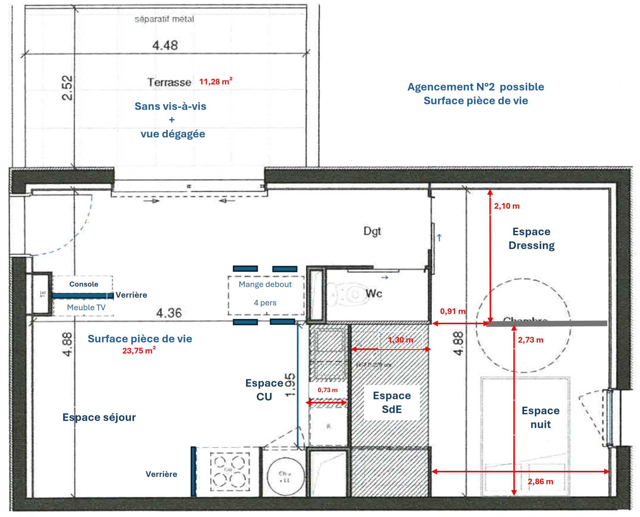 L’agencement de sa pièce de vie permet un espace cuisine ouvert et un espace séjour distinct, ce qui lui confère un agencement d’appartement à vivre. (Voir les 2 dernières photos). La pièce de vie représente 54% de la surface totale du logement.