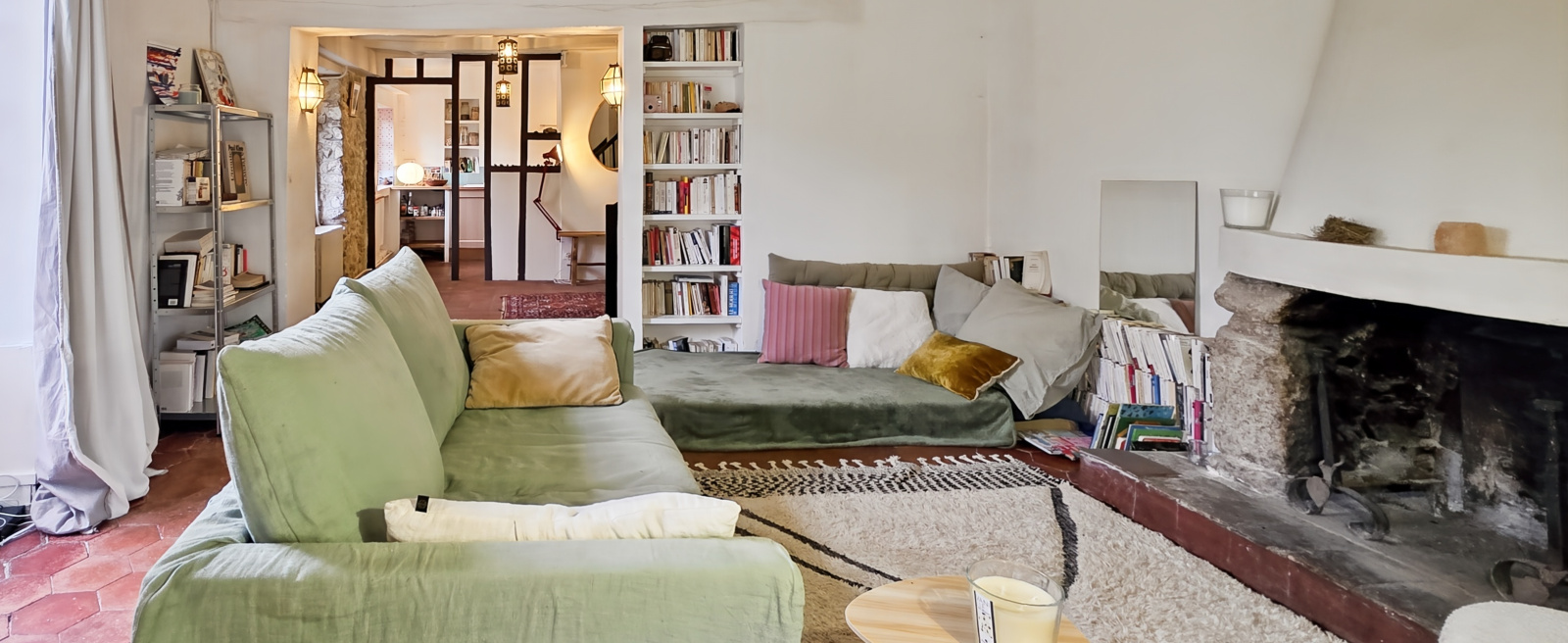 Les matériaux d’origine : tomettes anciennes, poutres apparentes, murs en pierre et cheminée à foyer ouvert, témoignent du charme intemporel du lieu et participent pleinement à son identité.