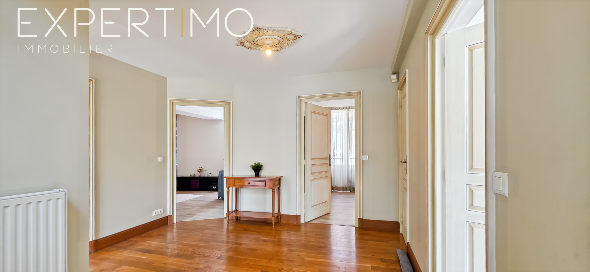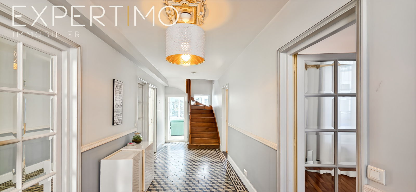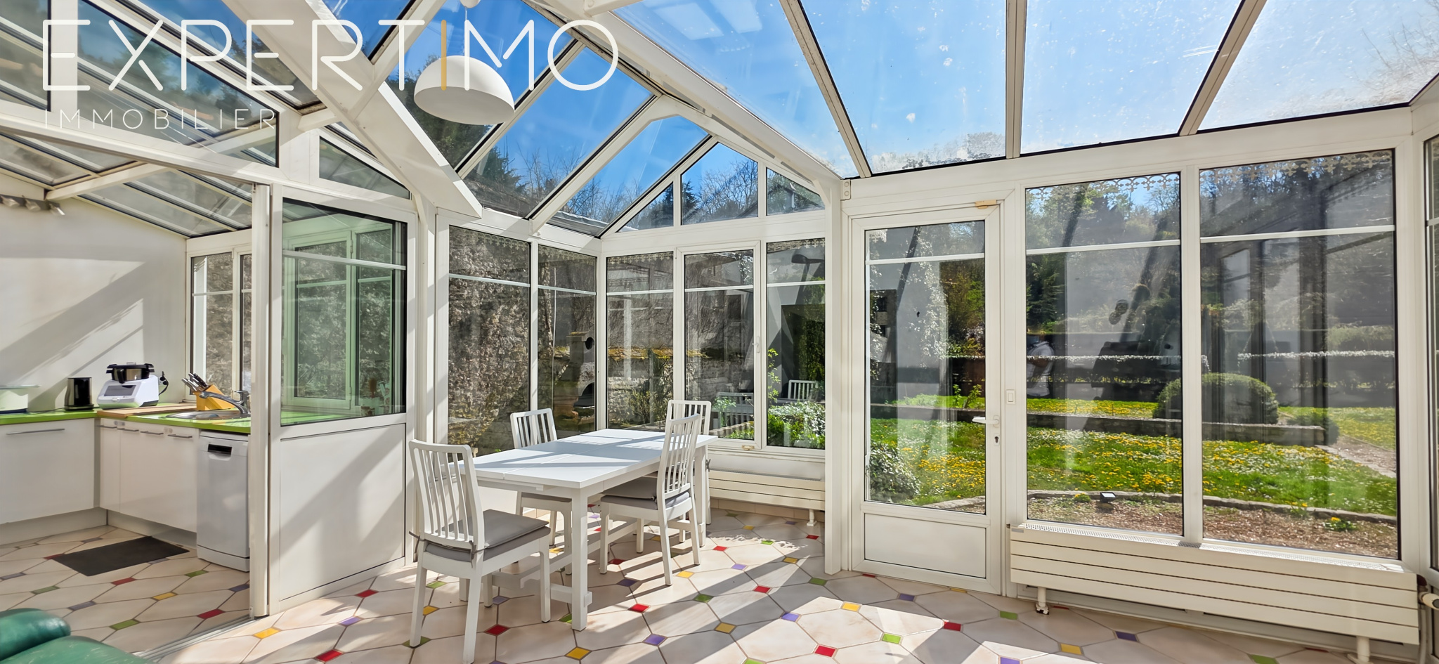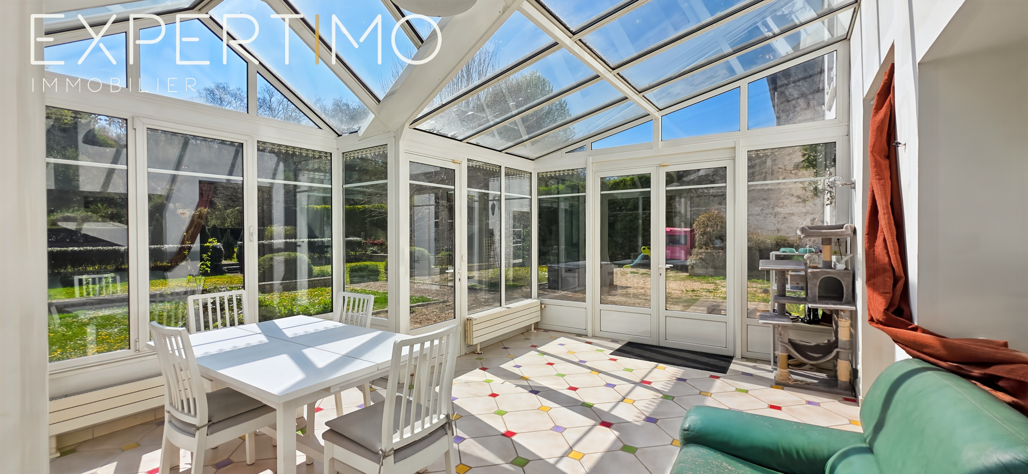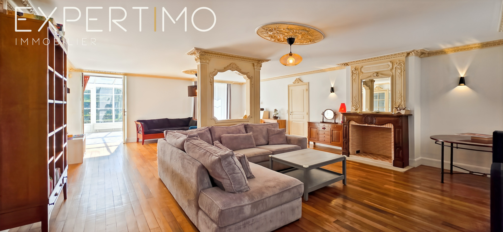 Pièce de réception de 62 m² baignée de lumière, ouvrant sur une vaste véranda plein sud