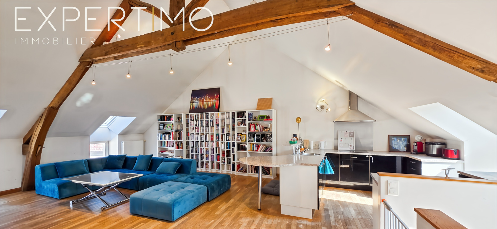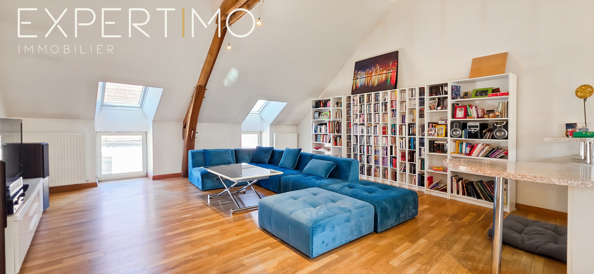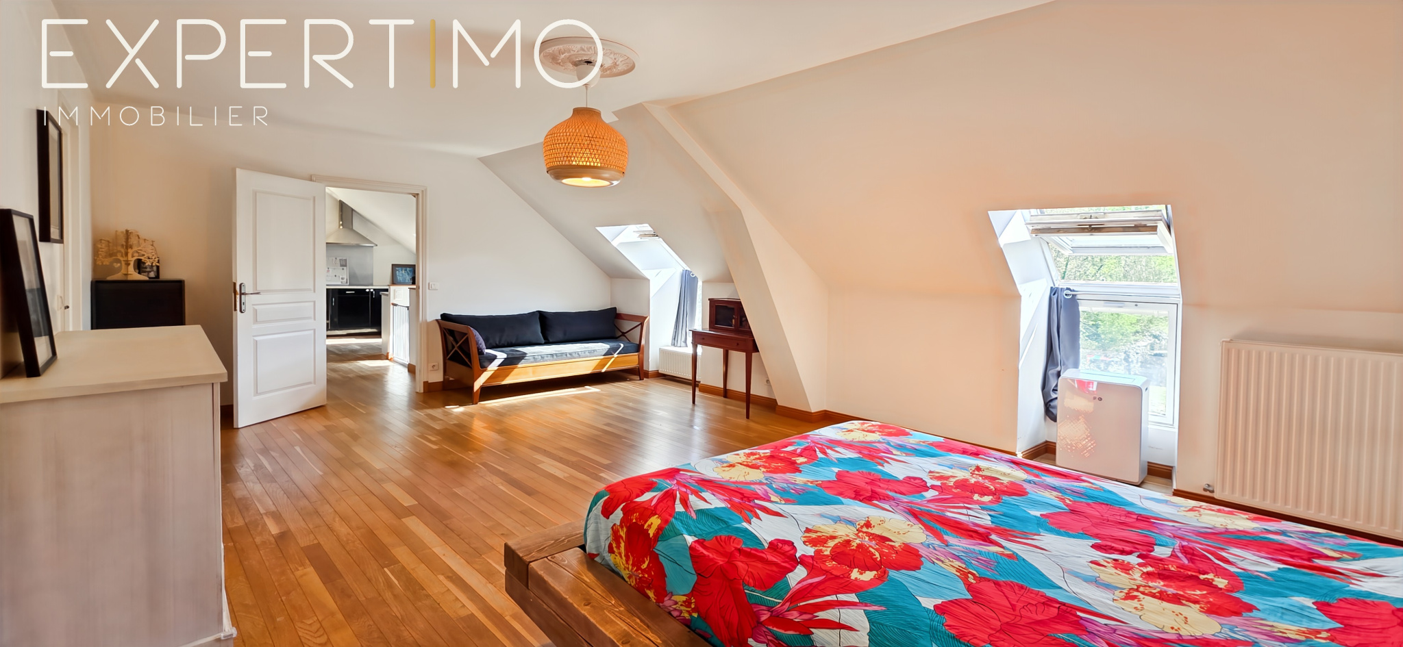 Suite parentale spectaculaire de 100 m² à l’étage : séjour cathédrale, cuisine discrète, chambre, salle de bains, dressing sur-mesure