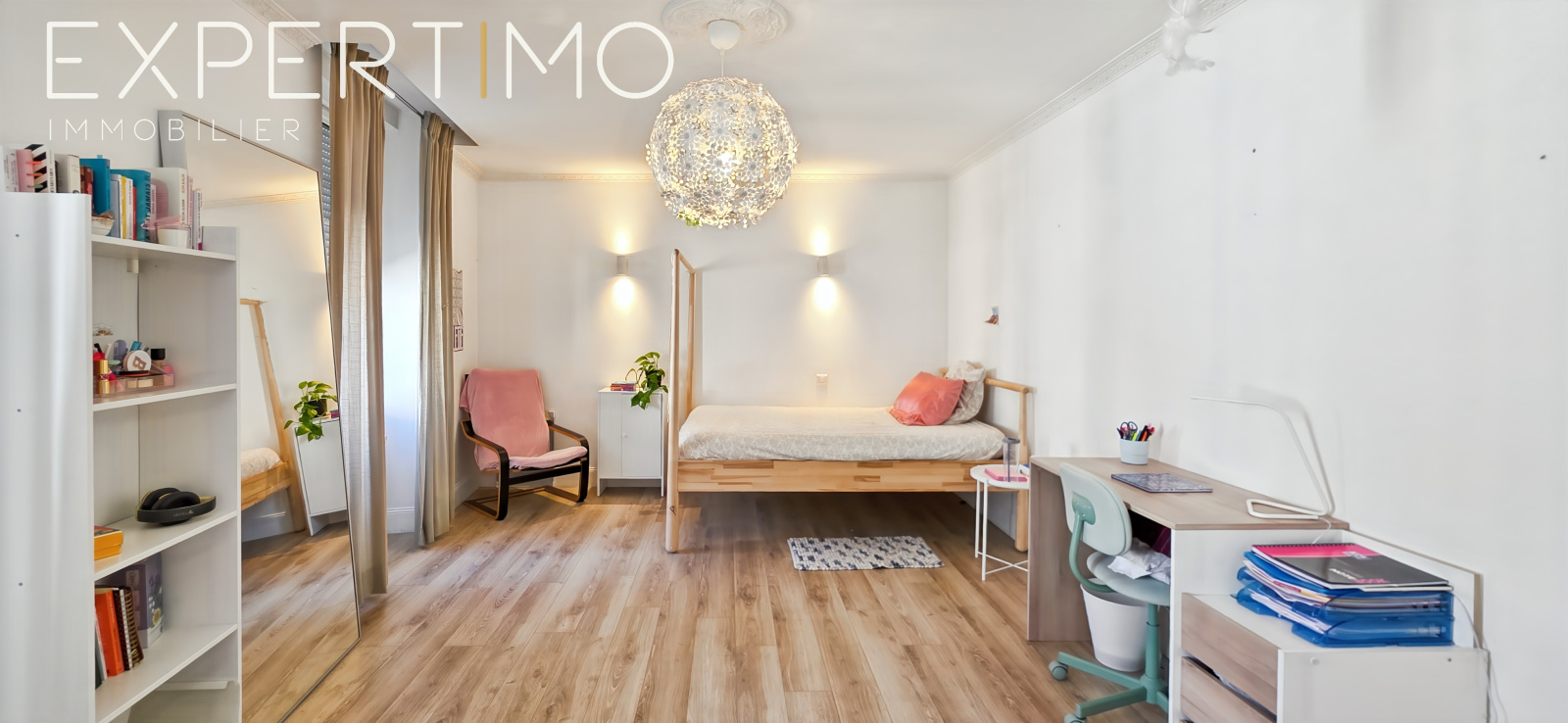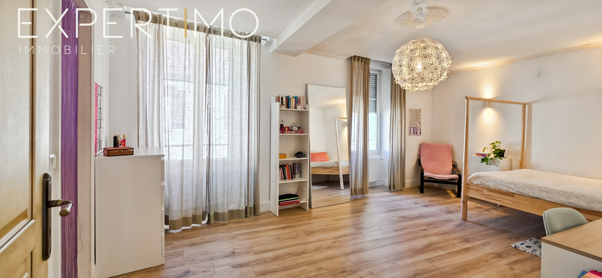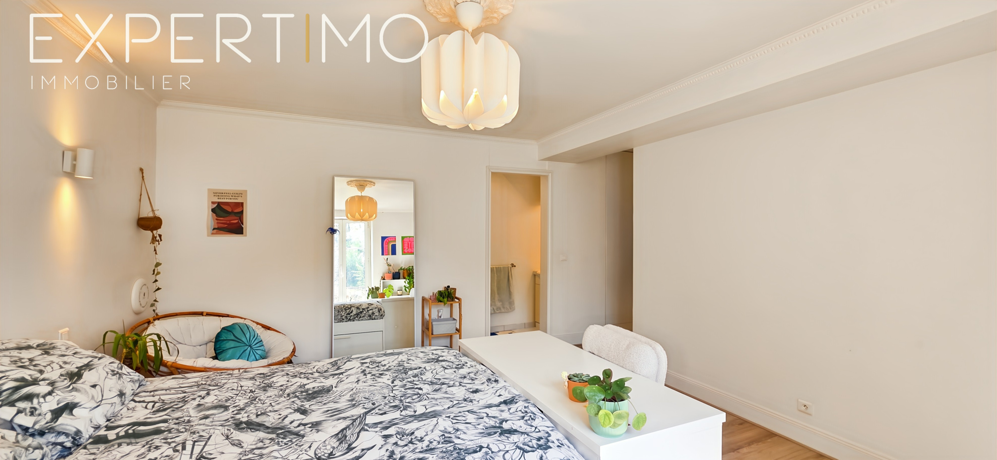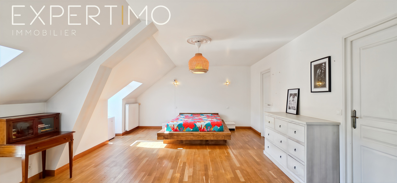 Suite parentale spectaculaire de 100 m² à l’étage : séjour cathédrale, cuisine discrète, chambre, salle de bains, dressing sur-mesure