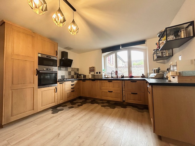 En rez-de-chaussée, une entrée avec rangements et placards, une salle à manger de 25 m2, exposée Est, (avec enceintes de musique intégrées), un demi palier, une cuisine individuelle aménagée et équipée, un WC séparé avec lave-mains, une deuxième entrée (avec accès à une belle cave voutée), un salon avec un poêle à bois suspendu (3 ans), un local technique avec Chaudière Frisquet de 2017 et une pompe pour le puit.