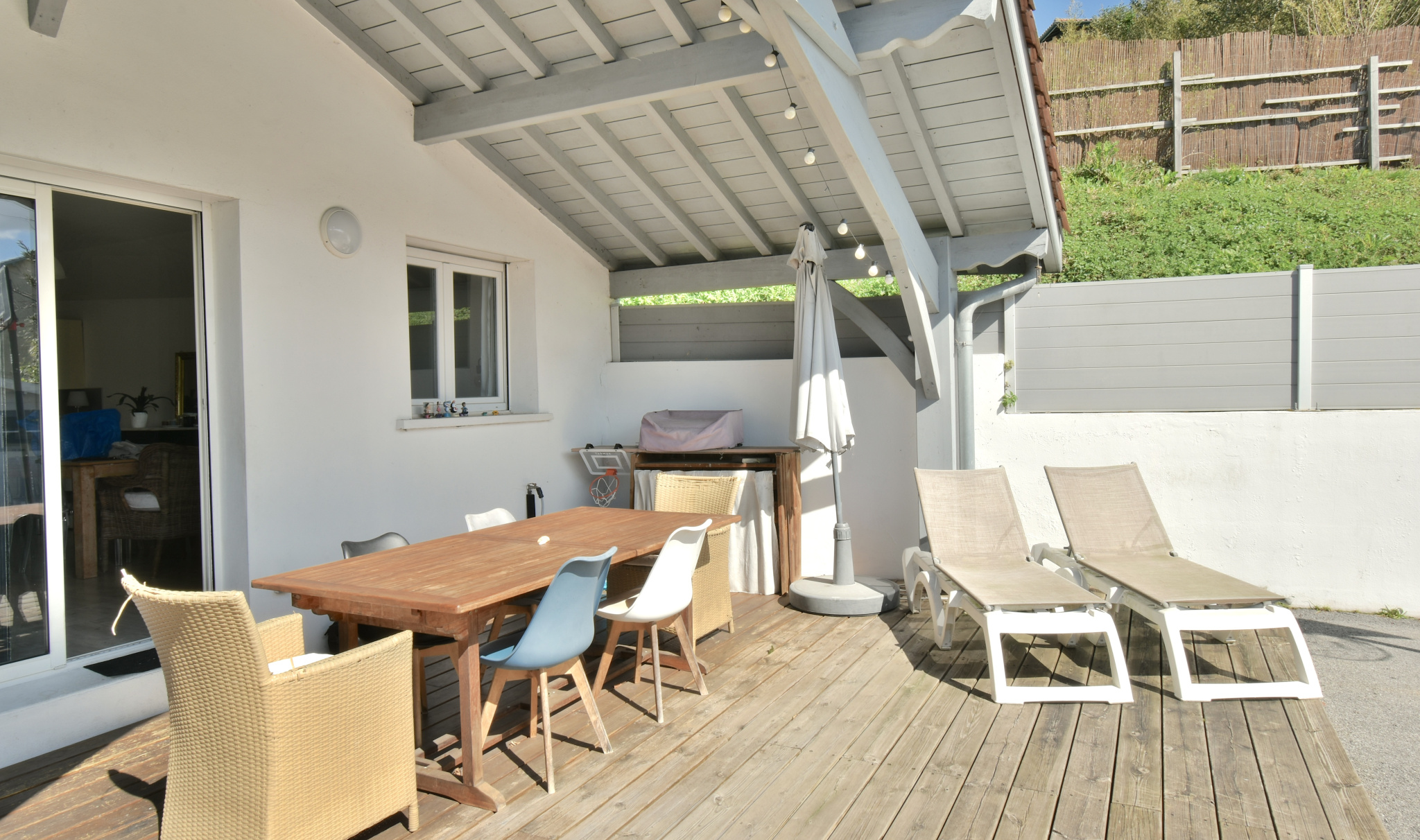 Anglet centre maison de 101 m2 plain pied sur une parcelle d'environ 300 m2, au calme avec tous les commerces, cinéma, marché et écoles à pied. Elle est équipée d'une salle à manger séjour donnant sur une terrasse abritéee plein sud, avec cuisine récente, 3 chambres, une salle de bains salle d'eau récente. Deux cabanes de jardin sont en place ainsi que deux places de stationnement.