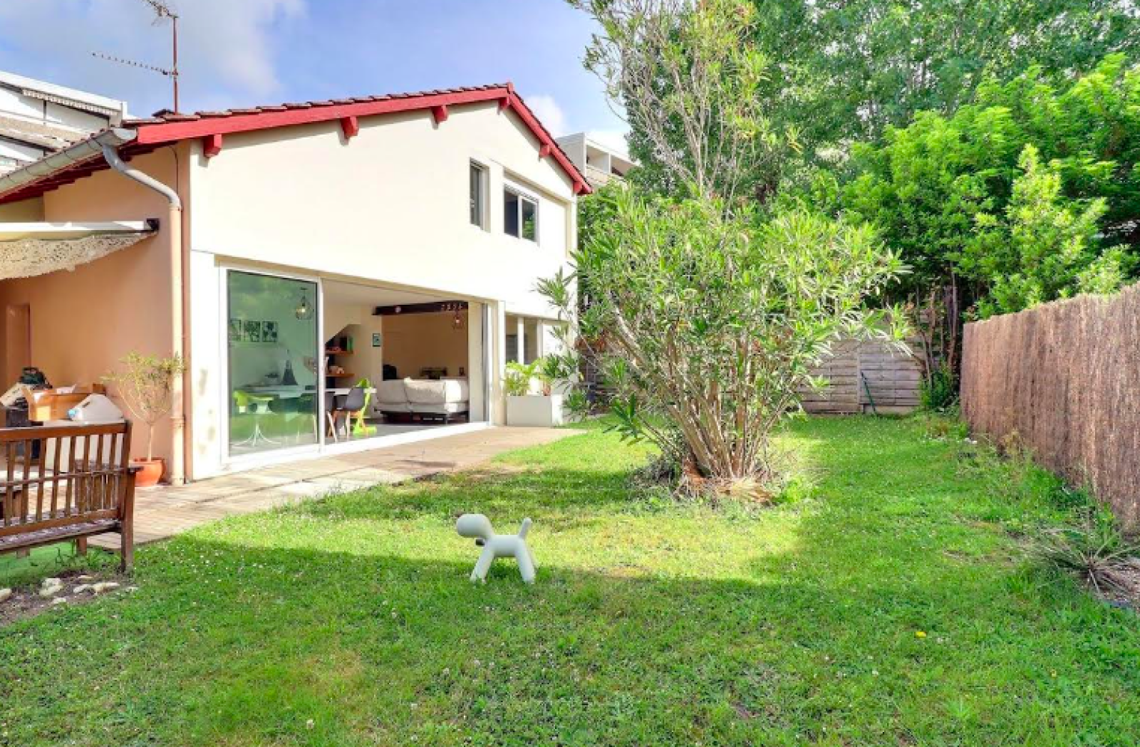 Maison Anglet quartier Hardoy 117 m2 habitable au calme, avec son terrain de environ 250 m2. Au RDC une chambre, une salle de bains, la cuisine est fermée et récente dotée d'une buanderie, une salle à manger salon donnant sur le jardin exposé sud. A l'étage 3 chambres et un bureau/dressing pouvant faire office de 5 ème chambre. La maison est en copropriété et , possiblité d'une piscine hors sol votée. Un garage de 14 m2. A quelques minutes de la place Lamothe et de ses commerces, le marché de Quintaou et de ses écoles. L'accès est aussi très aisé par la piste cyclable, l'arrêt de bus au bout de la rue.