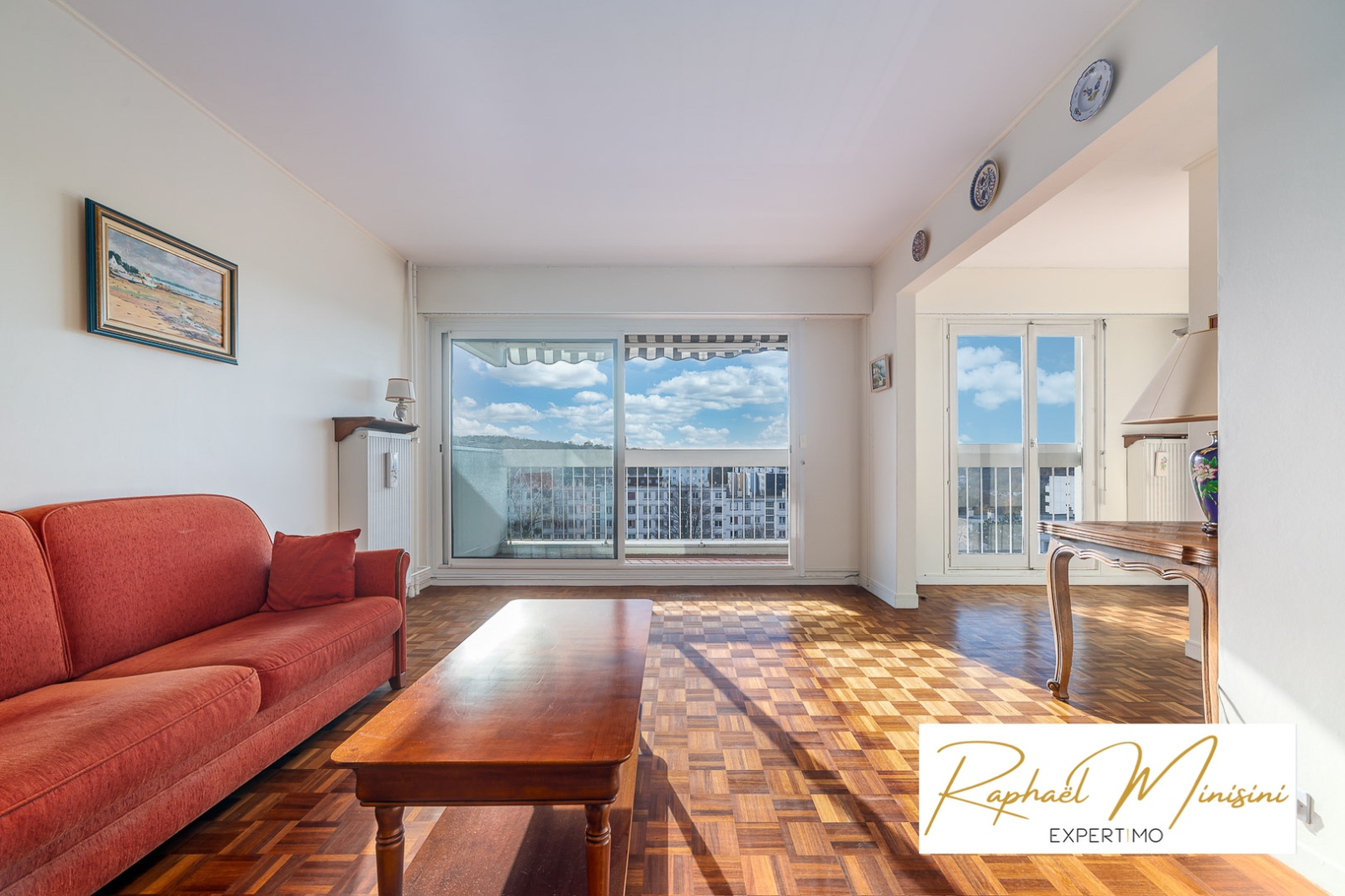 Allée Claude Monet, Domaine de Montval dans un environnement calme. Appartement en étage élevé (ascenseur), 4 pièces de 86,65 m², traversant et lumineux, exposé sud-ouest / nord-est, offrant vue dégagée sans vis-à -vis et deux balcons.