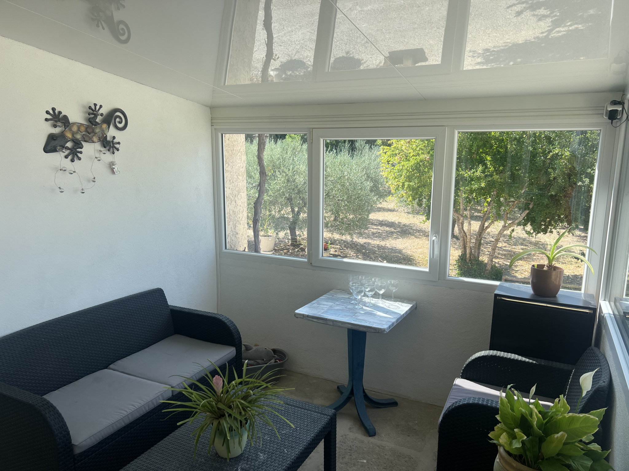 Véranda plein Sud : pièce maîtresse de la maison, idéale pour les repas en famille ou les soirées entre amis, été comme hiver.