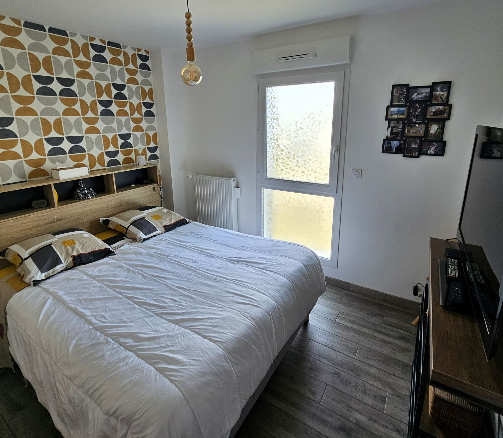 La salle d'eau, avec sa grande douche type italienne, est neuve et réalisée avec des matériaux contemporains.