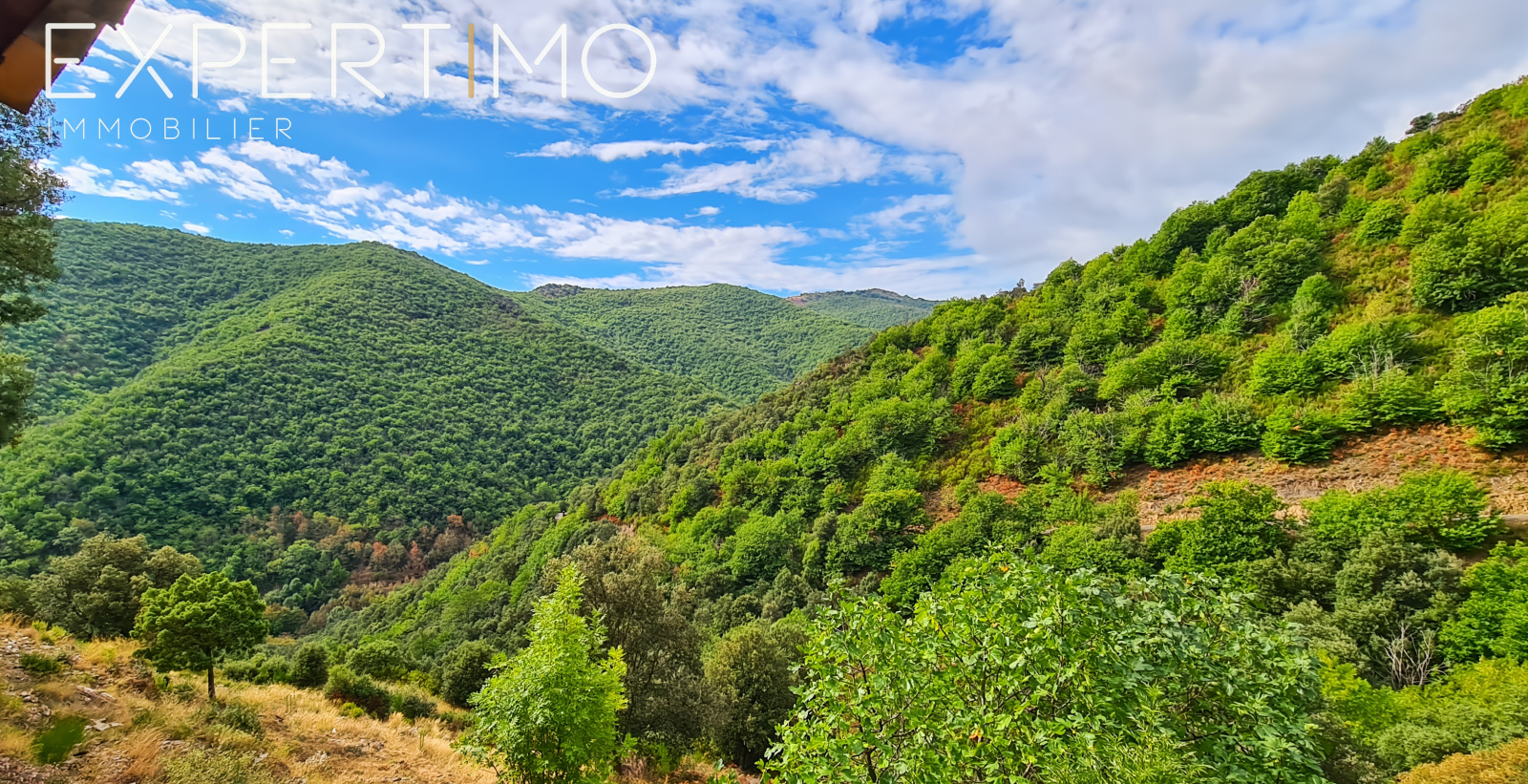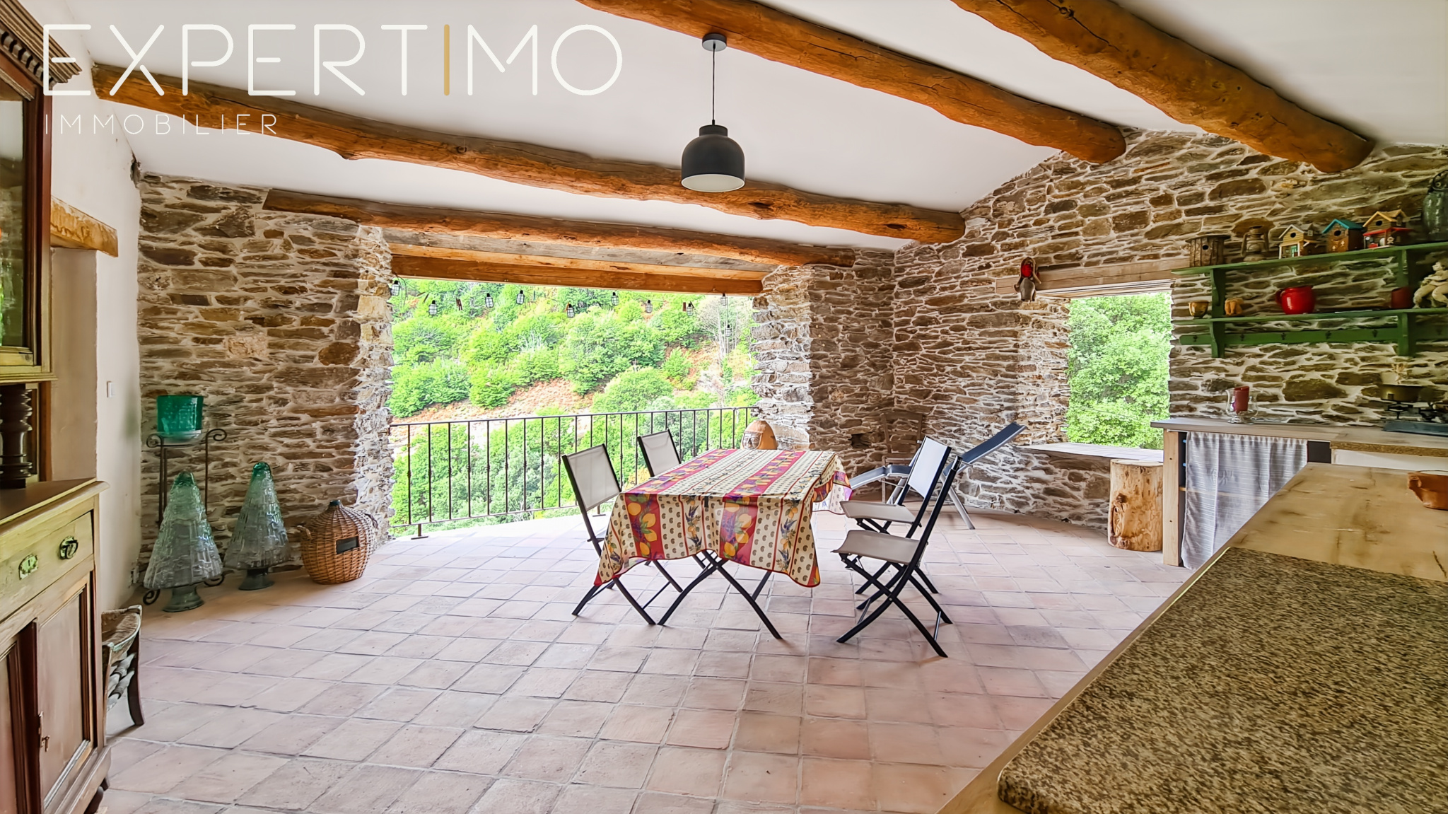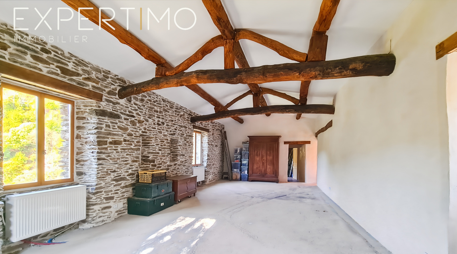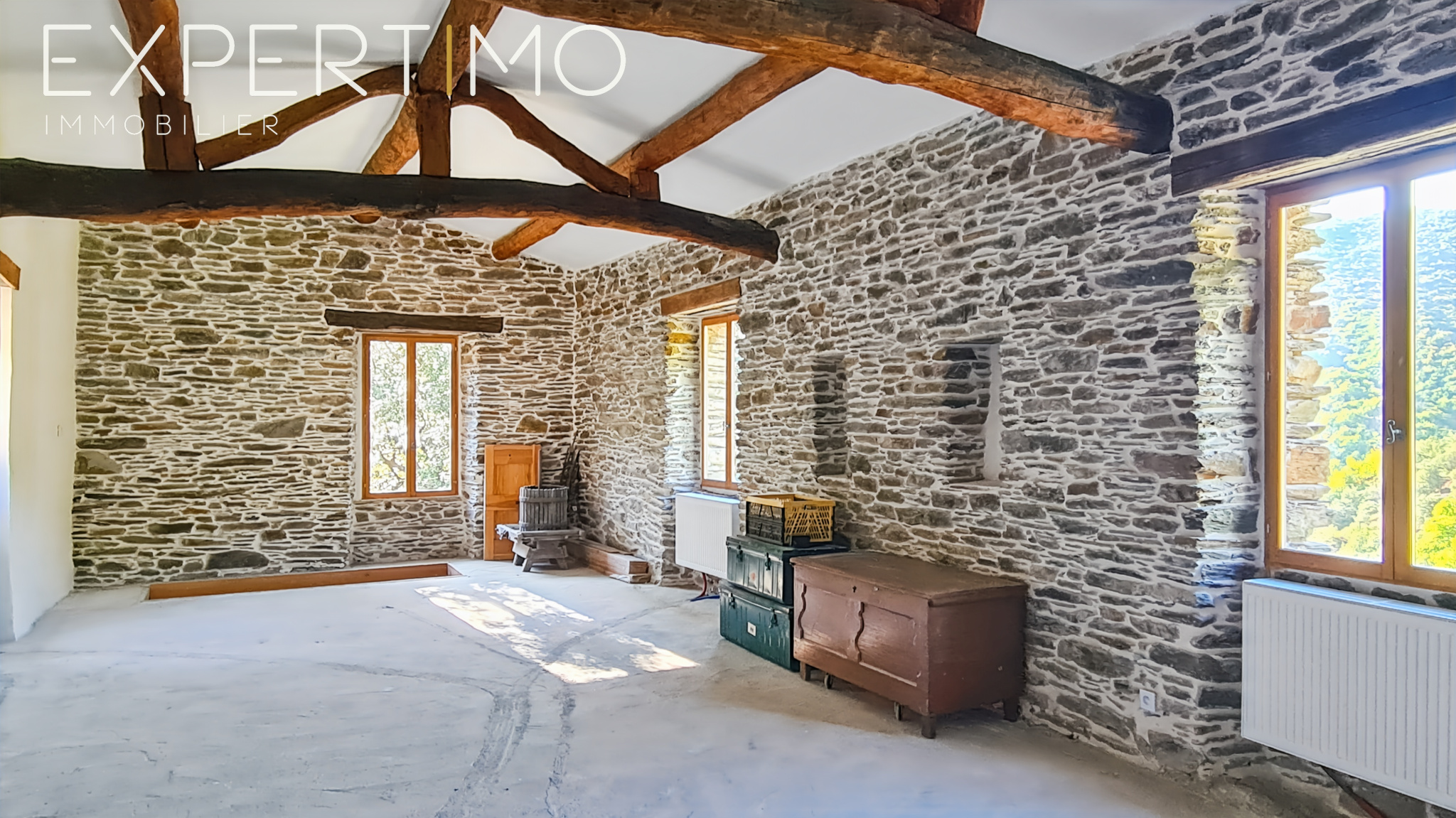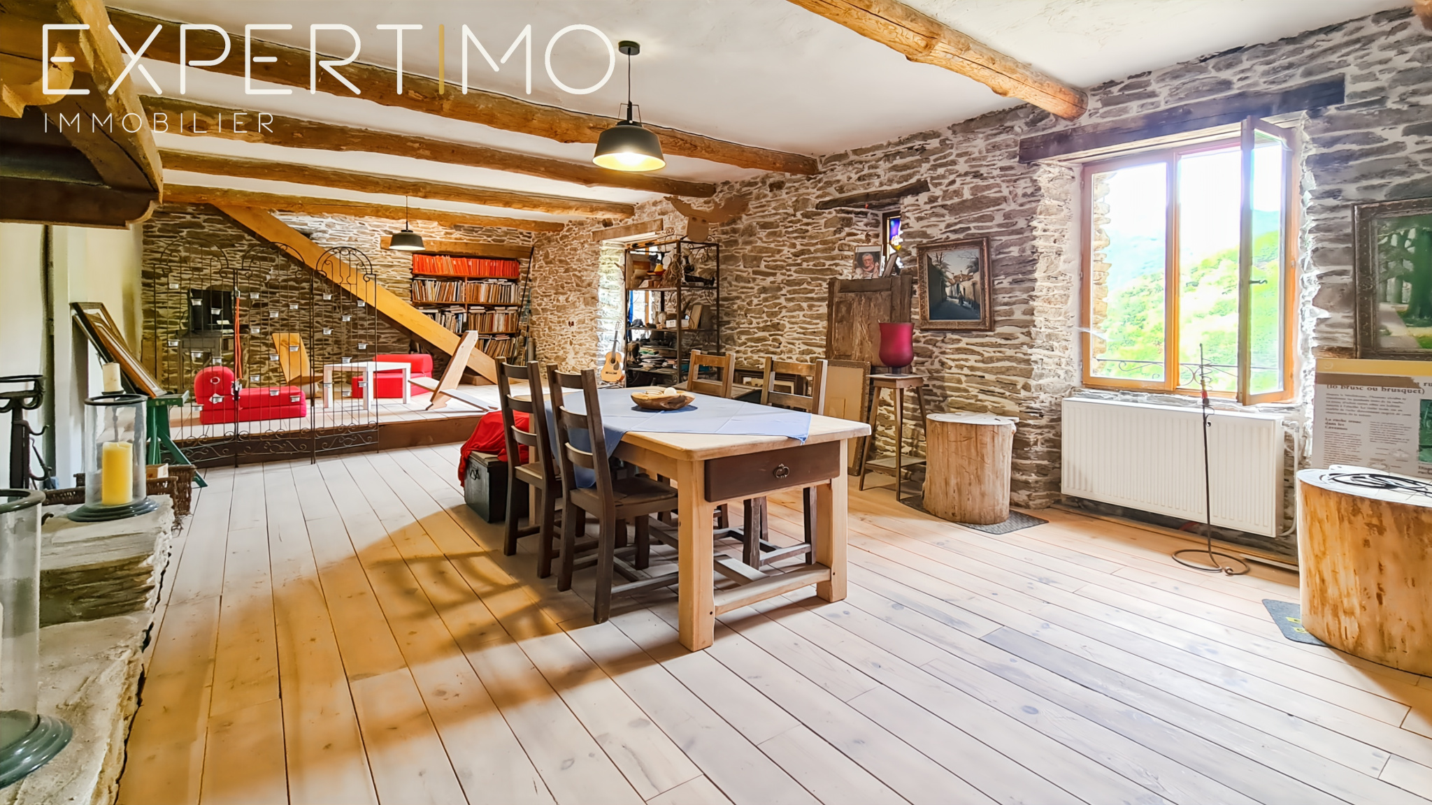 Habitation comprenant une terrasse couverte (32 m²) avec vue imprenable sur la vallée, donnant sur la cuisine (20 m²), puis sur le salon / salle à manger (53 m²) avec cheminée. A l'étage se trouvent deux chambres dont une avec salle d'eau, un wc, une grande pièce de 50 m² à aménager (possibilité de créer deux chambres supplémentaires et une salle de bains).