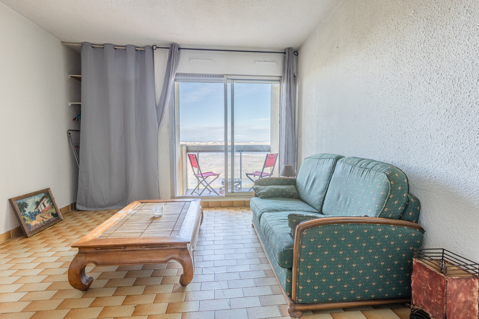 L'appartement s'ouvre sur une entrée desservant une pièce de vie lumineuse avec kitchenette, prolongée par un balcon avec une vue dégagée sur le canal et les étangs, sans vis-à -vis, offrant un panorama rare et apaisant.