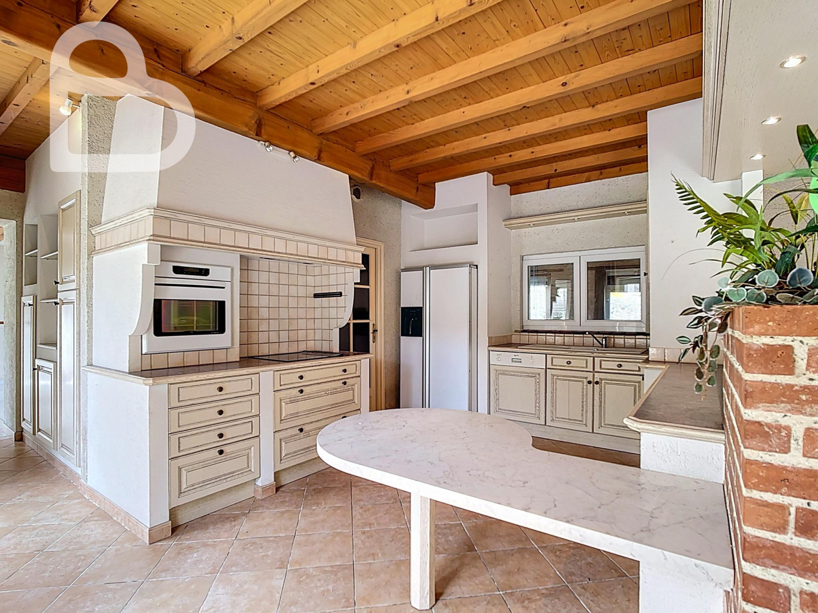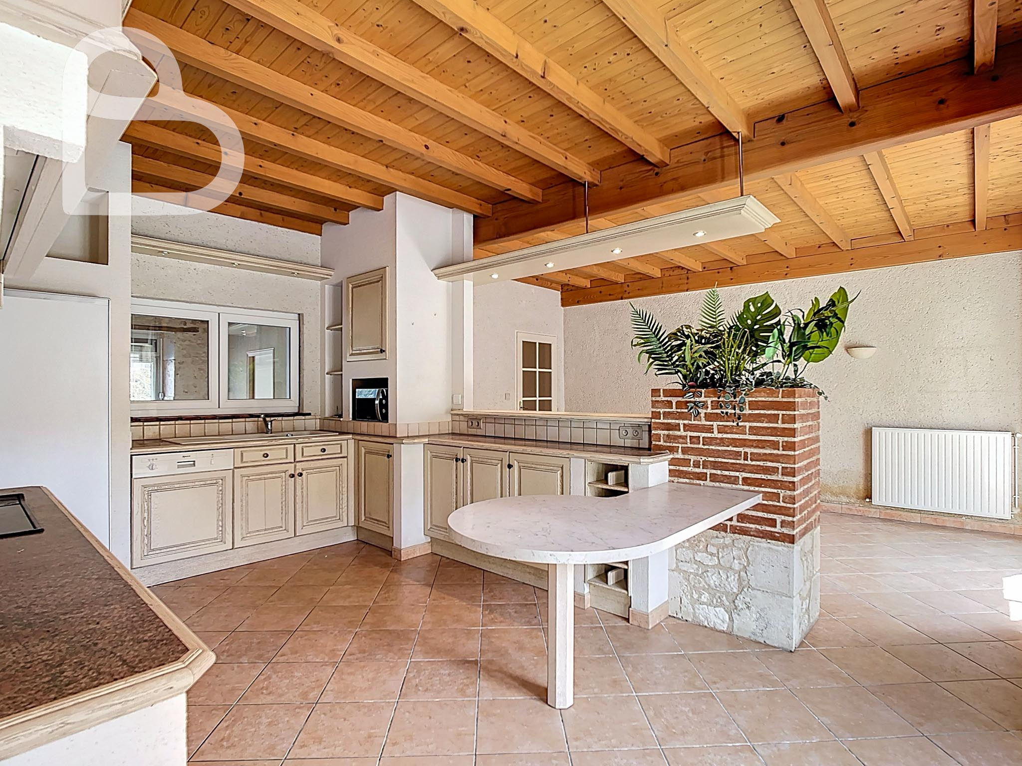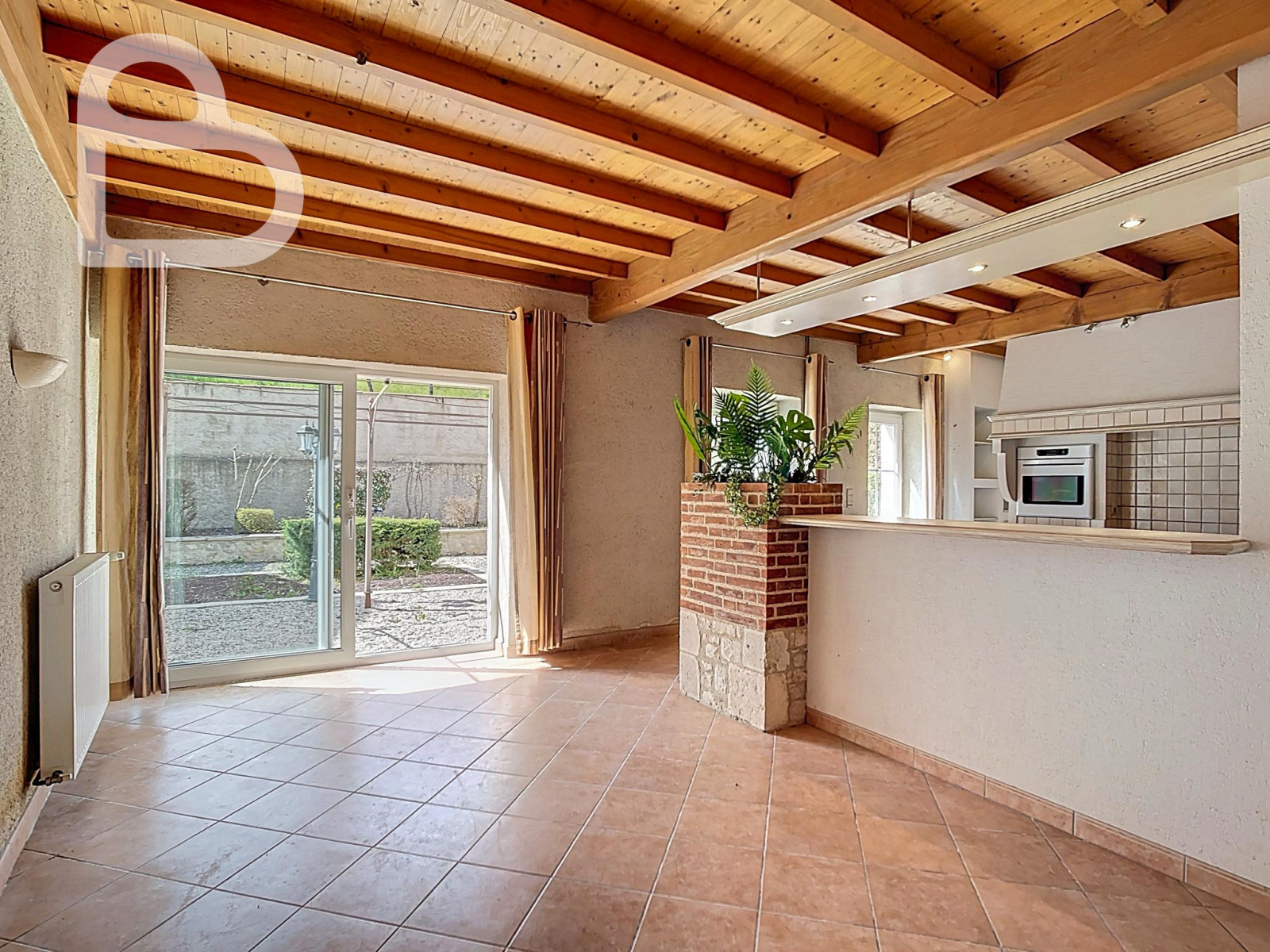 Elle dispose d'un séjour spacieux et lumineux, ainsi que d'une grande cuisine avec accès direct au jardin. L’espace extérieur est un véritable atout : un vaste jardin orienté plein sud avec, à l’arrière, une vue dégagée sur la verdure et la nature, une combinaison rare en plein centre du village. Un garage indépendant complète l'ensemble.