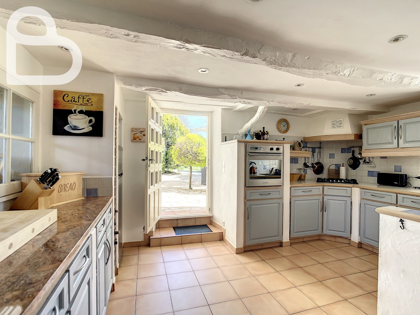 La cuisine entièrement équipée au rez-de-chaussée s'ouvre sur une terrasse ensoleillée. À côté de la cuisine se trouve un salon avec un poêle à bois intégré. À l'arrière, un salon/salle à manger bénéficiant d'une abondante luminosité grâce aux fenêtres sur toute la longueur de la pièce. Une porte-fenêtre donne sur la terrasse et la piscine.Â
