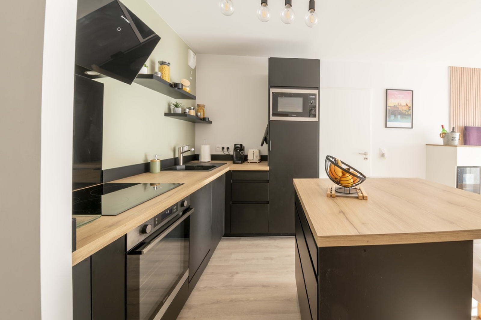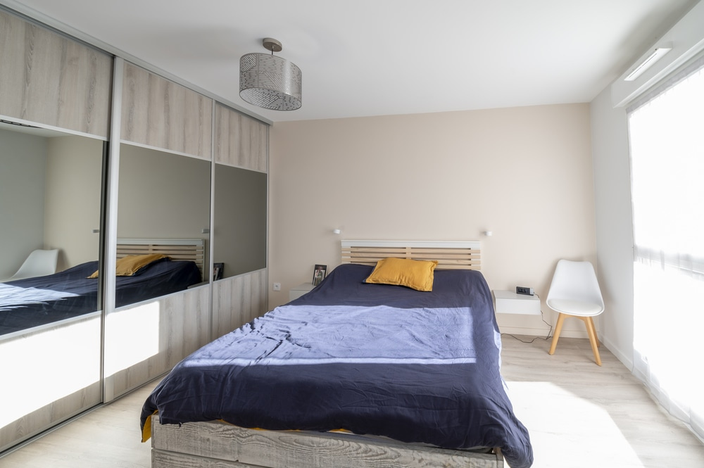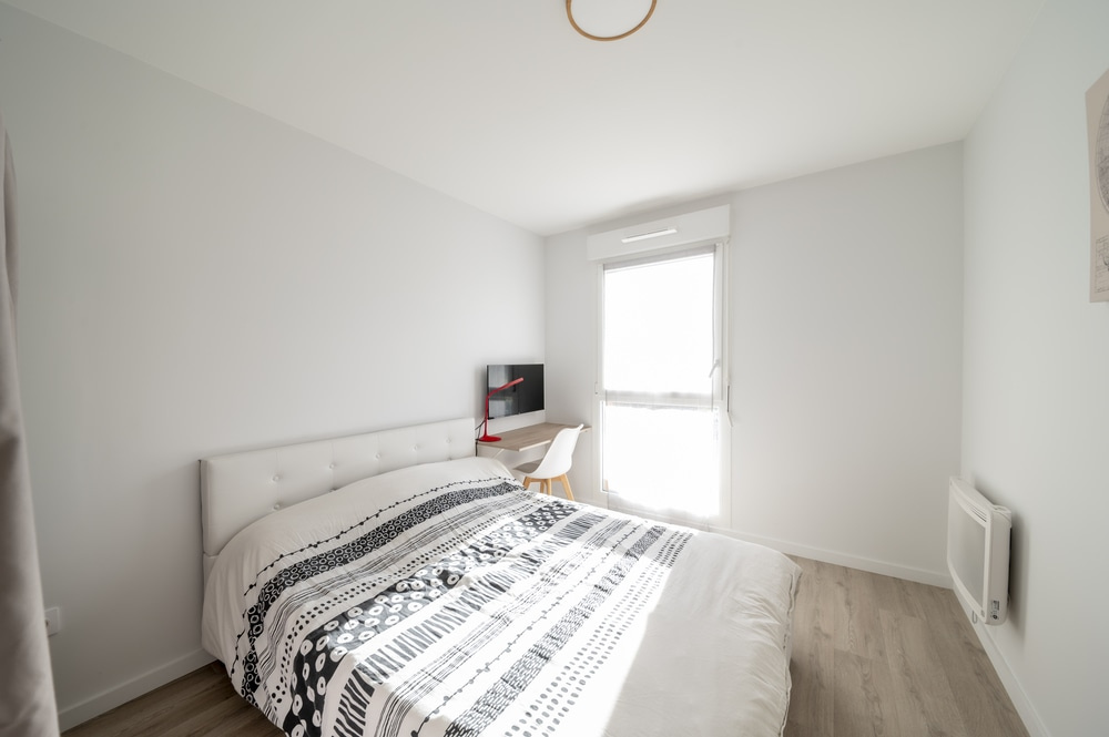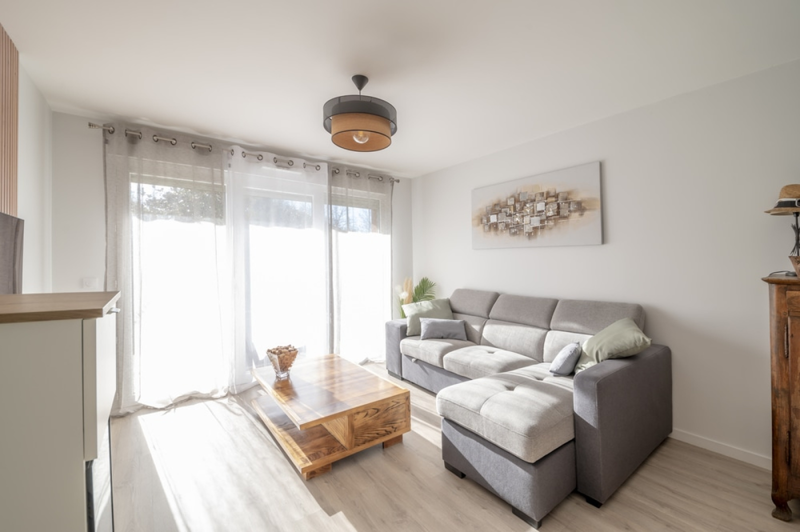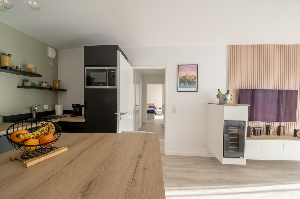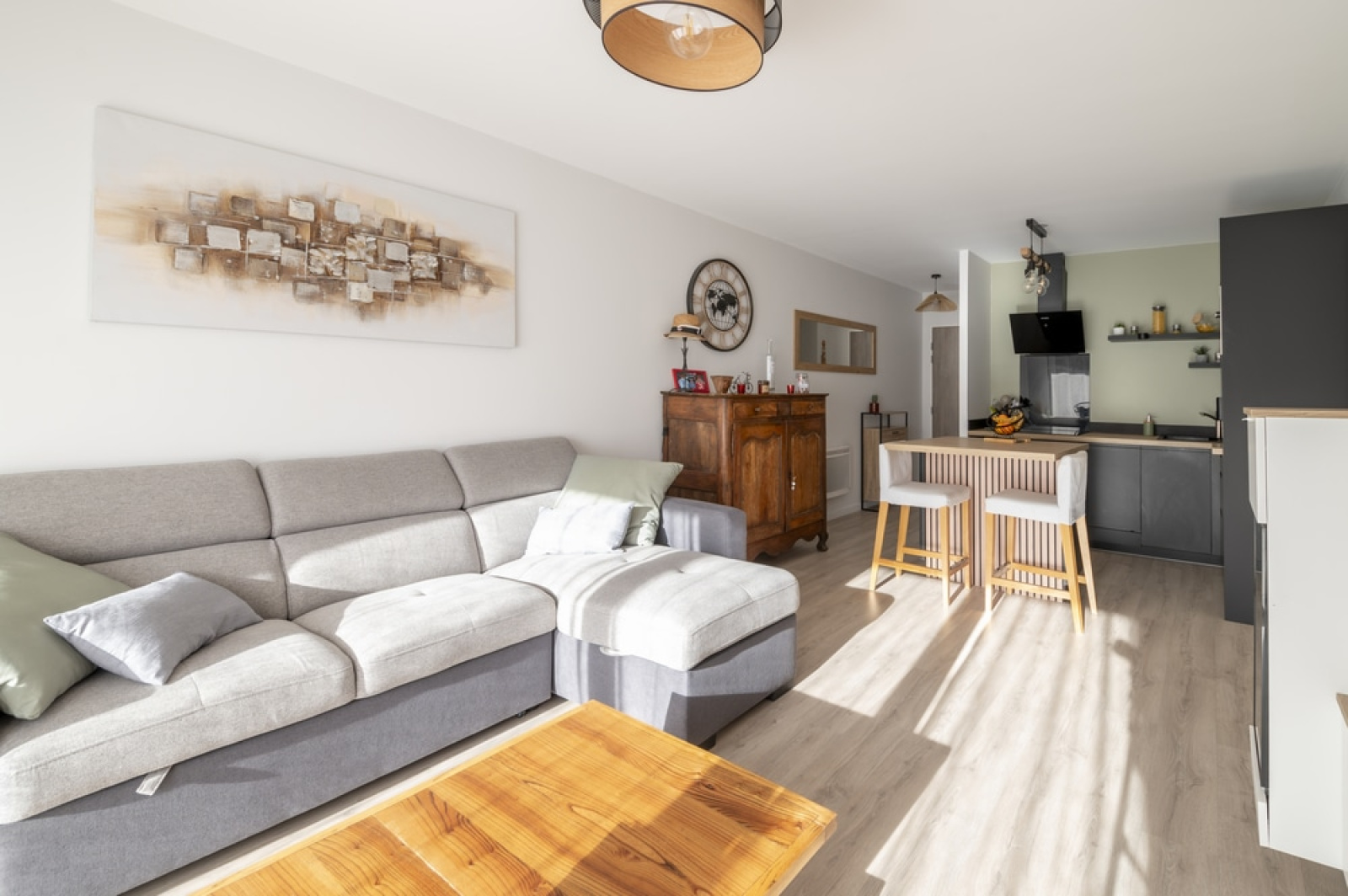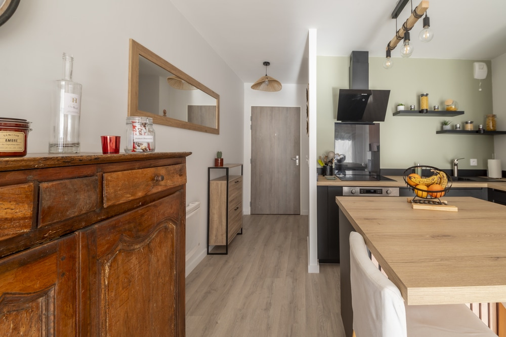 Il est composé d'une entrée, d'un cellier, d'une pièce de vie avec cuisine ouverte meublée et équipée, d'une salle d'eau, d'un toilette séparé et de deux chambres.