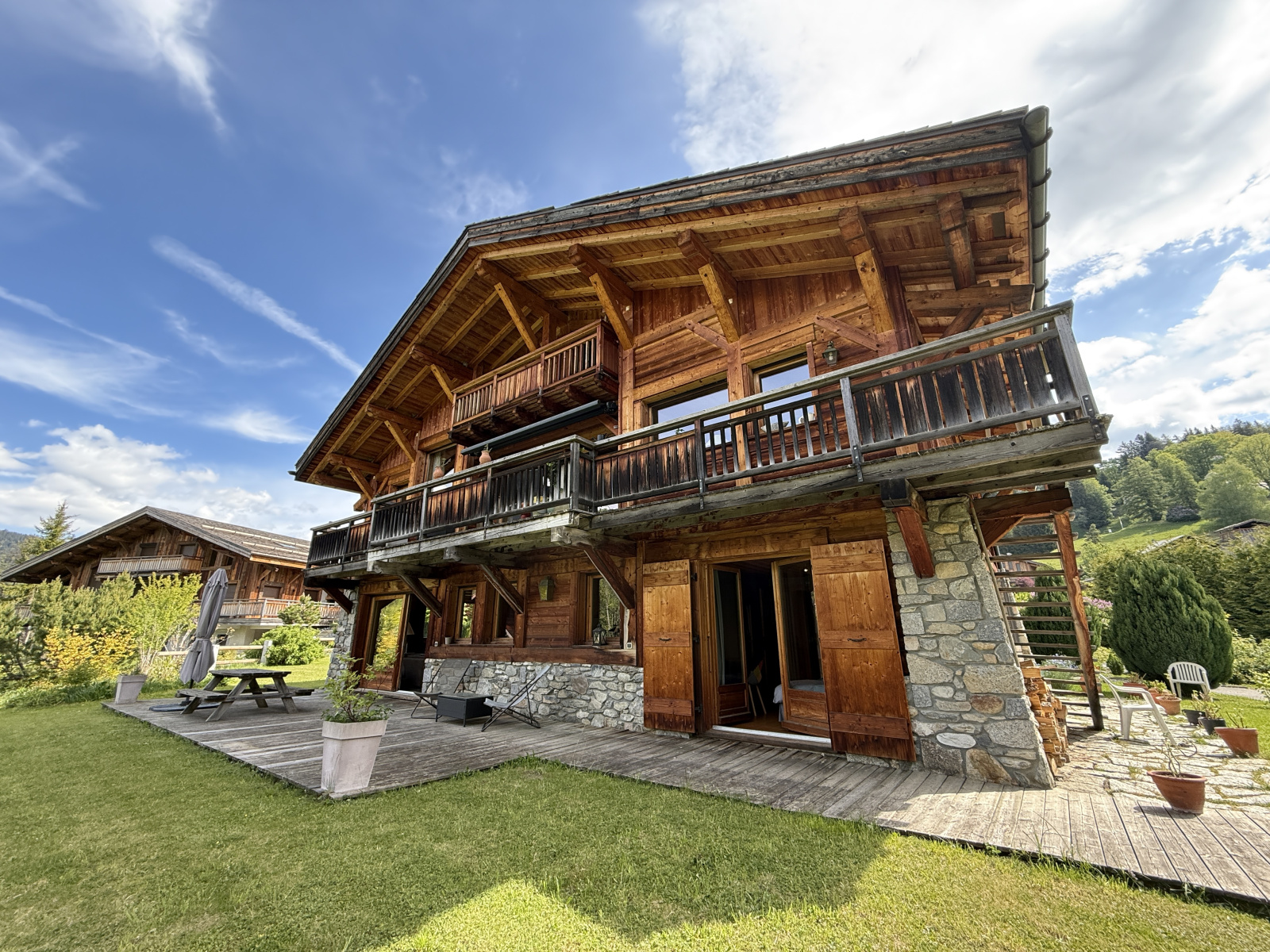 Dans un beau Chalet très familial de seulement 2 appartements, grand rez-de-jardin idéalement et exceptionnellement bien situé à courte distance de la place du village, 3 chambres pour une surface d'environ 100 m2, bénéficiant d'une terrasse de 45 m2 et d'un jardin privatif d'environ 230 m2, orienté Sud-Ouest.
