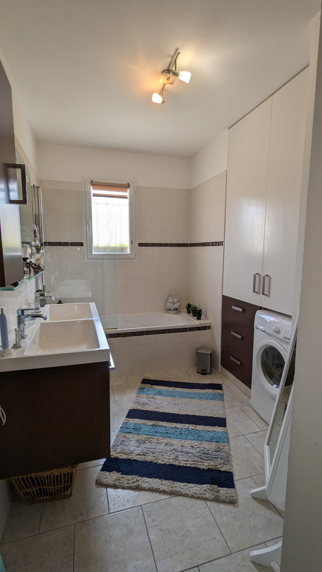 Salle de bains équipée d'un meuble double vasque, ainsi que de rangements.