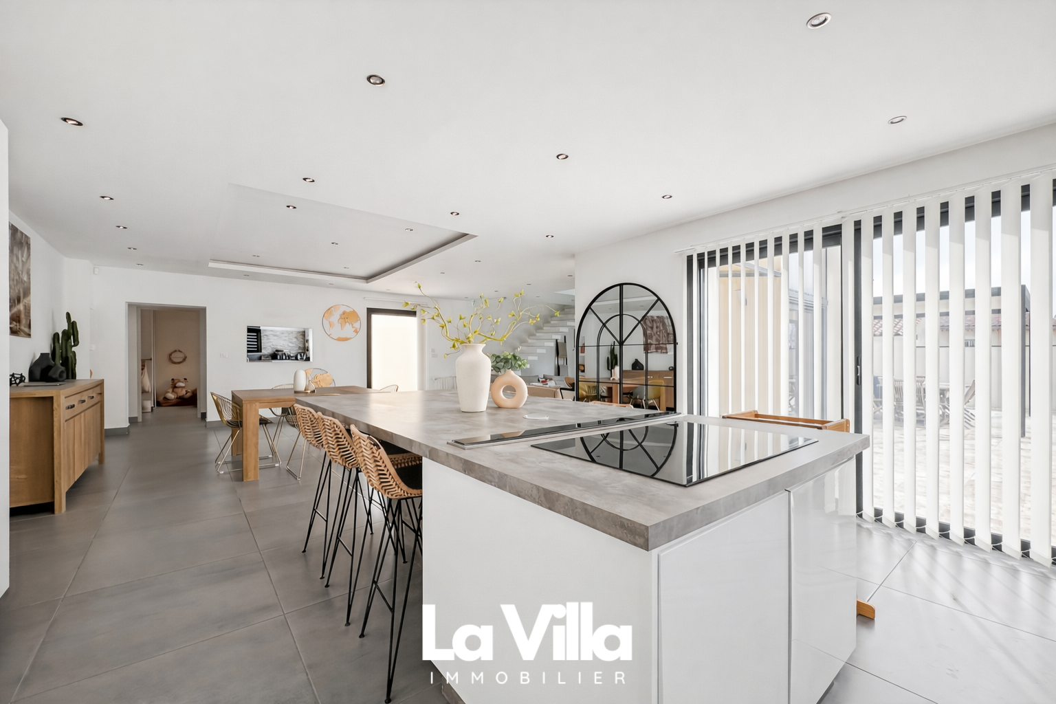 Dès l'entrée, la maison dévoile une pièce de vie spectaculaire, baignée de lumière, avec une belle hauteur sous plafond et de larges ouvertures sur l'extérieur. La cuisine, résolument moderne, s'intègre harmonieusement à l'espace de réception, idéal pour recevoir en toute convivialité.