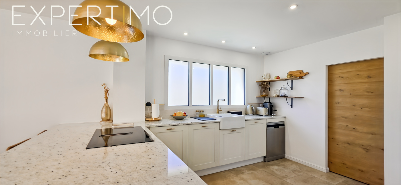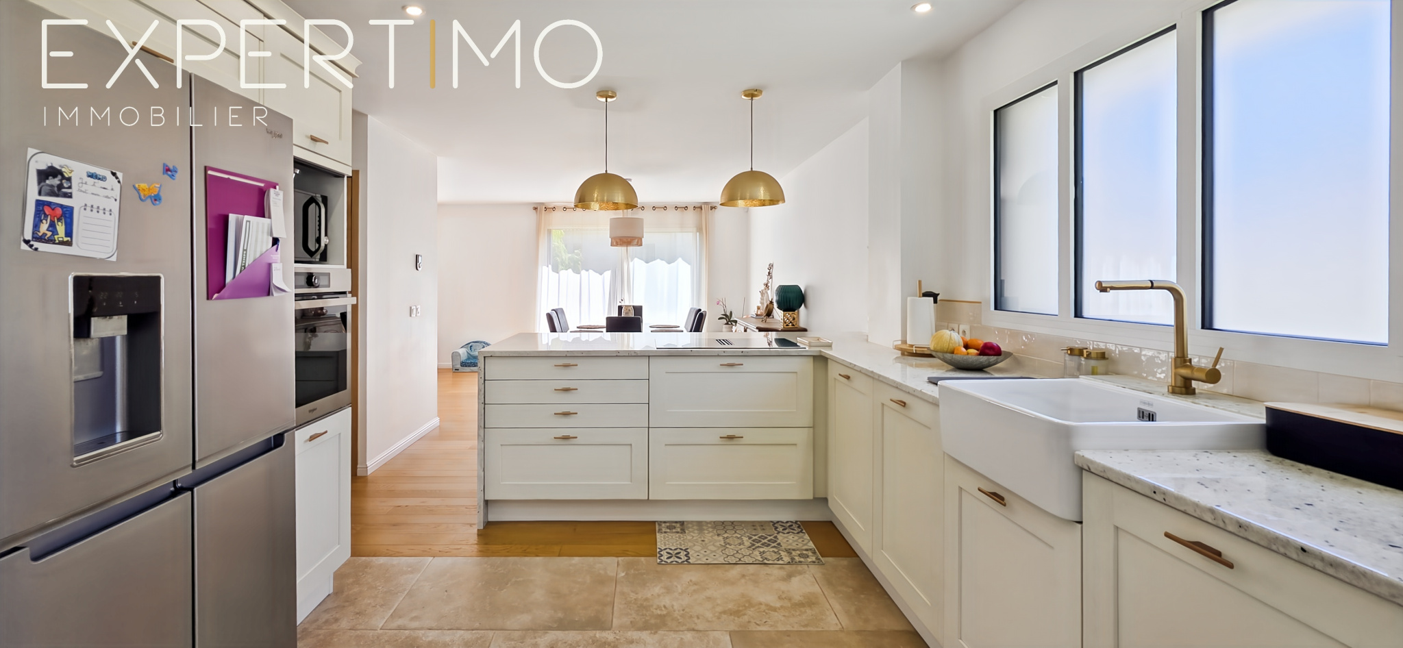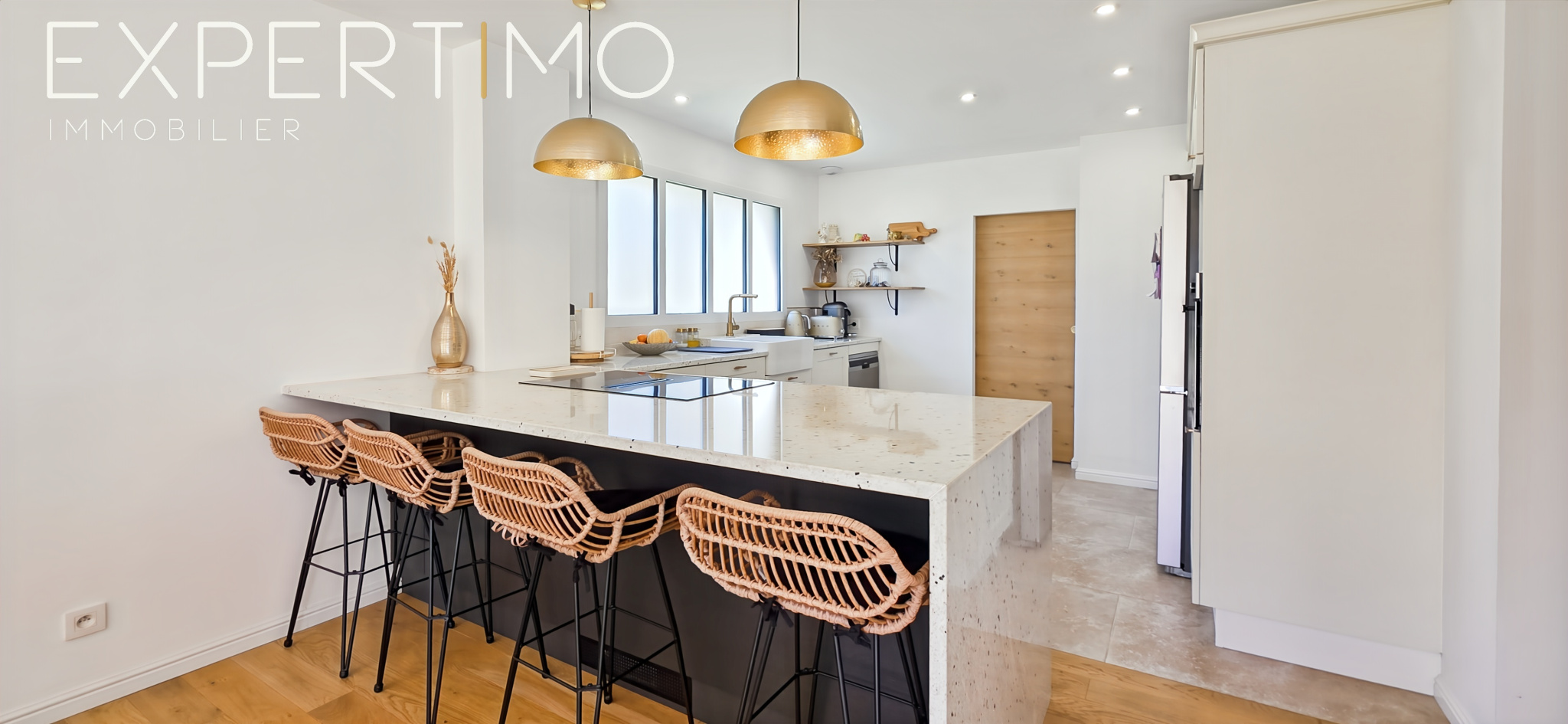 Dès l’entrée, les volumes et la luminosité séduisent immédiatement. La pièce de vie développe une surface totale de 50 m², composée d’un espace salon/séjour de 35 m² et d’une cuisine ouverte aménagée et équipée avec plan de travail en pierre blanche de 15 m², le tout baigné de lumière grâce à trois larges baies vitrées.