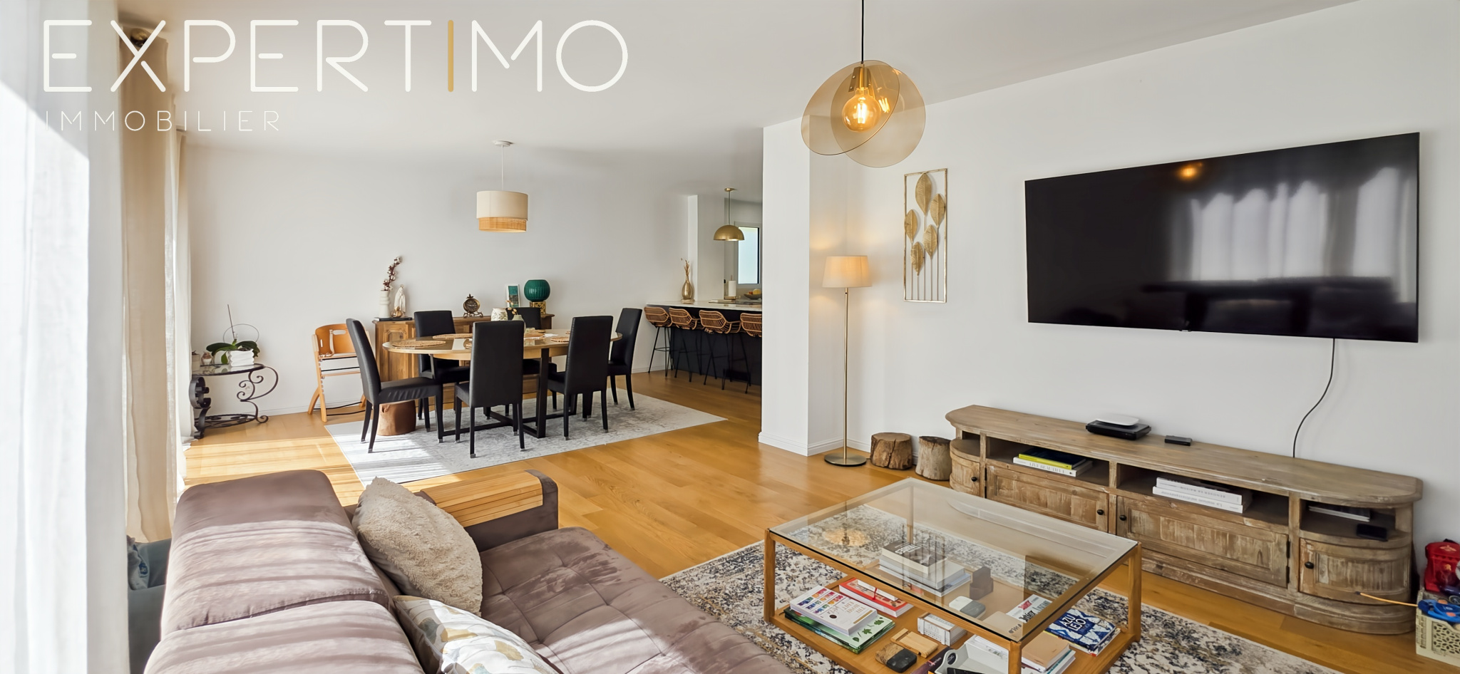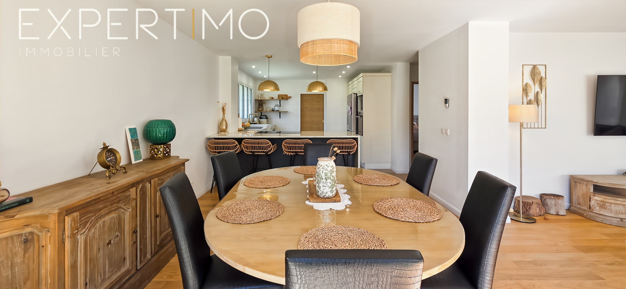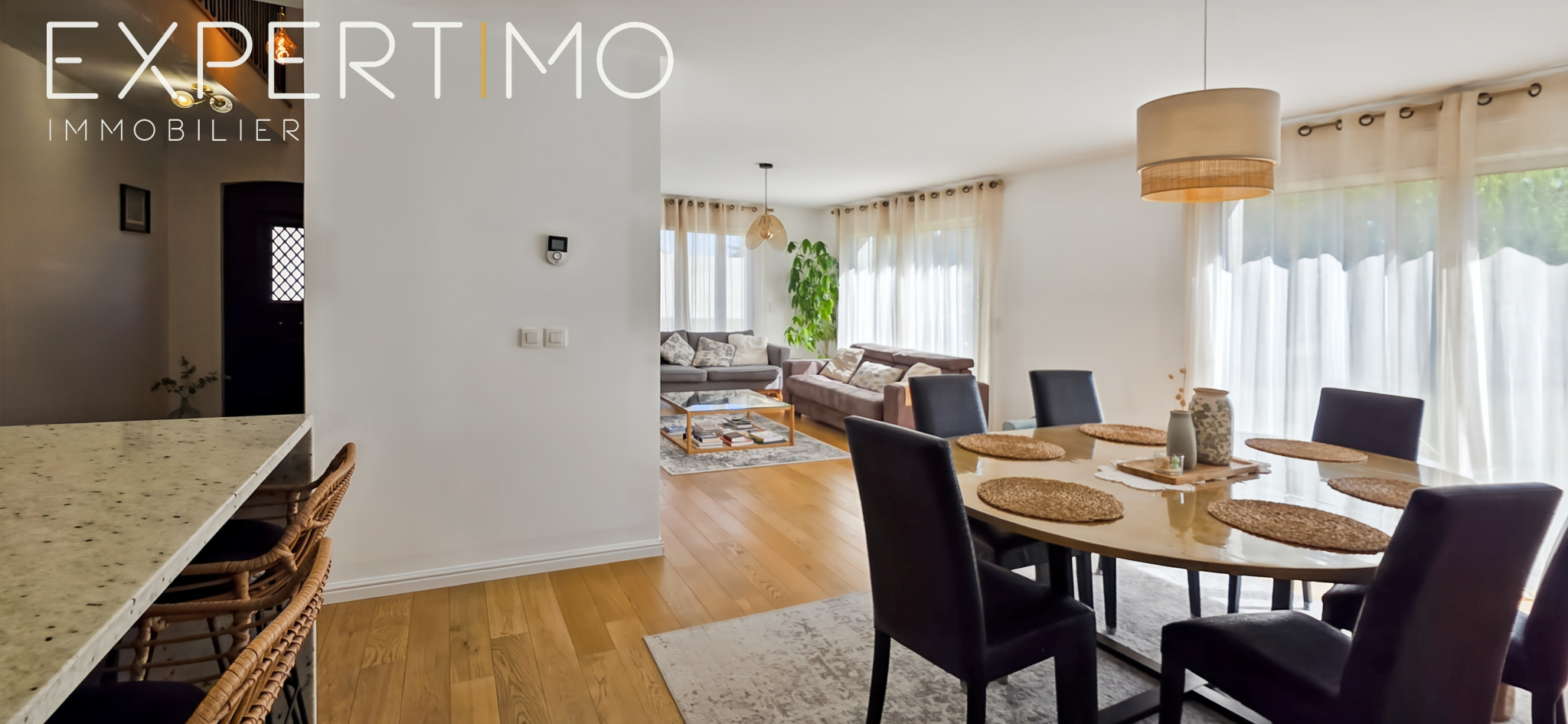 Dès l’entrée, les volumes et la luminosité séduisent immédiatement. La pièce de vie développe une surface totale de 50 m², composée d’un espace salon/séjour de 35 m² et d’une cuisine ouverte aménagée et équipée avec plan de travail en pierre blanche de 15 m², le tout baigné de lumière grâce à trois larges baies vitrées.