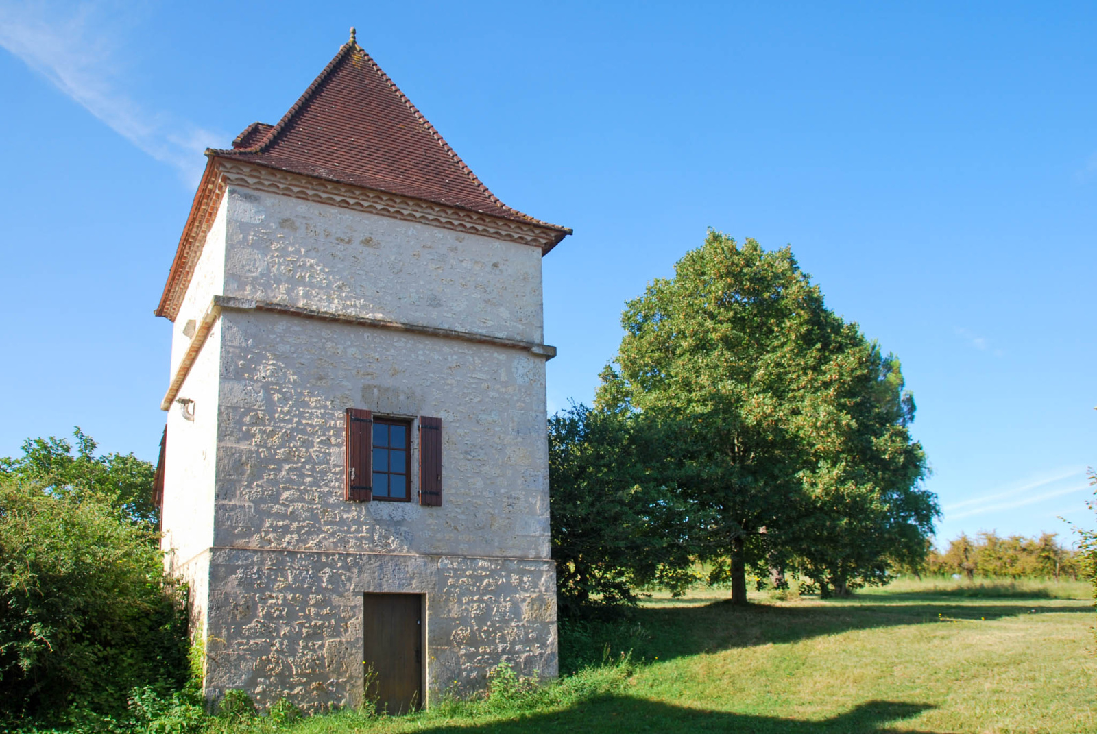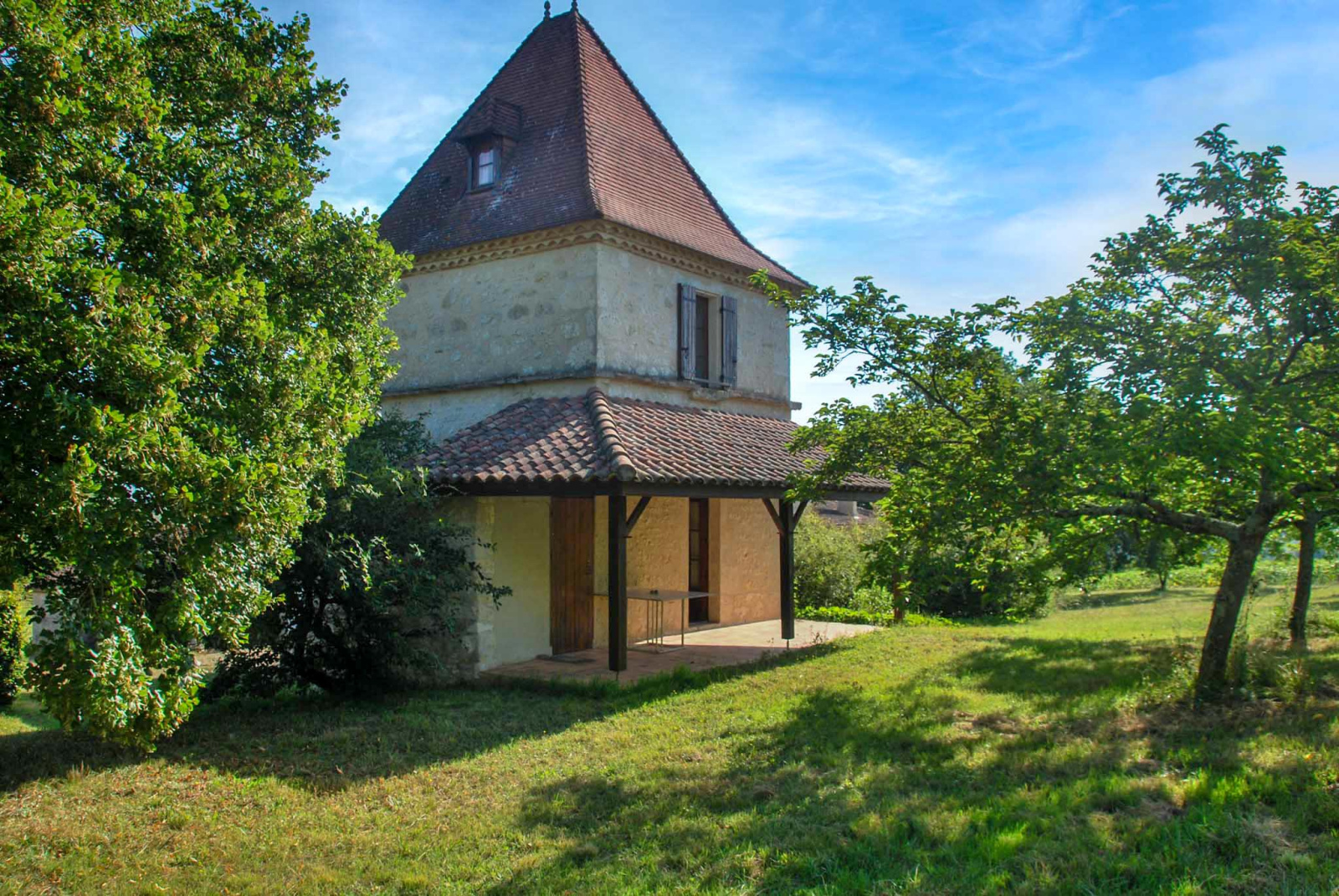 Le pigeonnier, un peu plus loin dans le jardin, a été transformé en gîte. Il comprend une pièce de rangement, une terrasse couverte, un coin salon avec cuisine et une chambre sur les deux étages.
