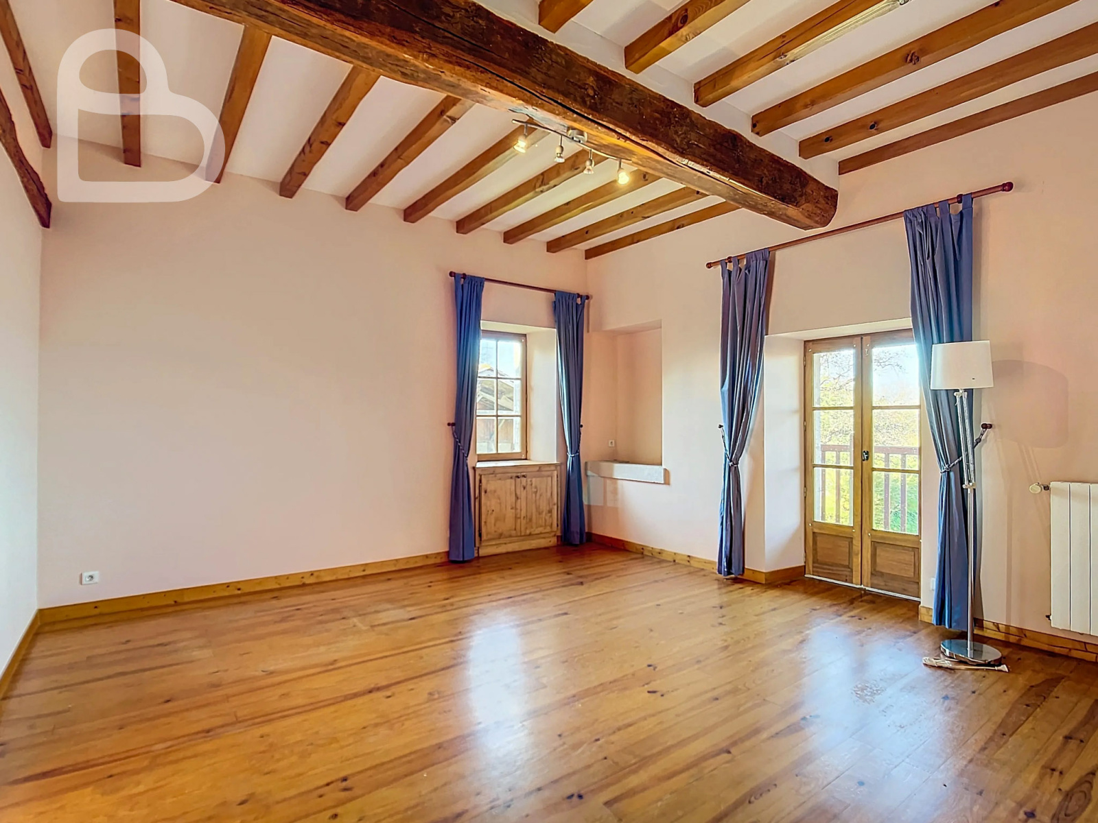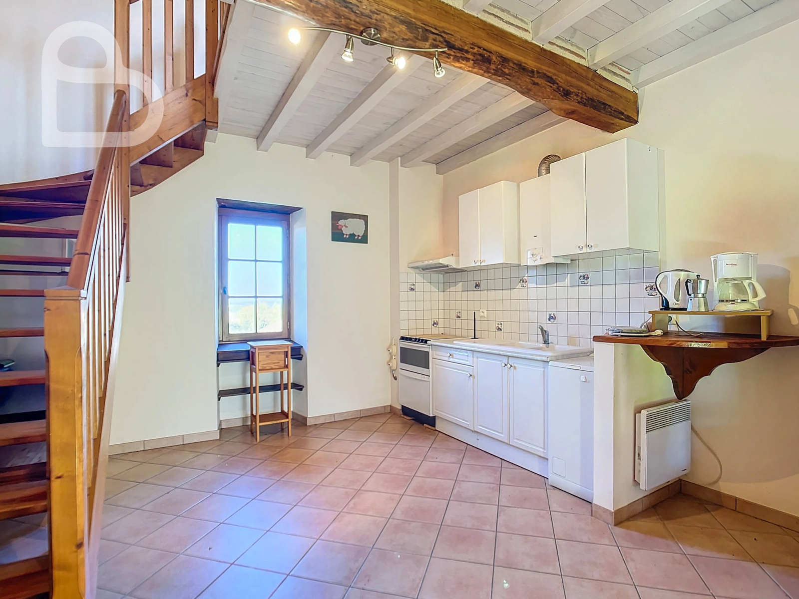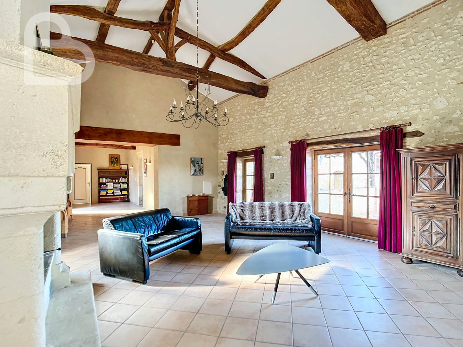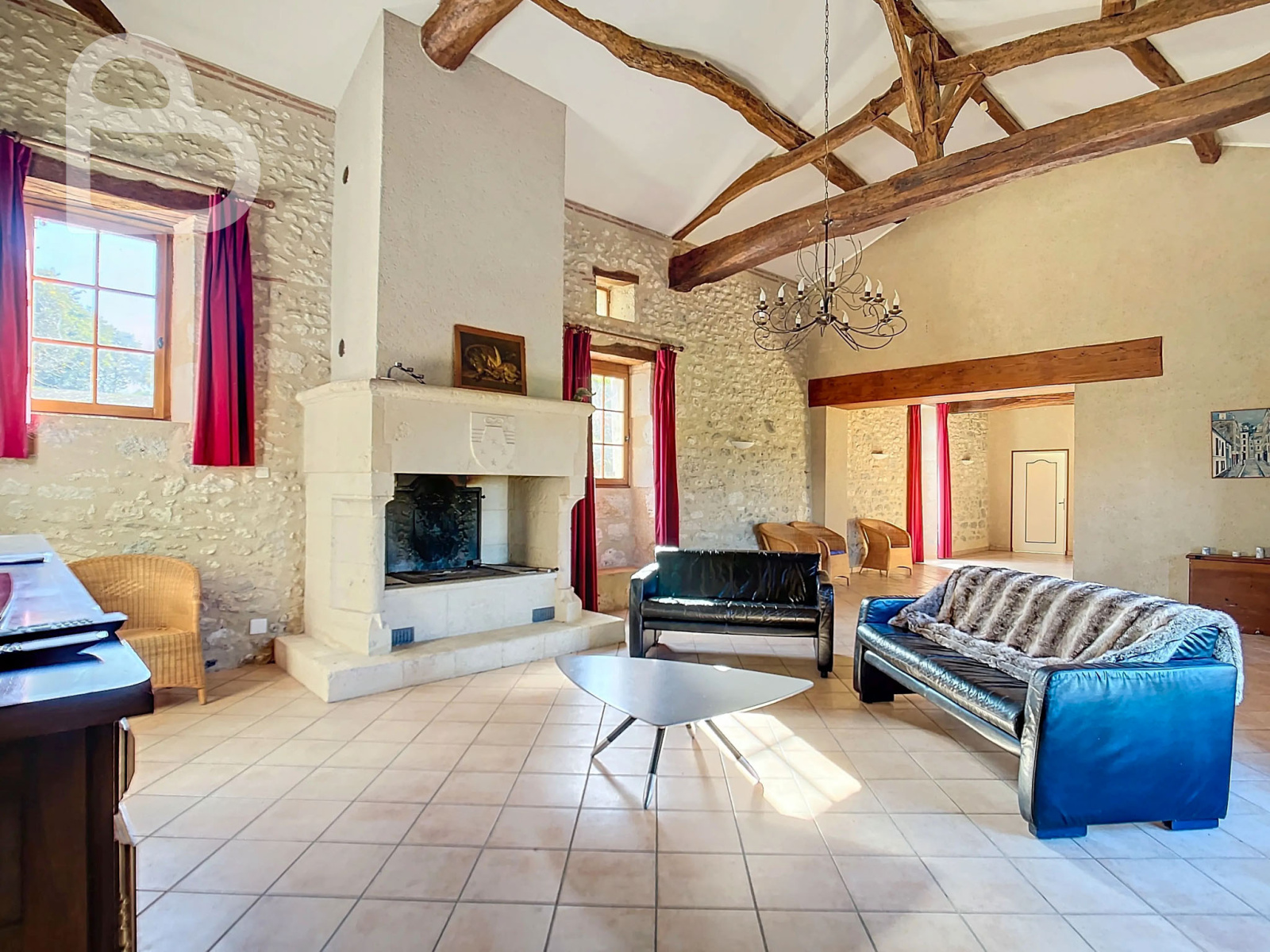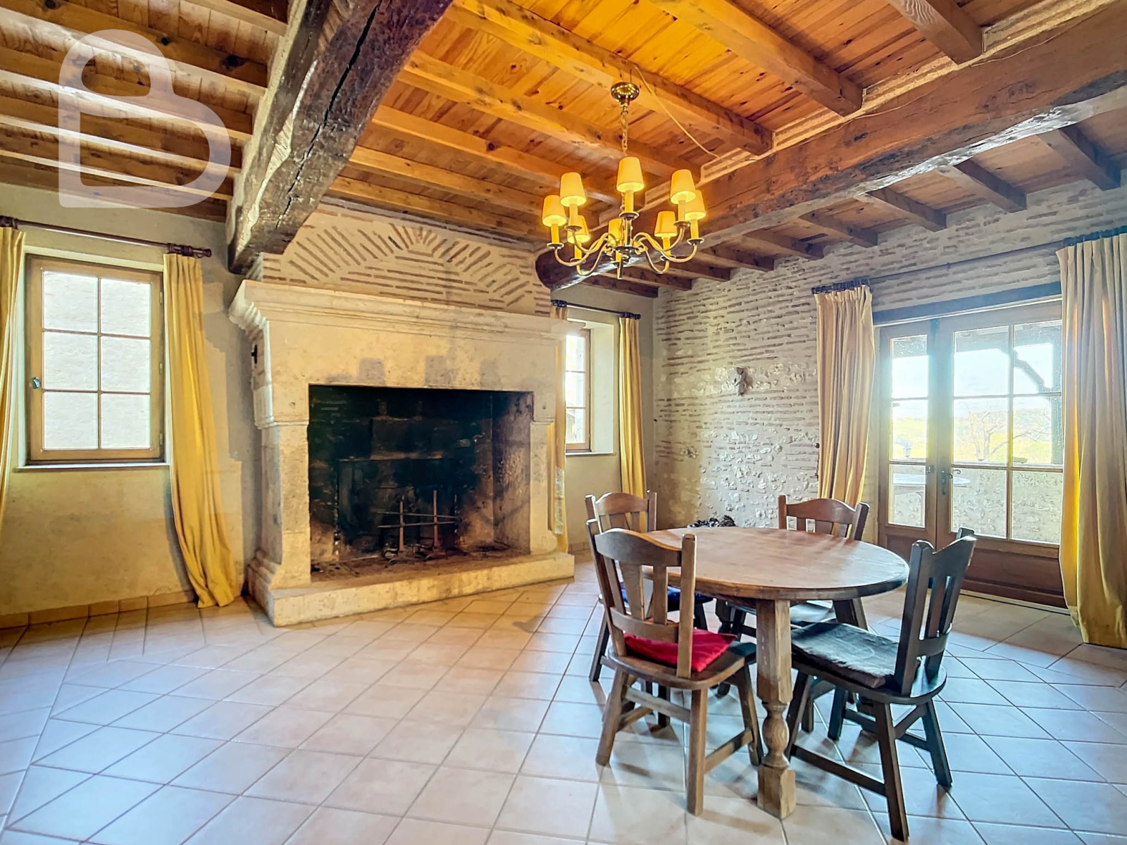 Dans le salon, avec ses hauts plafonds et ses poutres apparentes, se trouve une impressionnante cheminée avec un poêle Polyflam. La salle à manger possède également une belle cheminée. Une porte-fenêtre donne accès à la terrasse partiellement couverte.