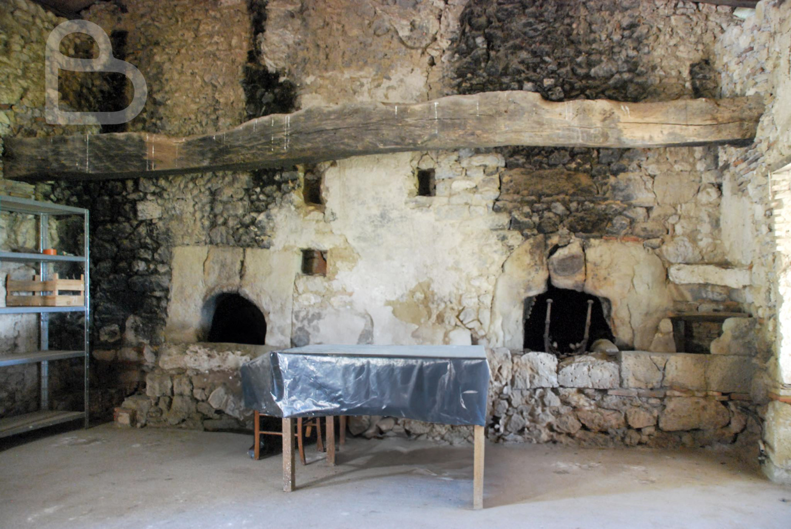 Dans l'une des granges de la propriété se trouvent deux fours à pain en pierre. Autrefois, des repas étaient servis dans la maison. Cela explique les grands volumes du rez-de-chaussée de cette maison de caractère, avec une grande cuisine, un cellier, une salle à manger et un salon très spacieux avec bibliothèque, ainsi qu'un bloc sanitaire attenant.