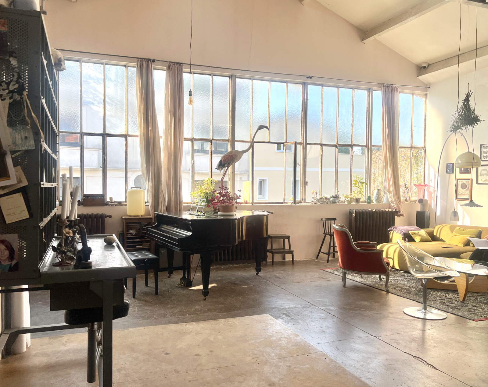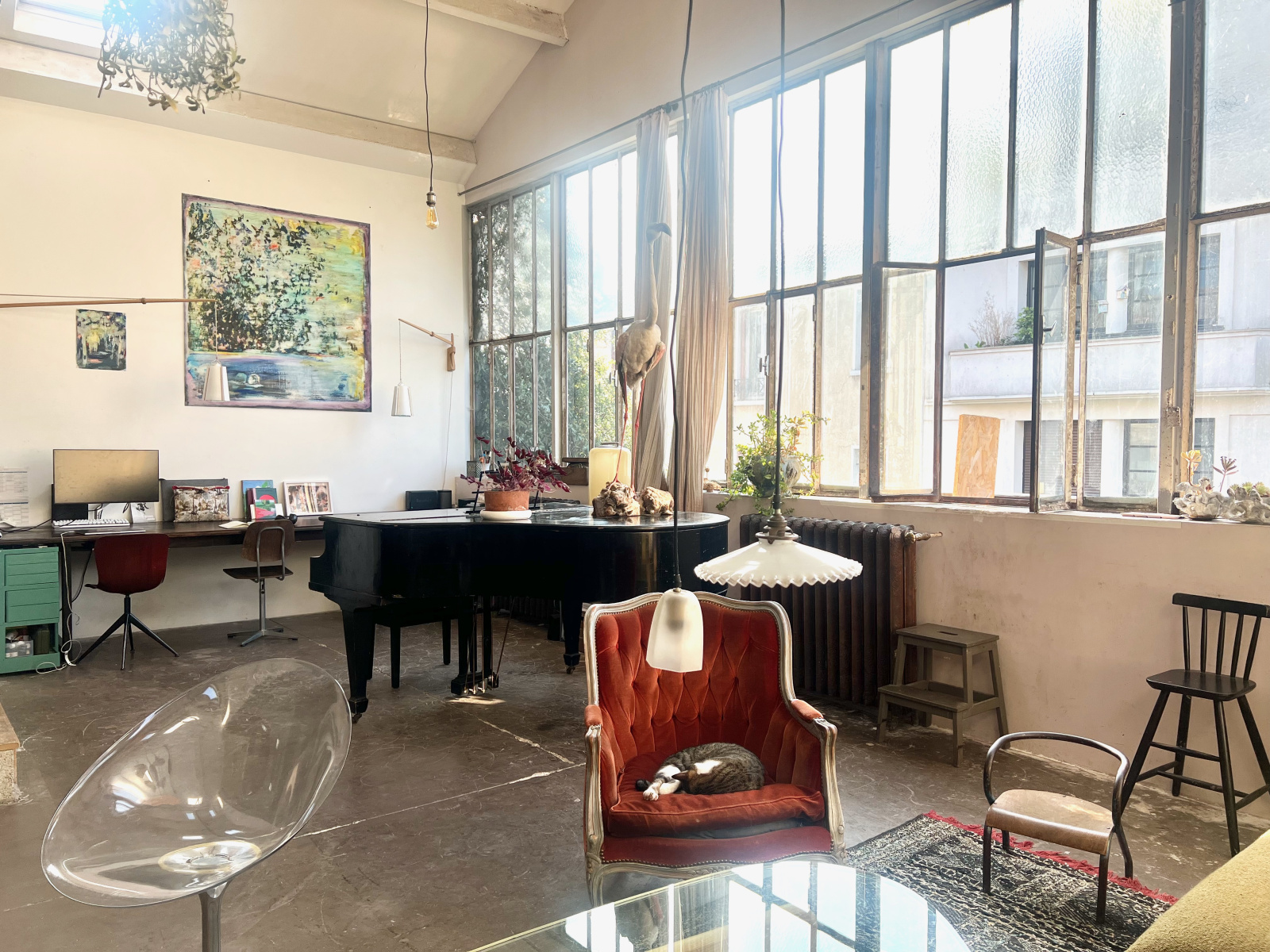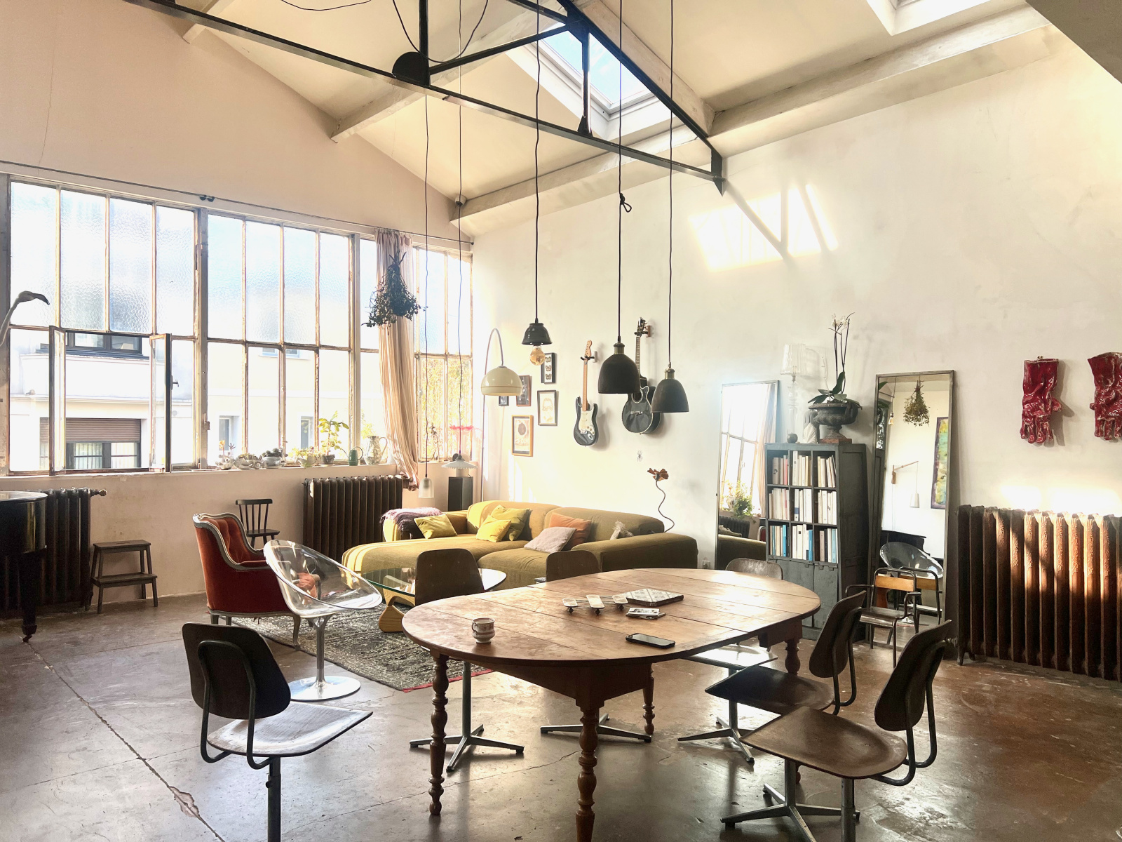 A 700 mètres du métro (Croix de Chavaux L 9), proche de toutes les commodités (commerce, parc, écoles, etc), dans un quartier champêtre très recherché de Montreuil, bâtiment esprit industriel entièrement repensé et rénové en 2014 avec un splendide appartement type loft en duplex avec terrasse et un atelier en RDC . L’entrée se fait par un grand atelier donnant accès par un escalier à un grand loft d’habitation de deux niveaux (161 m2) avec terrasse (10 m2). Au 1er niveau : une immense pièce de vie de 78 m2 aux très beaux volumes (salon, repas, bureau et cuisine), illuminée (plein Sud) par de larges baies vitrées style atelier, une suite parentale avec son dressing, sa salle d’eau et WC privés. Au second niveau : 2 belles chambres dont l’une avec balcon, une pièce dressing, une grande salle de bain et un WC. Bien en copropriété horizontale (de sol) composée de deux lots.