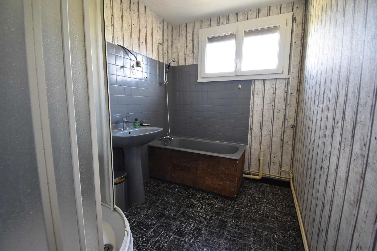 Une Cuisine non équipée, un séjour/salon de 23 m² suivi d’un bureau, trois chambres de 14,18 et 16 m², une chaufferie, une salle de bain avec douche et baignoire et pour terminer ce niveau un WC séparé.