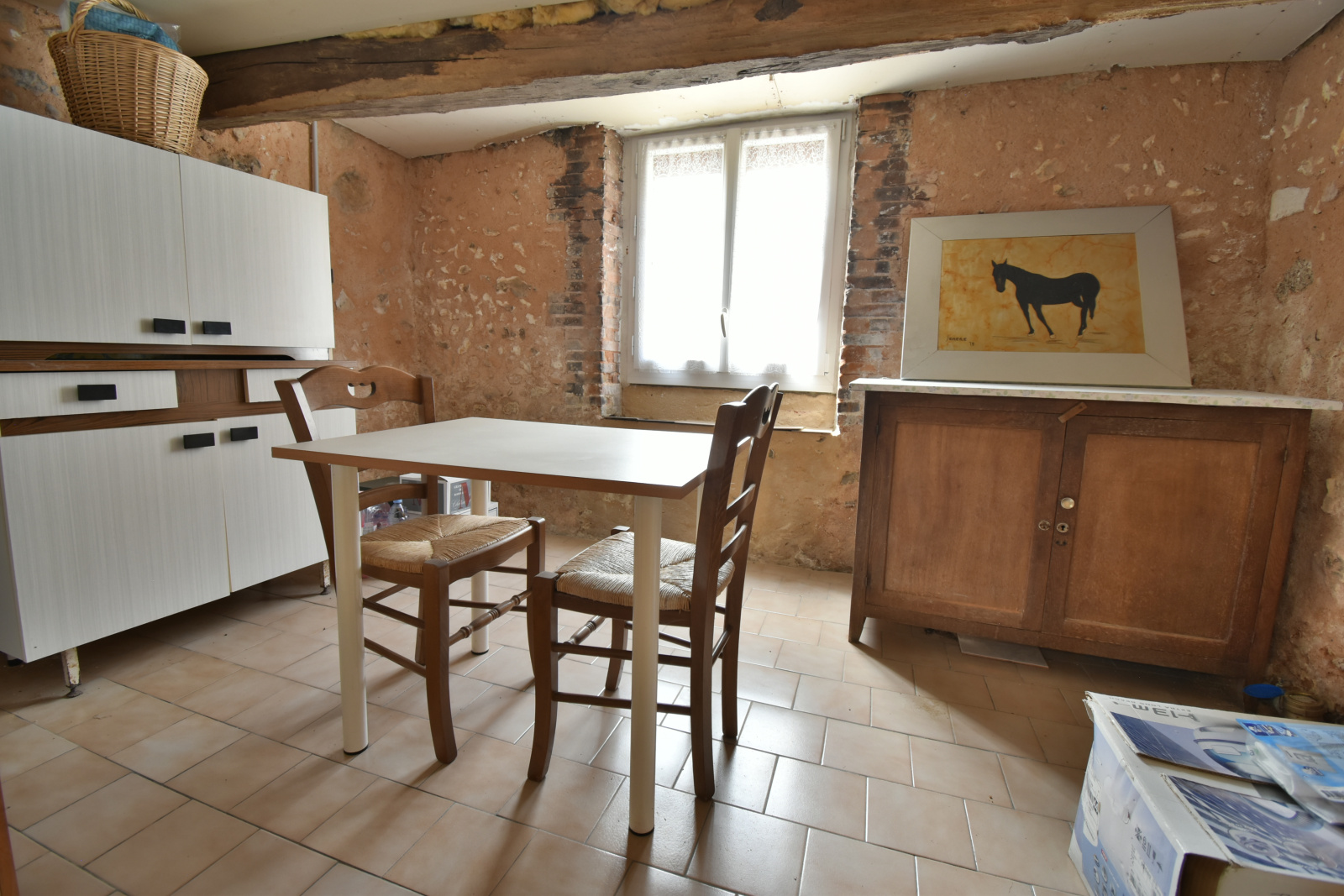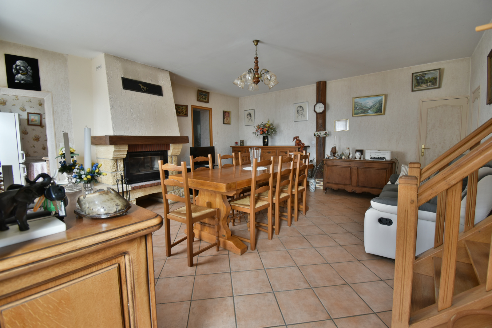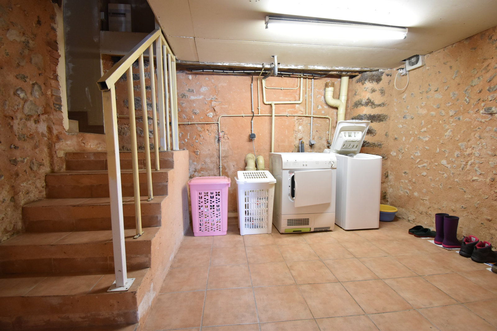 Une entrée donnant dans la pièce à vivre dotée d’une cheminée à insert, une cuisine séparée, aménagée et équipée suivie d’une arrière-cuisine avec accès extérieur coté route, un WC séparé, une cave avec pièce annexe.