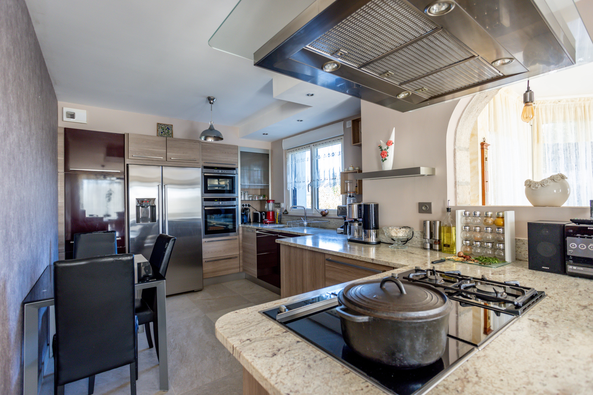 La cuisine sur mesure, pensée comme un espace de réception, bénéficie d’un équipement complet (four vapeur, four chaleur tournante, plaques gaz et induction) et d’un plan de travail en granit Cachemire du Pakistan, alliant esthétisme et durabilité.
