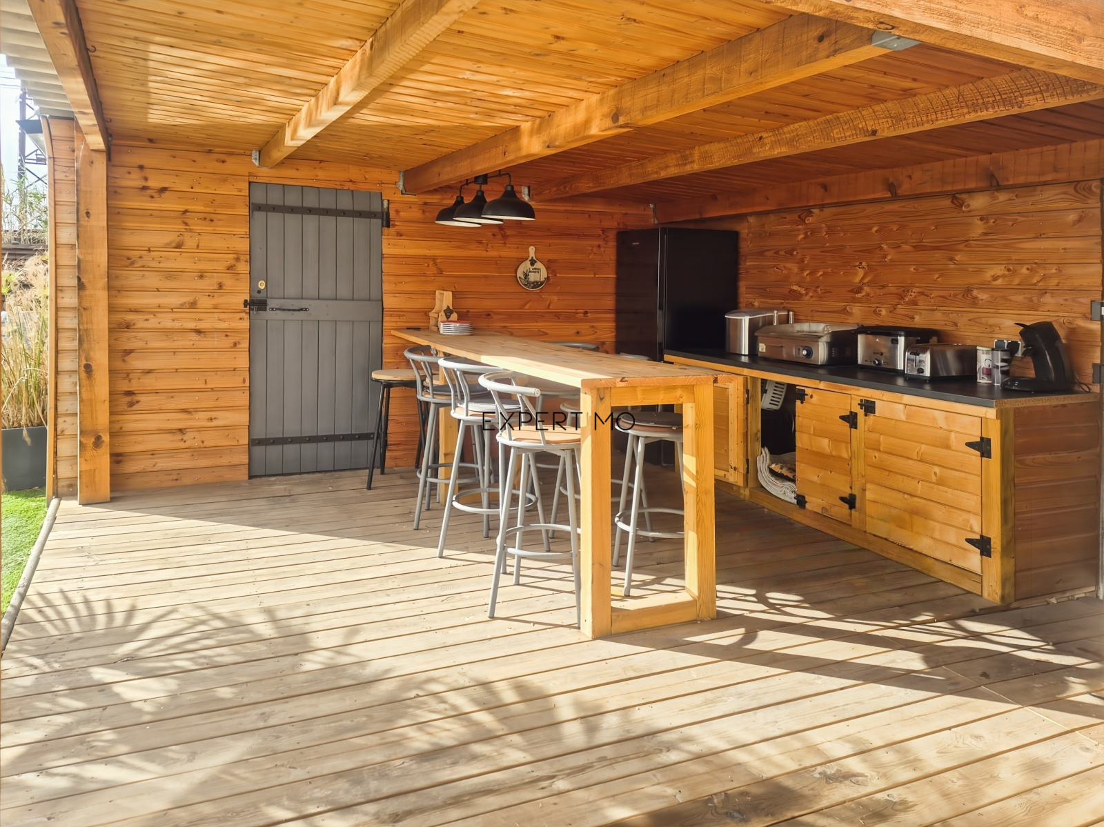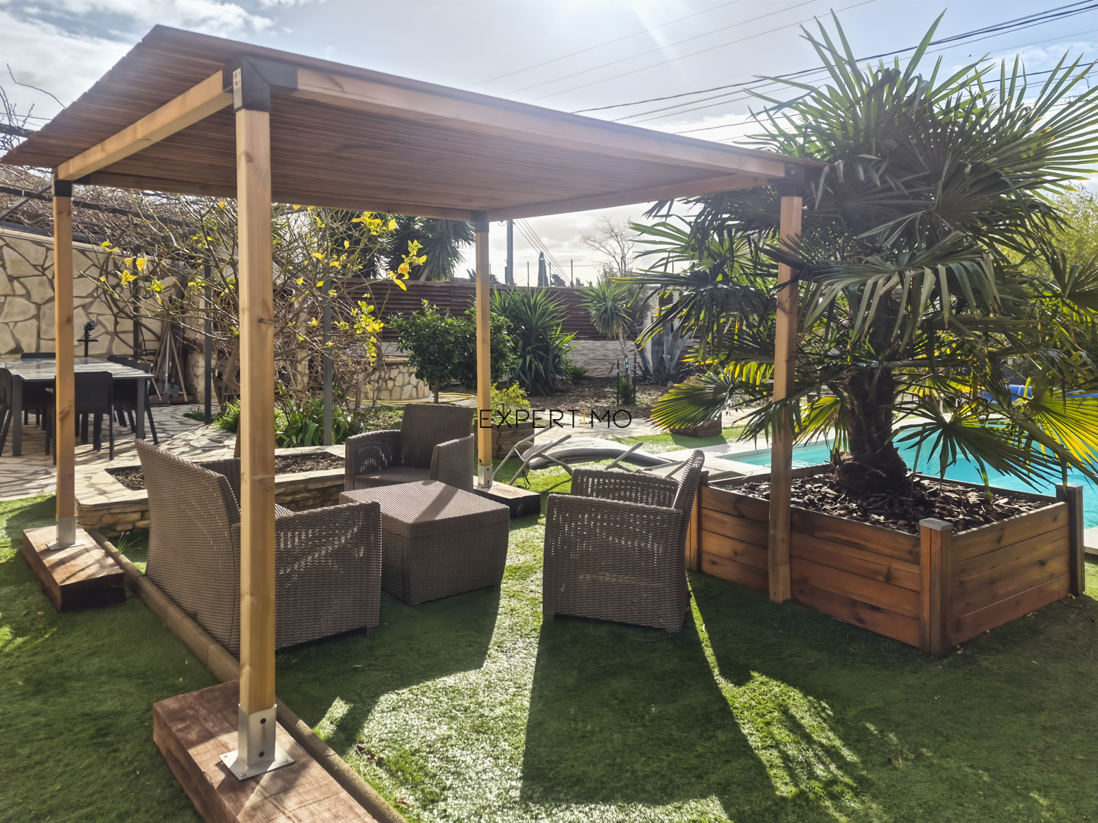 L'extérieur est aménagé avec un jardin arboré et tout confort, une belle terrasse, une piscine 5x3, une cuisine d'été abrité, un barbecue. Un puits privé.