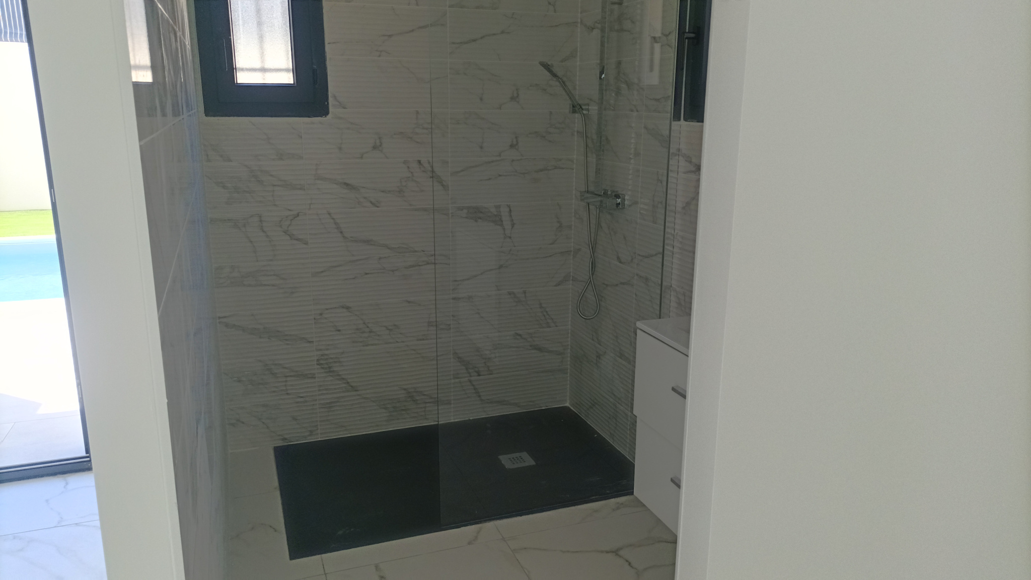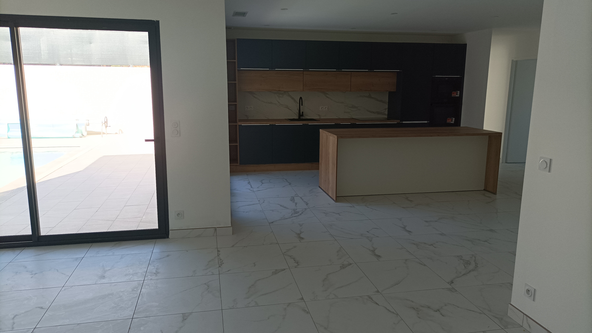 grand sejour cuisine de 57 m2cuisine haut de gamme avec electromenager, ilot central , beaucoup de rangements avec baie vitrée donnant sur une terrasse avec piscine ,3 chambres dont une suite parentale avec dressing et douche .