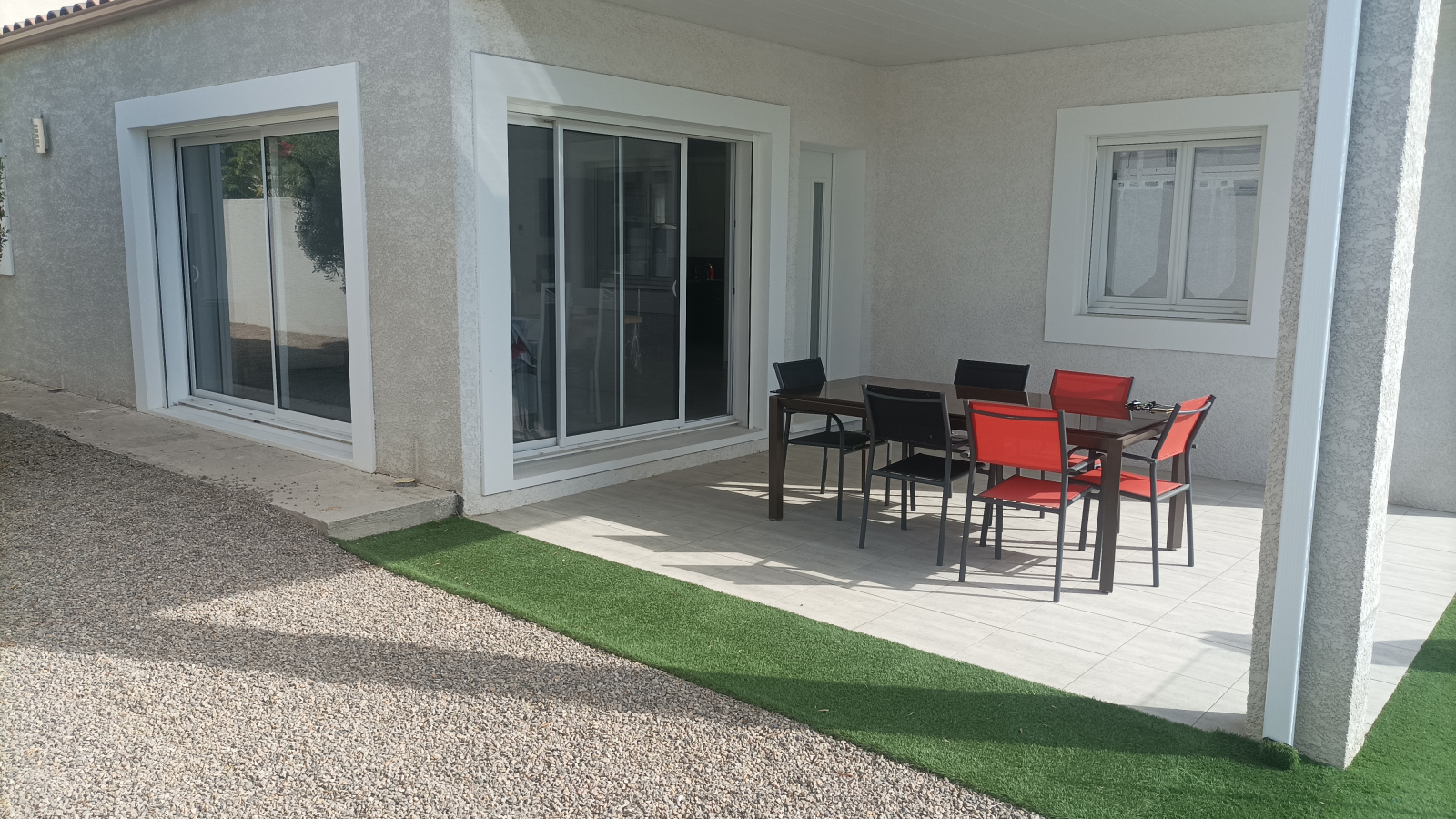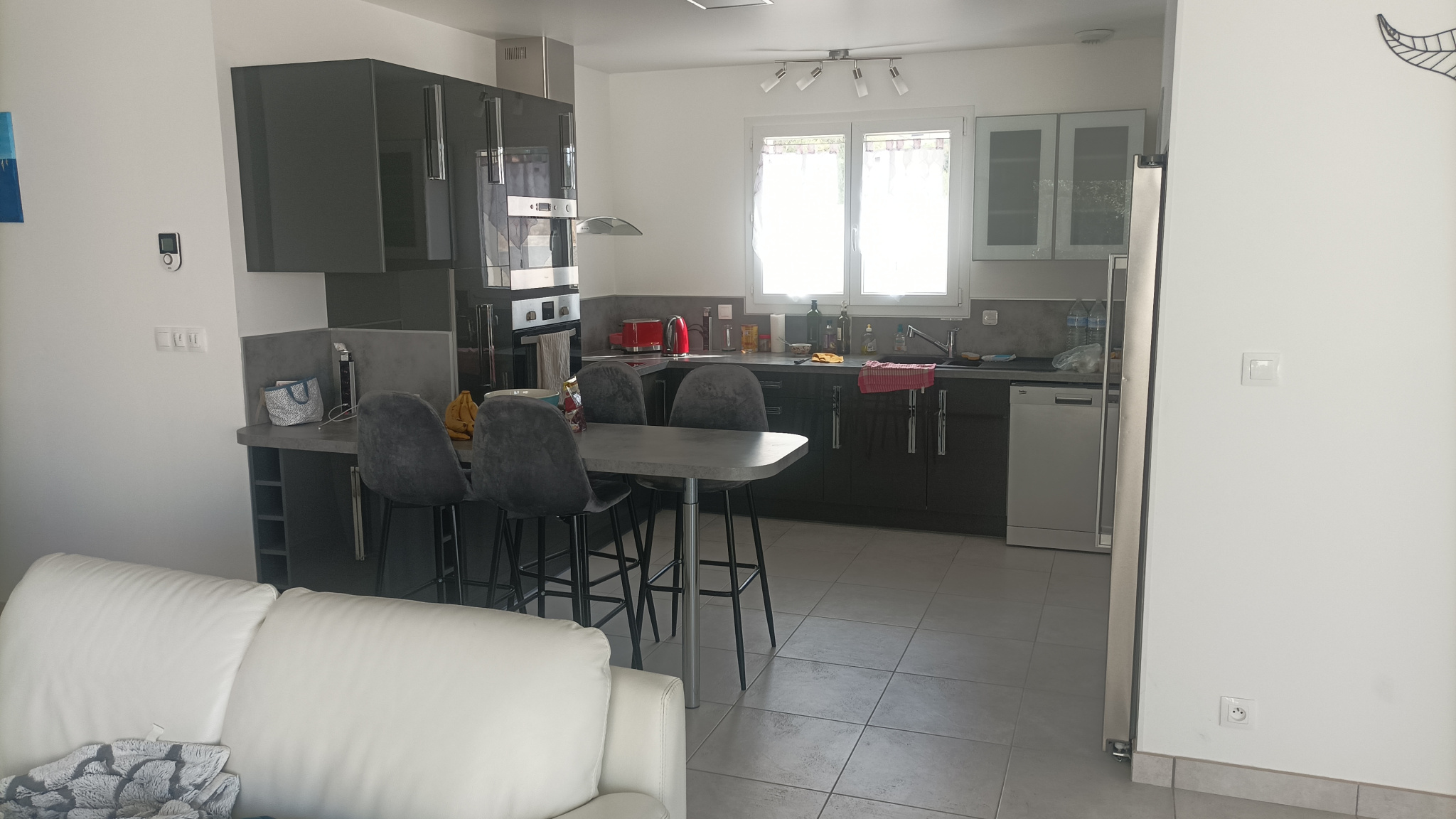 séjour cuisine très lumineux qui donne sur une belle terrasse , buanderie, 3 chambres avec placard, salle de bain avec baignoire et douche, wc , garage carrellé et avec une fenetre pouvant servir de piece.