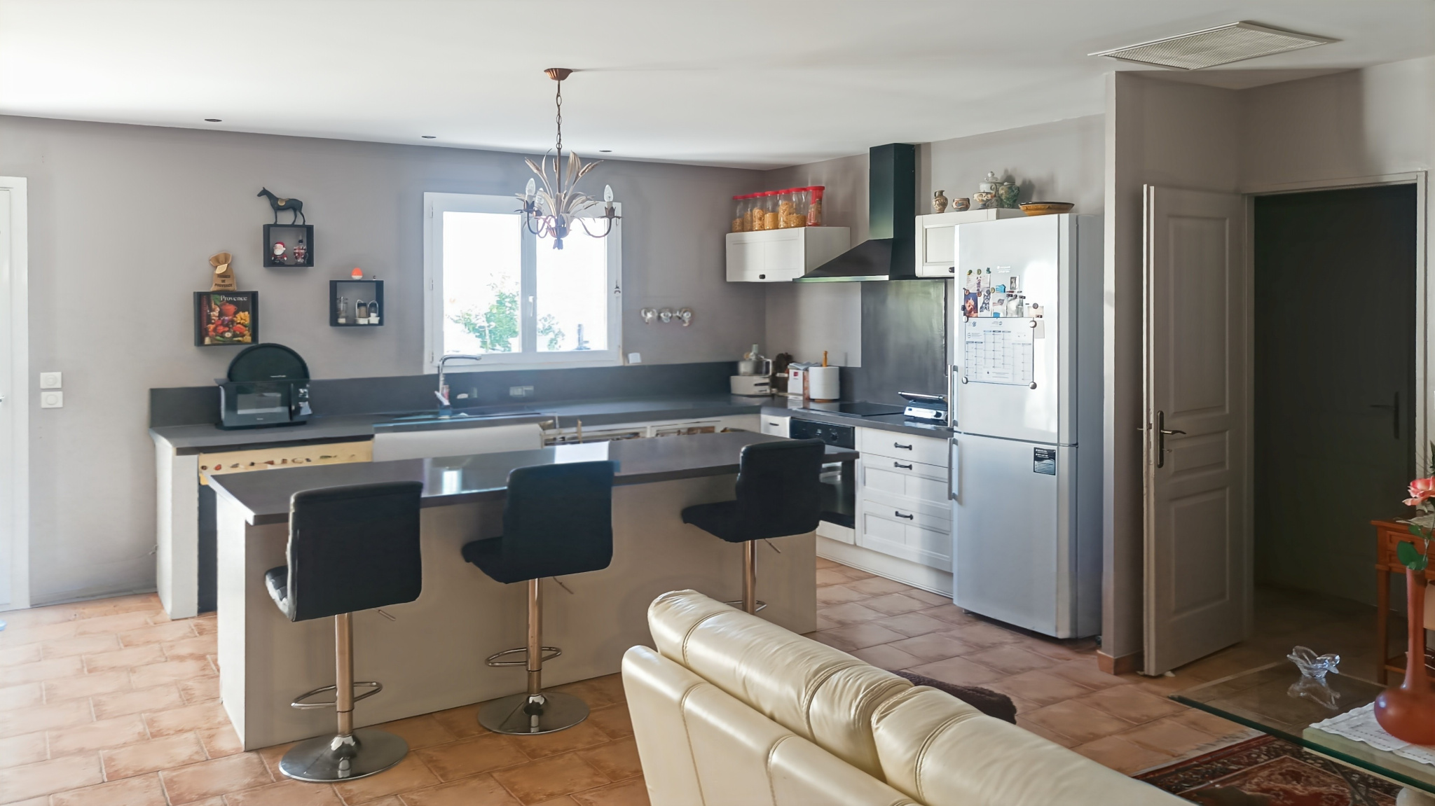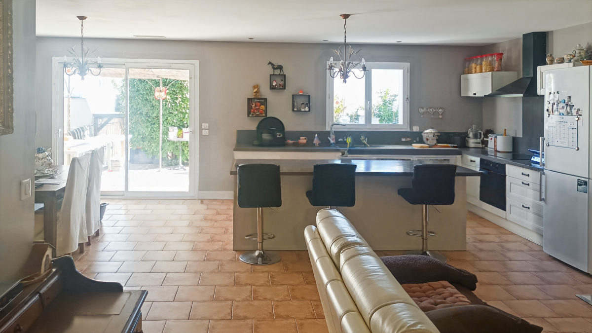 grand séjour cuisine de 50 m2 tres lumineux qui donne sur une magnifique terrasse ensoleillé avec piscine securisée.