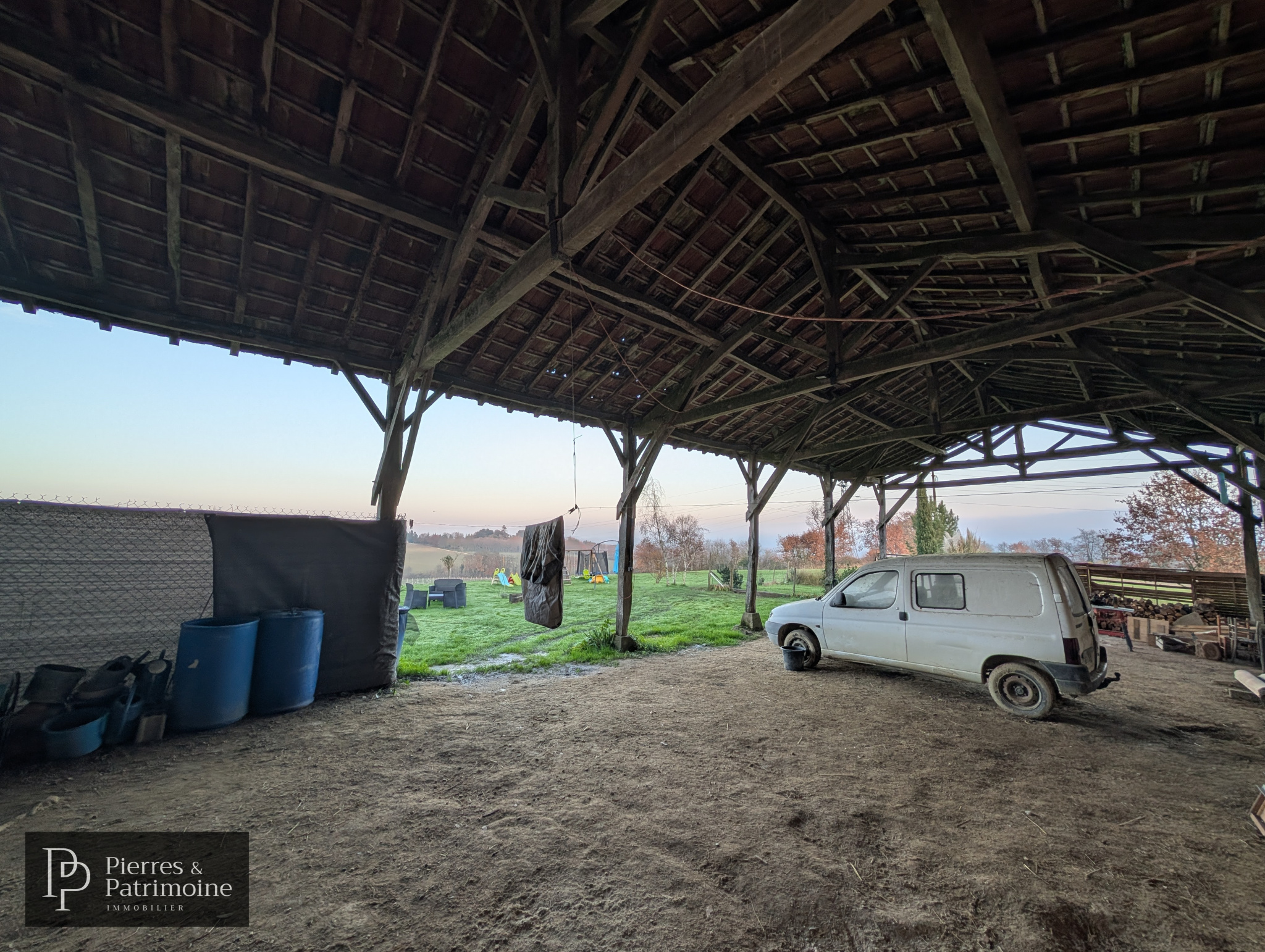 Un hangar d’environ 280 m², avec accès direct aux prés, est idéal pour un projet agricole, équestre ou pour l’accueil d’animaux.