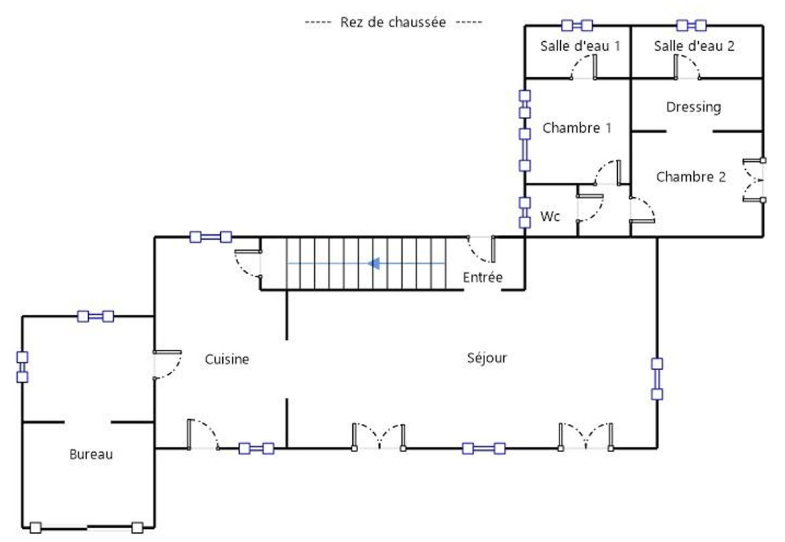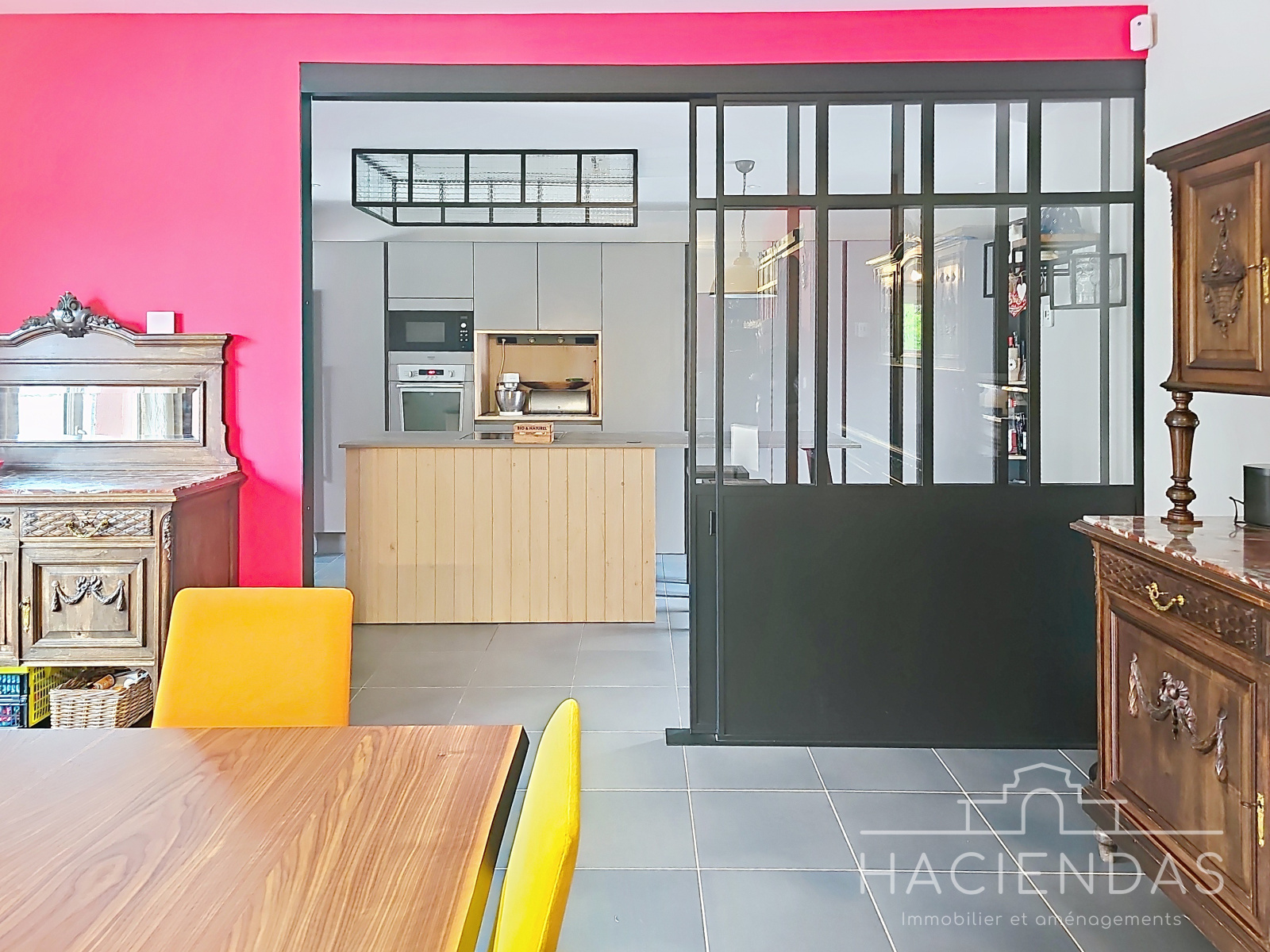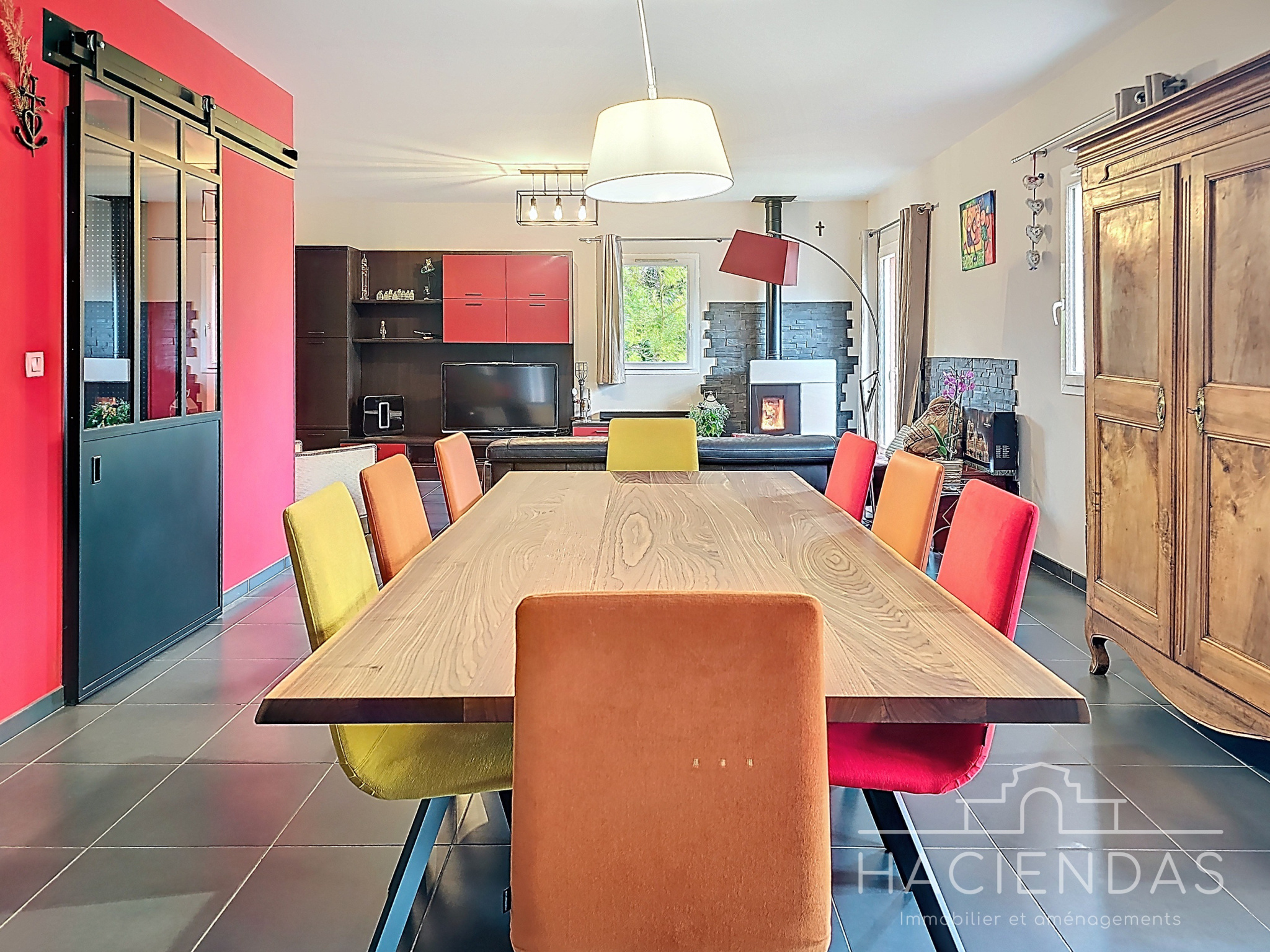L’intérieur contemporain s’ouvre sur un vaste séjour double avec poêle, prolongé par une cuisine moderne séparée par une élégante verrière atelier, donnant accès à un bureau et une buanderie.