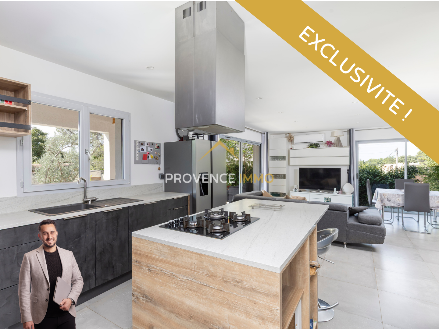 Pièce de vie lumineuse avec cuisine ouverte