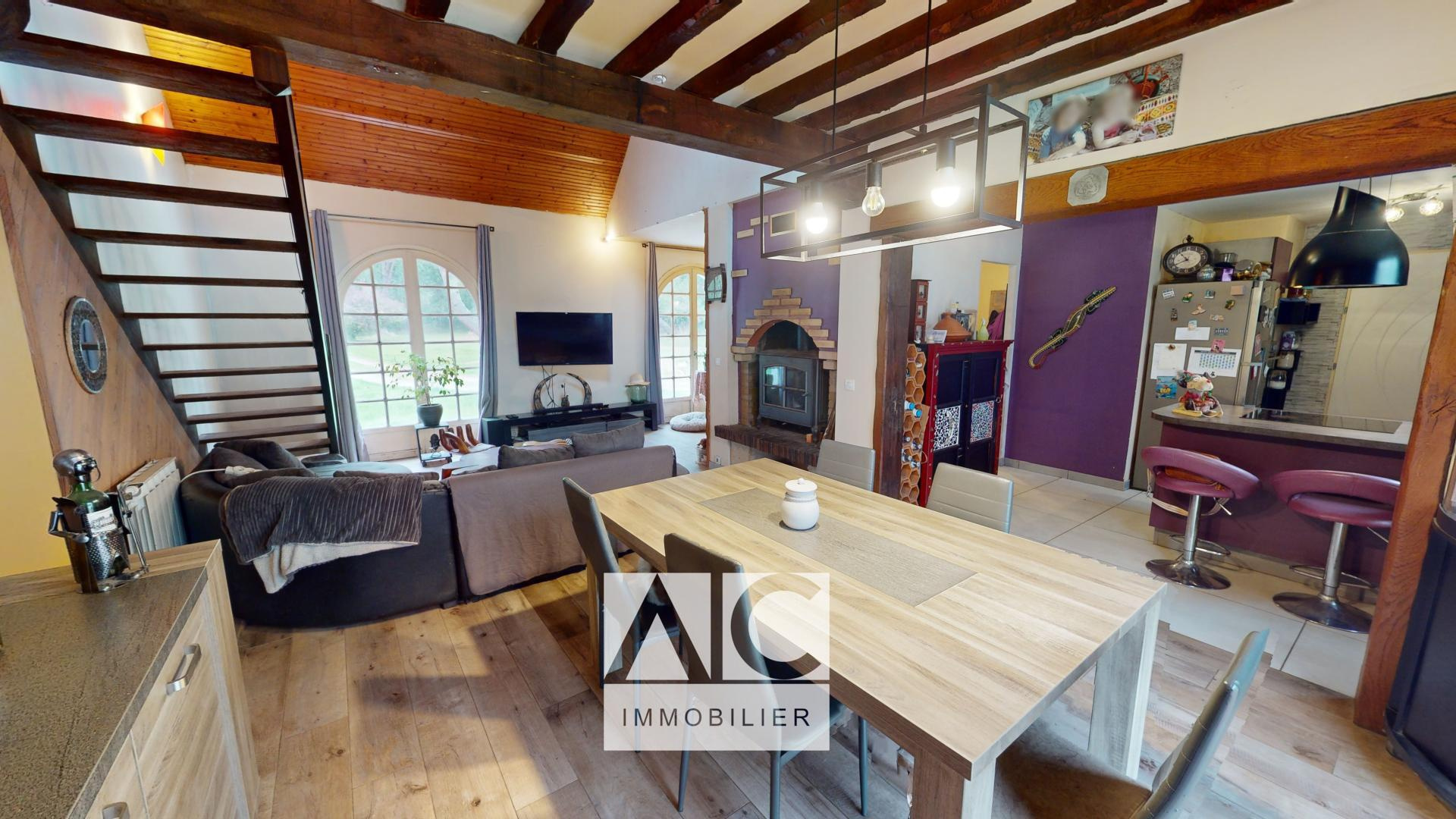 REZ-DE-CHAUSSÉE : Entrée / Cuisine ouverte avec accès garage / Salon-séjour avec poêle à bois central / Chambre / Salle de bains / Salle d'eau avec WC / Véranda (30m2).
