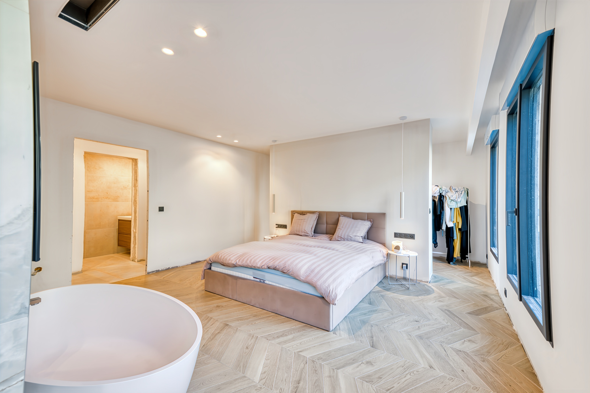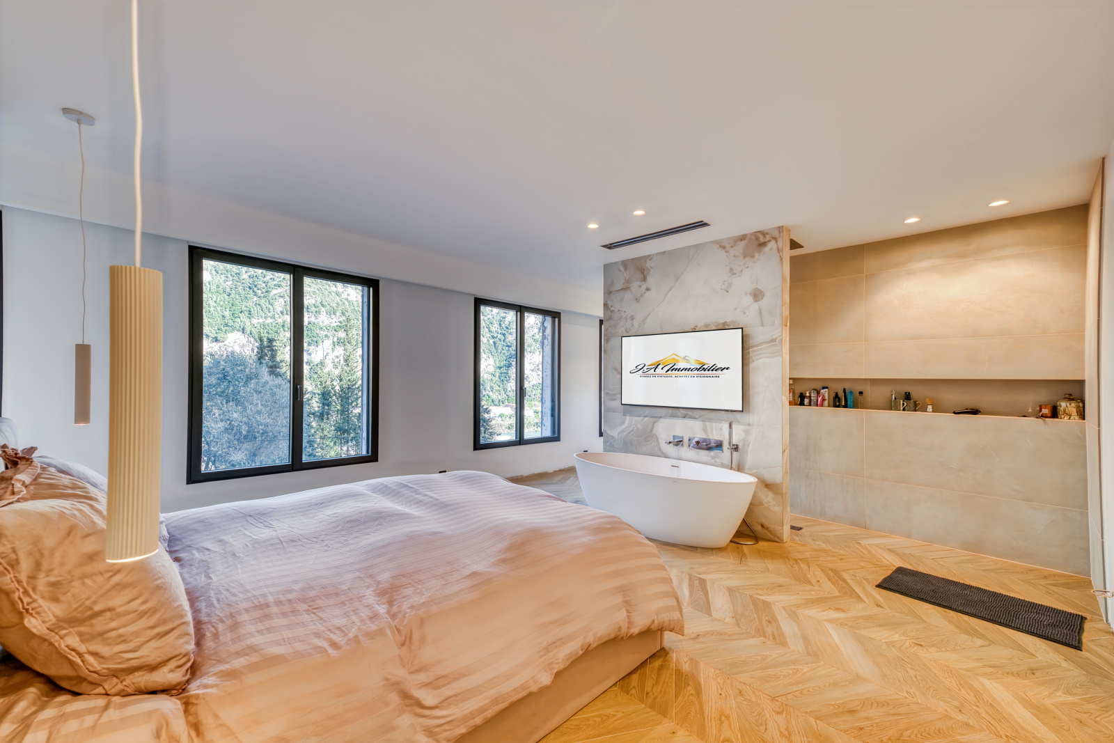 L’espace nuit se compose de 3 suites avec salle d’eau privative, dont une suite principale avec dressing, douche à l’italienne et baignoire.